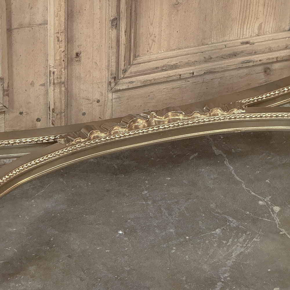Antique French Louis XVI Giltwood Demilune Console with Carrara Marble is a masterpiece of elegance that will provide the perfect accent to any entryway, hallway or landing. Hand-carved with full coverage foliate spray motifs in bas relief across the entire apron, it features extended plinth blocks over each leg that are enhanced with rectangular acanthus rosettes. The blocks anchor the elegantly carved, tapered & fluted legs which are joined together again below with gracefully bowed stretchers that are also carved with ribbon and egg & dart trim. To top off the work, luxurious Carrara marble has been chosen that has been contoured to follow the support below then given a cove bevel for the perfect finishing touch.