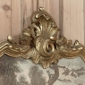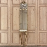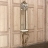 Antique French Louis XVI Giltwood Marble Top Console with Trumeau Mirror is a graceful way to adorn an entryway, hall or stairwell landing! Consisting of a demilune marble top console below and a tall trumeau with generously sized mirror above, it comes in two parts with easily removable marble for transportation ease. A romantic sepia appears at the top, surrounded by stylized shell motifs and a finely sculpted framework, which extends down around the generously sized mirror. The trumeau is designed to rest on the beveled marble, which is supported in turn by the demilune framework designed to be mounted to the wall and supported by two elegantly scrolled cabriole legs. The gold finish highlights the carved detailing on the mirror, and especially the shell, floral and folaites on the apron and legs below.