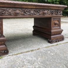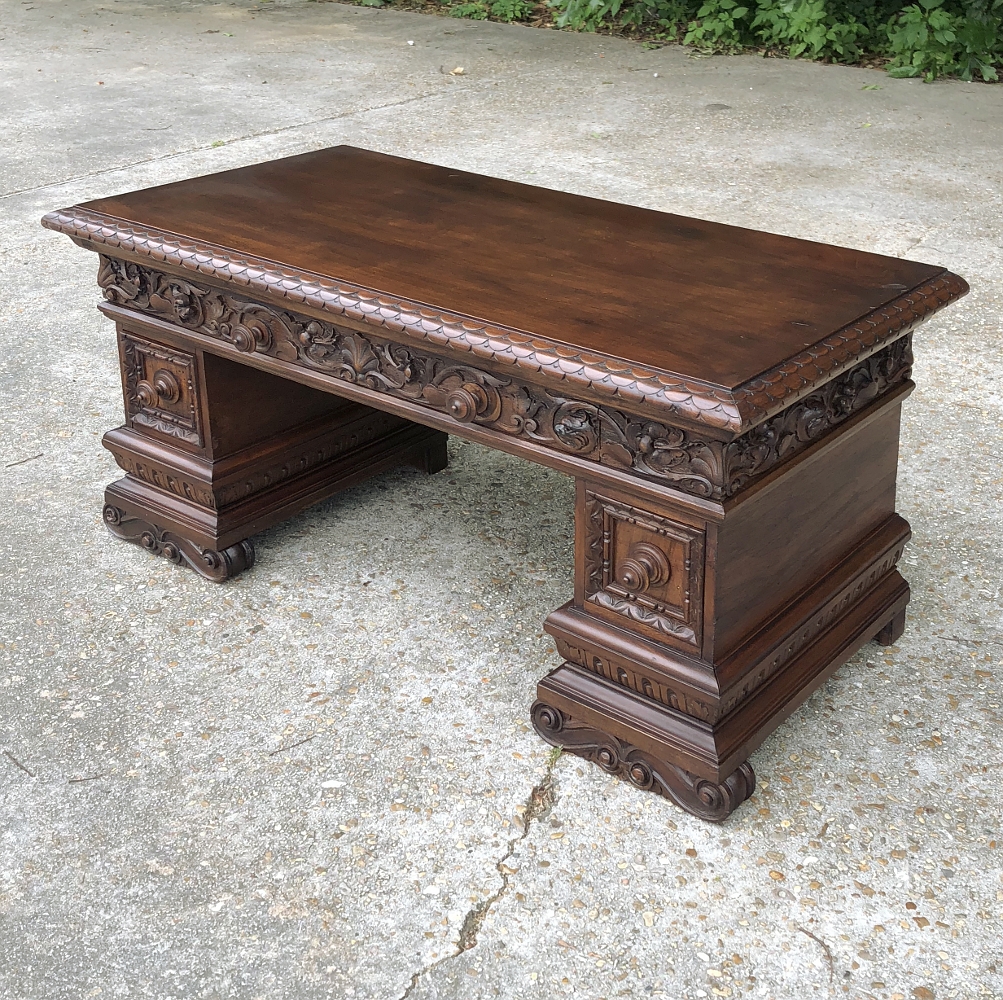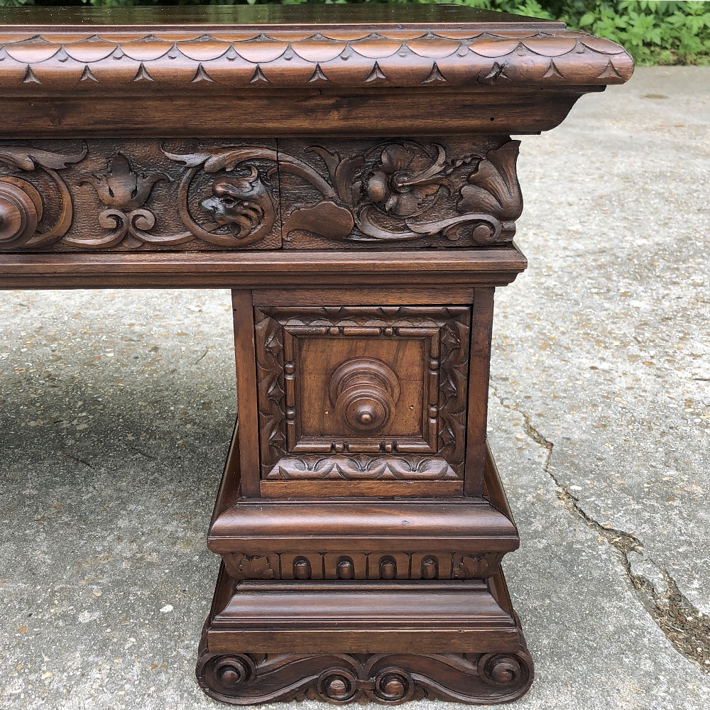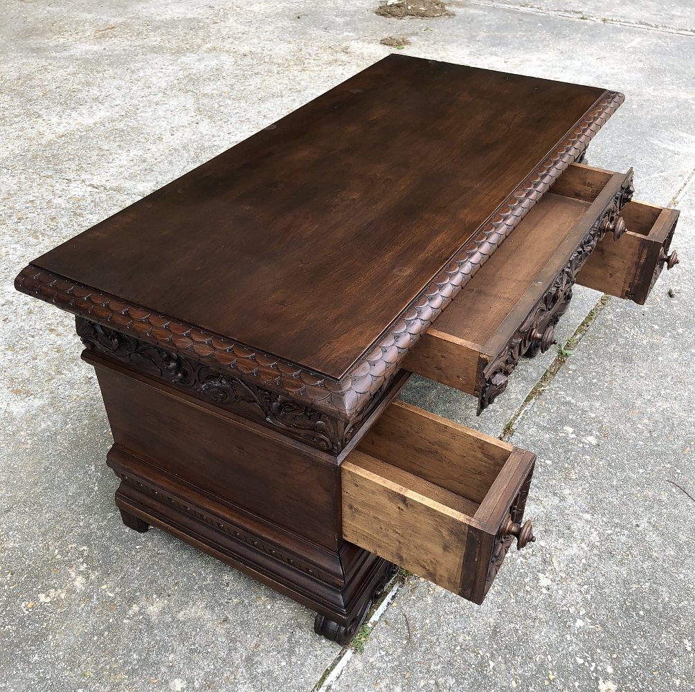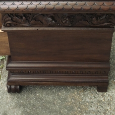 Antique Italian Baroque Walnut Credenza ~ Console was designed to grace any room in the home or office and features bold molding detail around the book matched walnut panels of the pediment supports which houses three drawers in total, all bearing homage to its intrinsic natural beauty! This piece can serve in the dining room, game room, or bedroom with equal aplomb. Carved feet complement the exquisitely sculpted bas relief across the entire drawer facade at the top for added visual appeal.
