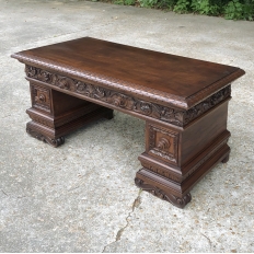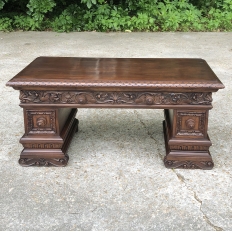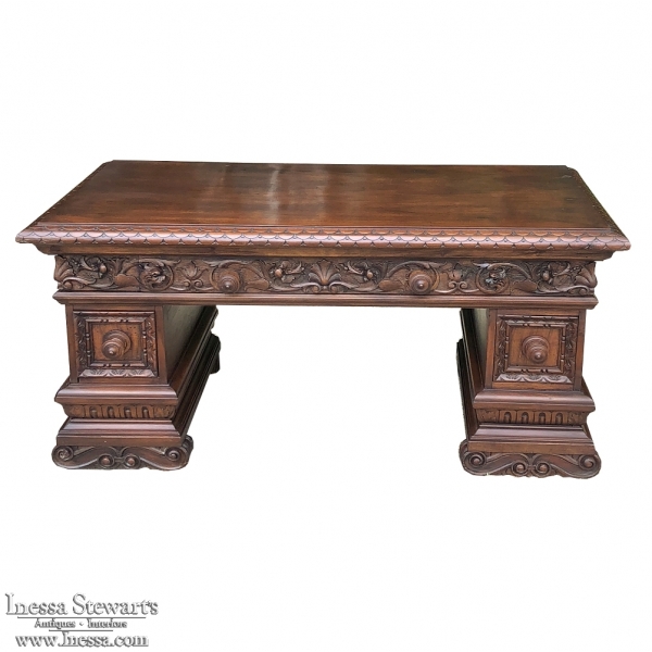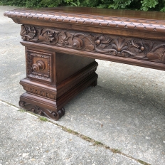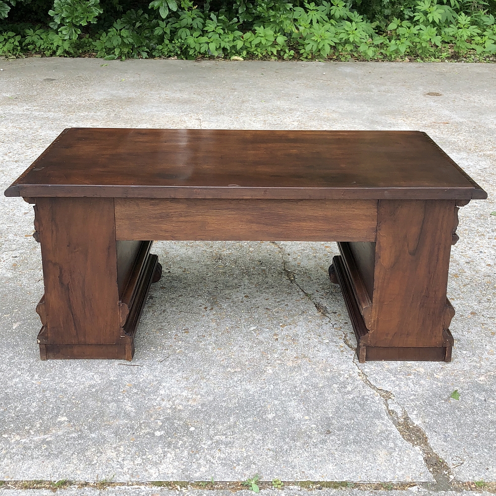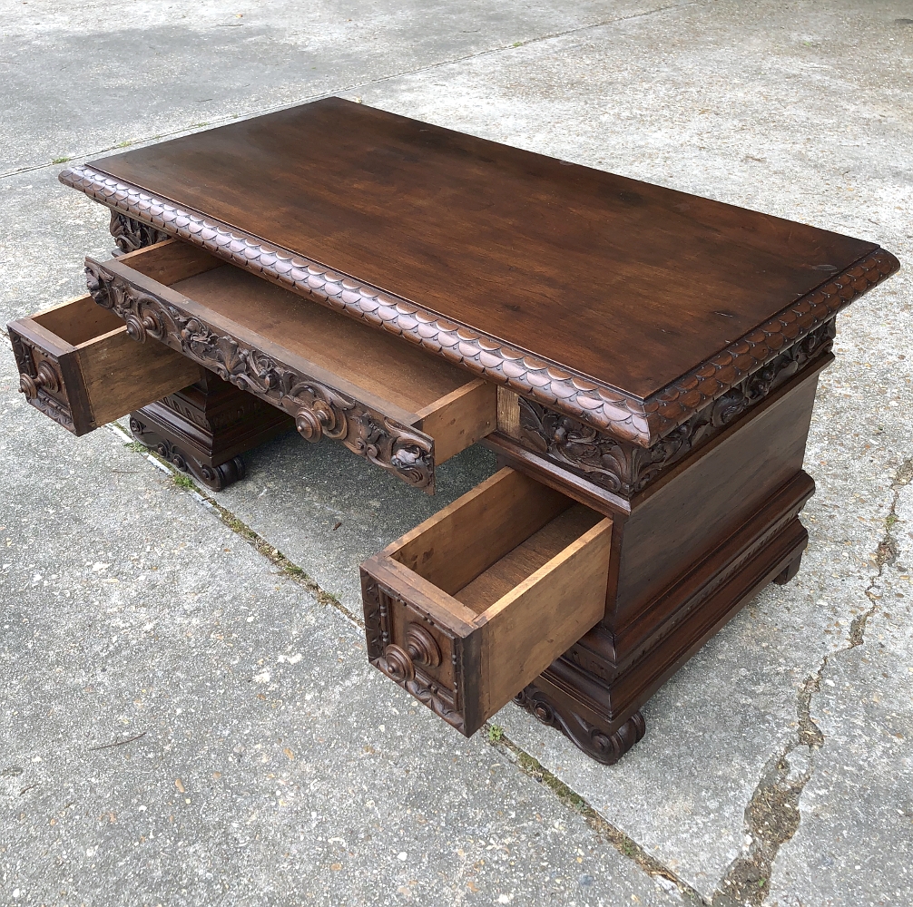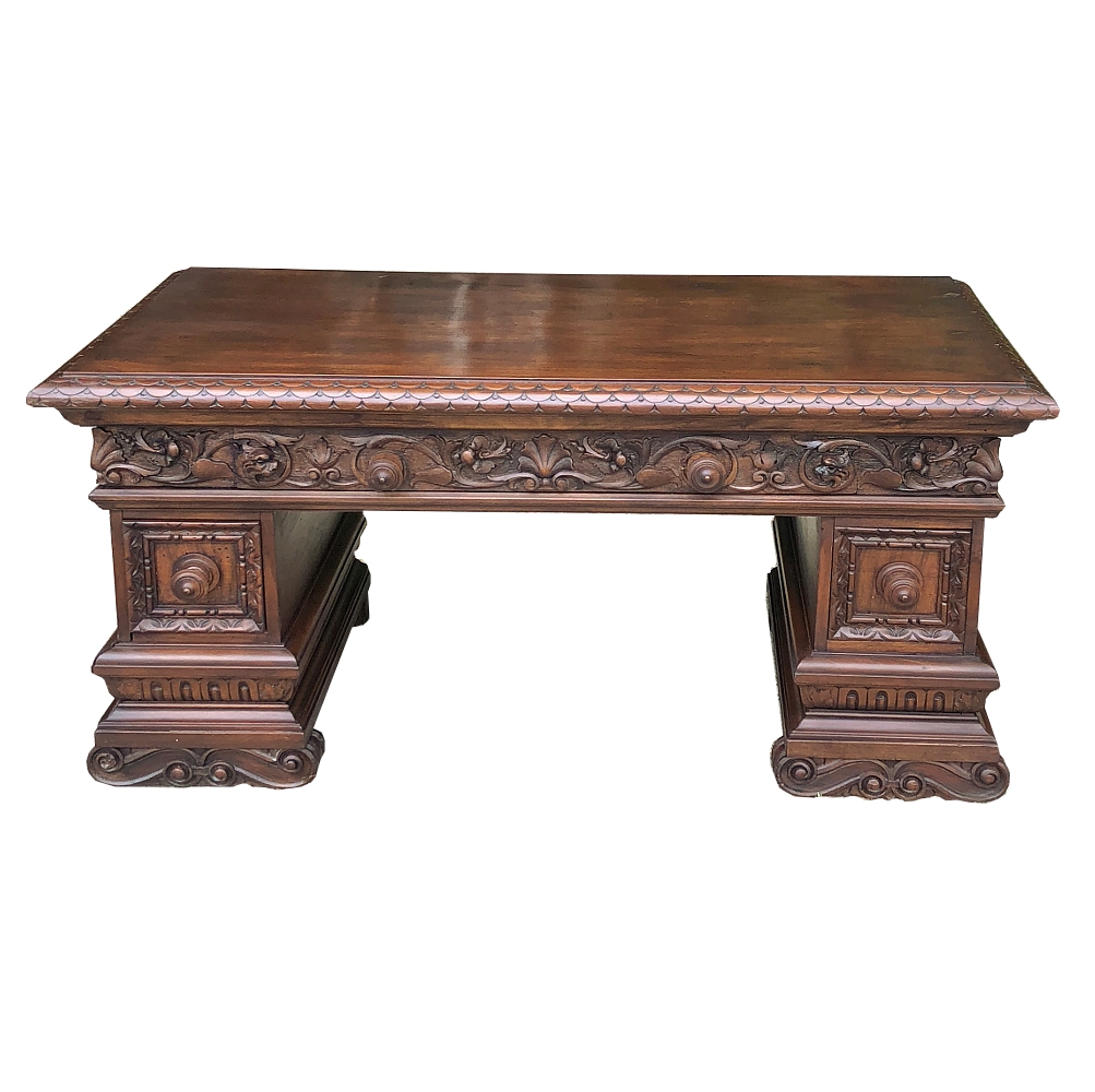 Antique Italian Baroque Walnut Credenza ~ Console was designed to grace any room in the home or office and features bold molding detail around the book matched walnut panels of the pediment supports which houses three drawers in total, all bearing homage to its intrinsic natural beauty! This piece can serve in the dining room, game room, or bedroom with equal aplomb. Carved feet complement the exquisitely sculpted bas relief across the entire drawer facade at the top for added visual appeal.