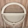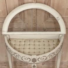 Antique Italian Neoclassical Painted Demilune Display Console is a truly special find!  Ideal for entryways, hallways, landings, niches or even behind a chair or sofa, it combines the architectural surface of a console with a curio display cabinet, all packaged in a celebration of the classical design form that originated in ancient Greece and Rome!  Three elegant tapered legs provide support, so it does not have to be mounted to a wall like some consoles.  Each leg is enhanced with carved bell flowers painted in a patinaed gold to contrast against the antique off-white primary color.  The apron has been treated to the same color enhancement, but displays beautiful foliate scrollwork with an oval rosette at the center appearing over the front leg.  The top is hinged and fitted with glass providing an excellent surface that is also transparent so a small collection or keepsakes can be displayed within atop the tufted liner which is removable.  The distressed painted finish only adds to the classic allure!