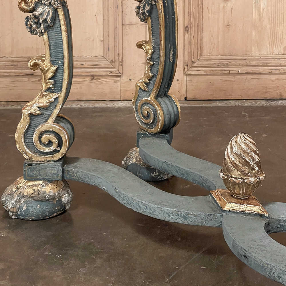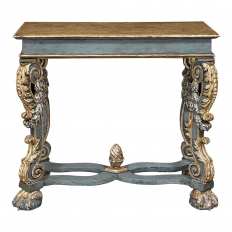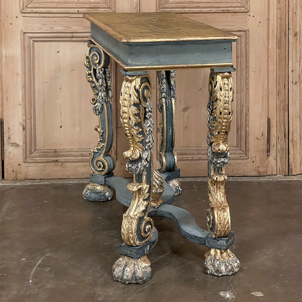Early 19th Century Italian Baroque Faux-Sienna Marble Console hails from Florence, whose rich history in art and architecture spans centuries. Some of the world's most famous figures and styles have originated or been inspired by the city. The Baroque style that swept Europe and then the world was manifested in the Tuscan hills as well. The tailored architecture of the top with its plain, simply molded apron, contrasts dramatically with the exuberant acanthus leaf ornamentation embellishing the four boldly scrolled legs. A garland of bell flowers is depicted embracing each of the upper scrolled works. The legs are connected again below with a double-lyre stretcher centered with a spiral pineapple finial, then supported below by four lions' paw feet. All of the carved detail is enhanced with gold painted accents contrasting against the slate gray finish. As a stunning finishing touch, the top was faux painted to depict Sienna marble with luxurious veining. Because of the four-legged design, this table works in an entryway, hallway, behind the sofa, or wherever you desire.