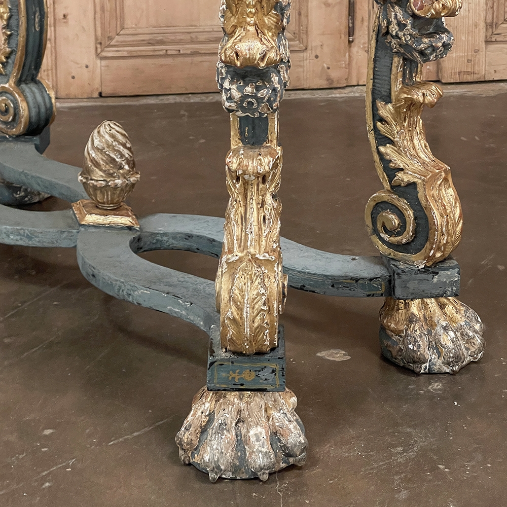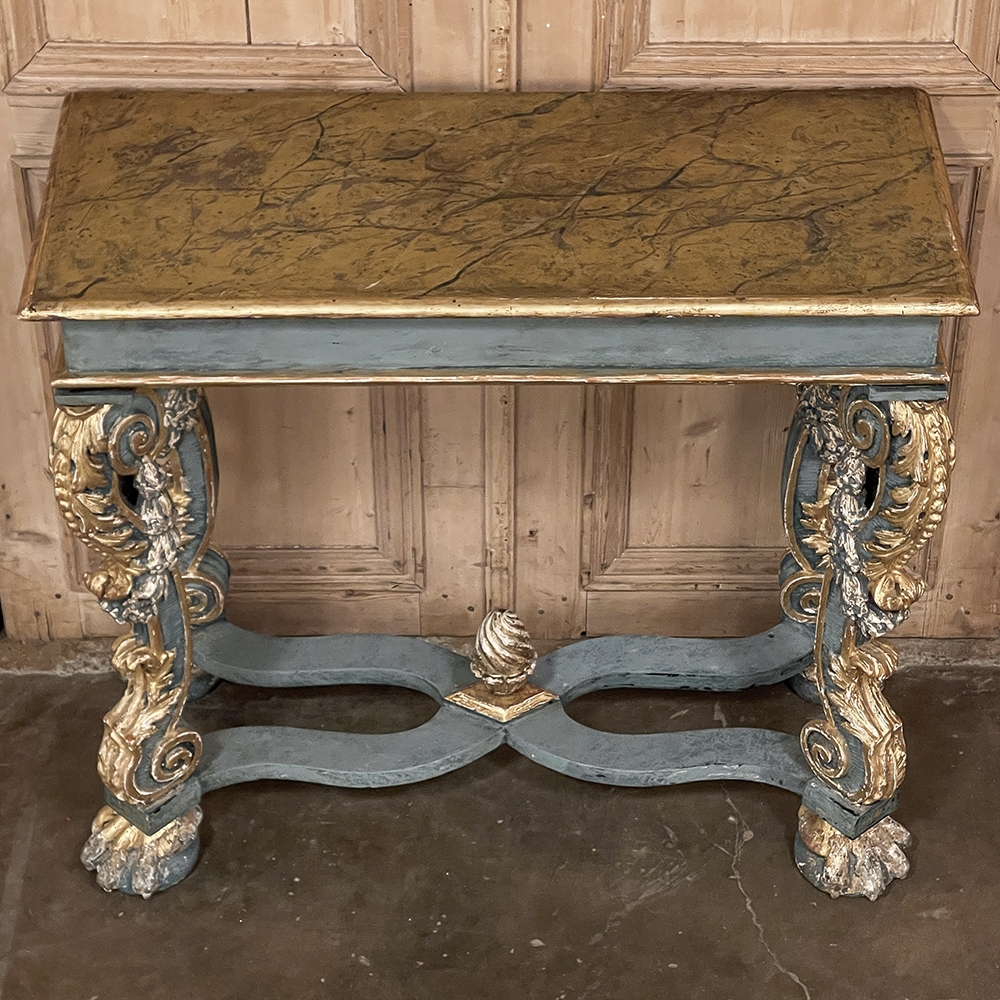 Early 19th Century Italian Baroque Faux-Sienna Marble Console hails from Florence, whose rich history in art and architecture spans centuries. Some of the world's most famous figures and styles have originated or been inspired by the city. The Baroque style that swept Europe and then the world was manifested in the Tuscan hills as well. The tailored architecture of the top with its plain, simply molded apron, contrasts dramatically with the exuberant acanthus leaf ornamentation embellishing the four boldly scrolled legs. A garland of bell flowers is depicted embracing each of the upper scrolled works. The legs are connected again below with a double-lyre stretcher centered with a spiral pineapple finial, then supported below by four lions' paw feet. All of the carved detail is enhanced with gold painted accents contrasting against the slate gray finish. As a stunning finishing touch, the top was faux painted to depict Sienna marble with luxurious veining. Because of the four-legged design, this table works in an entryway, hallway, behind the sofa, or wherever you desire.