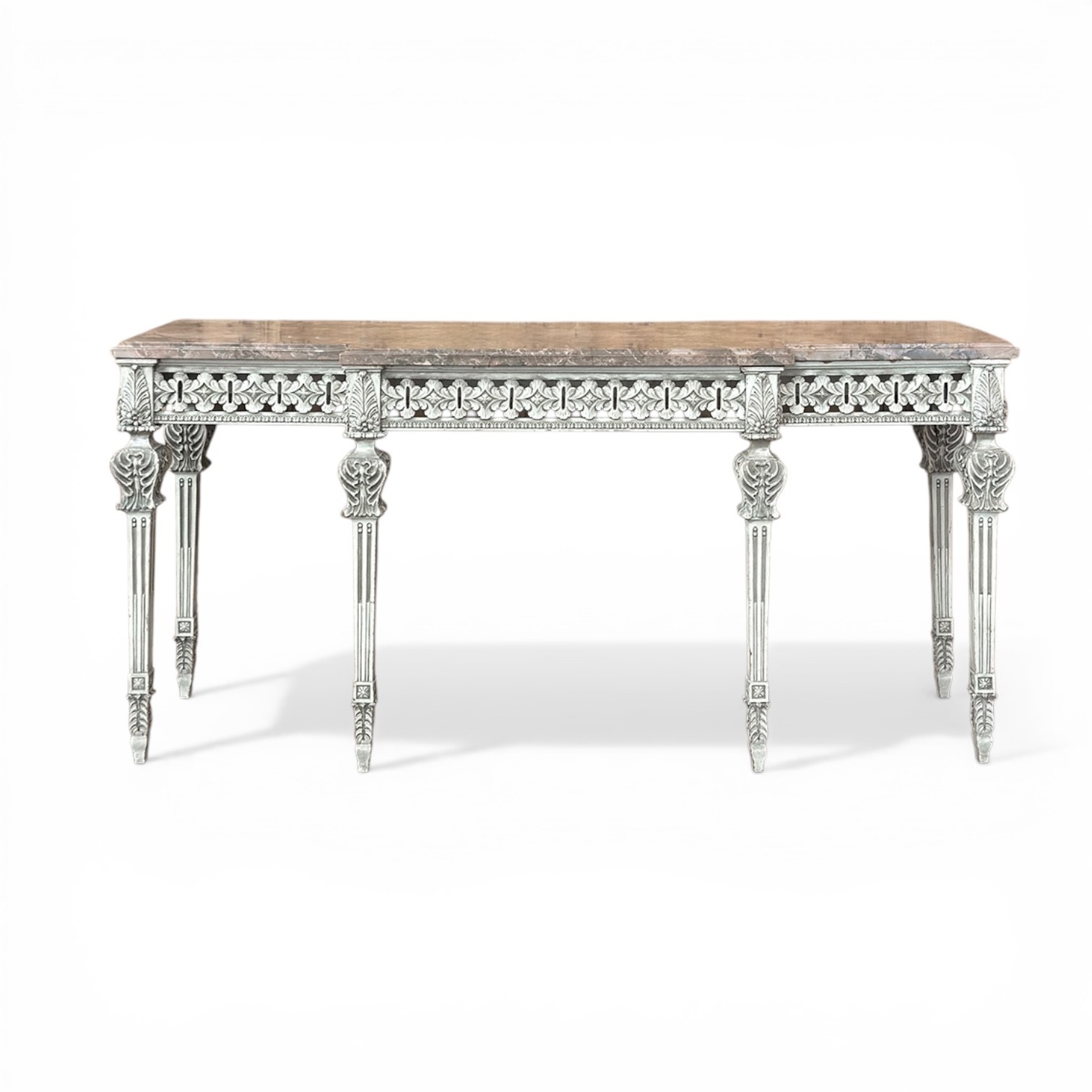 The console stands on beautifully carved, elegantly proportioned legs, fluted in the neoclassical tradition and adorned with sculptural acanthus leaf carvings at the knees. The carving is crisp and expressive, adding depth and refinement while remaining balanced and harmonious with the overall design.