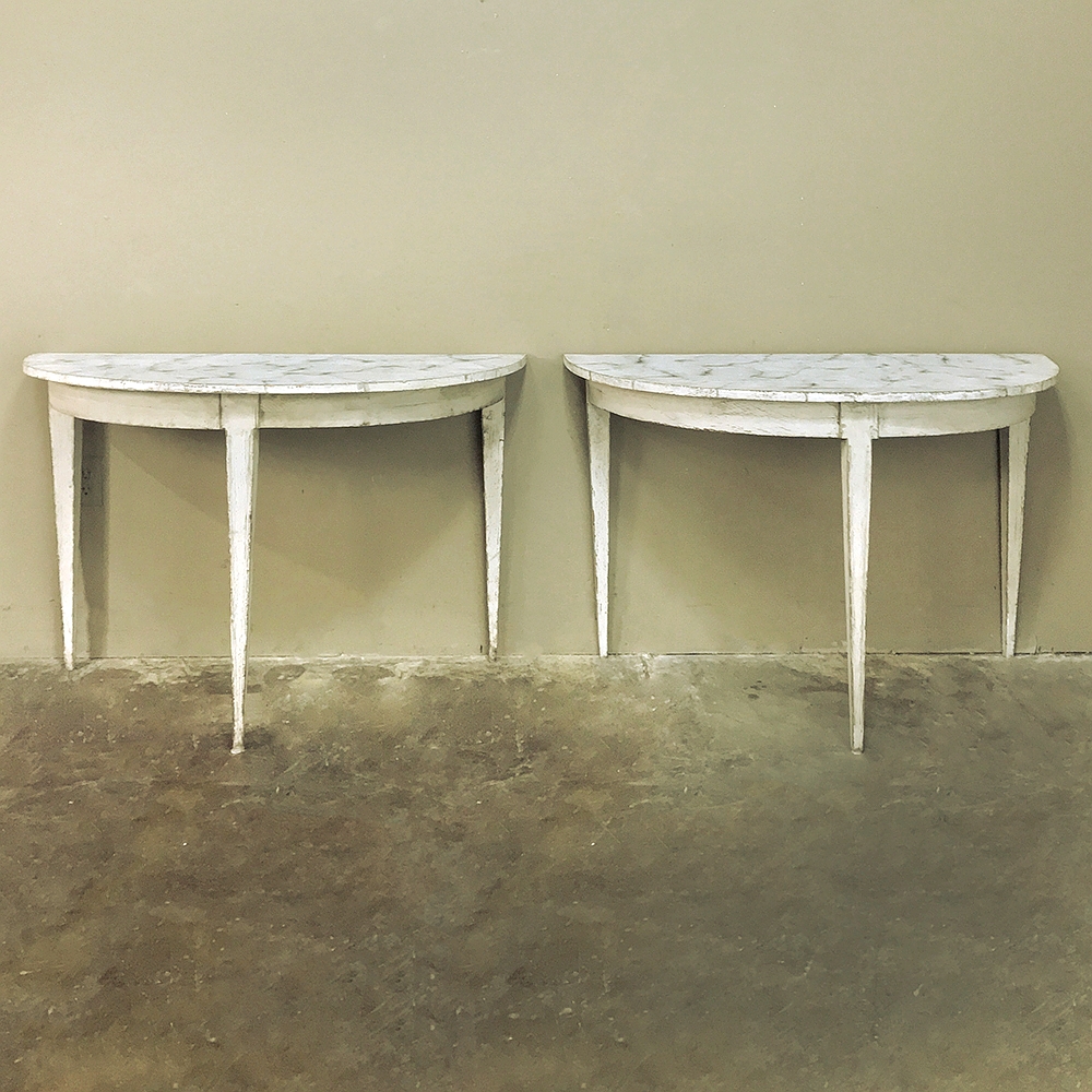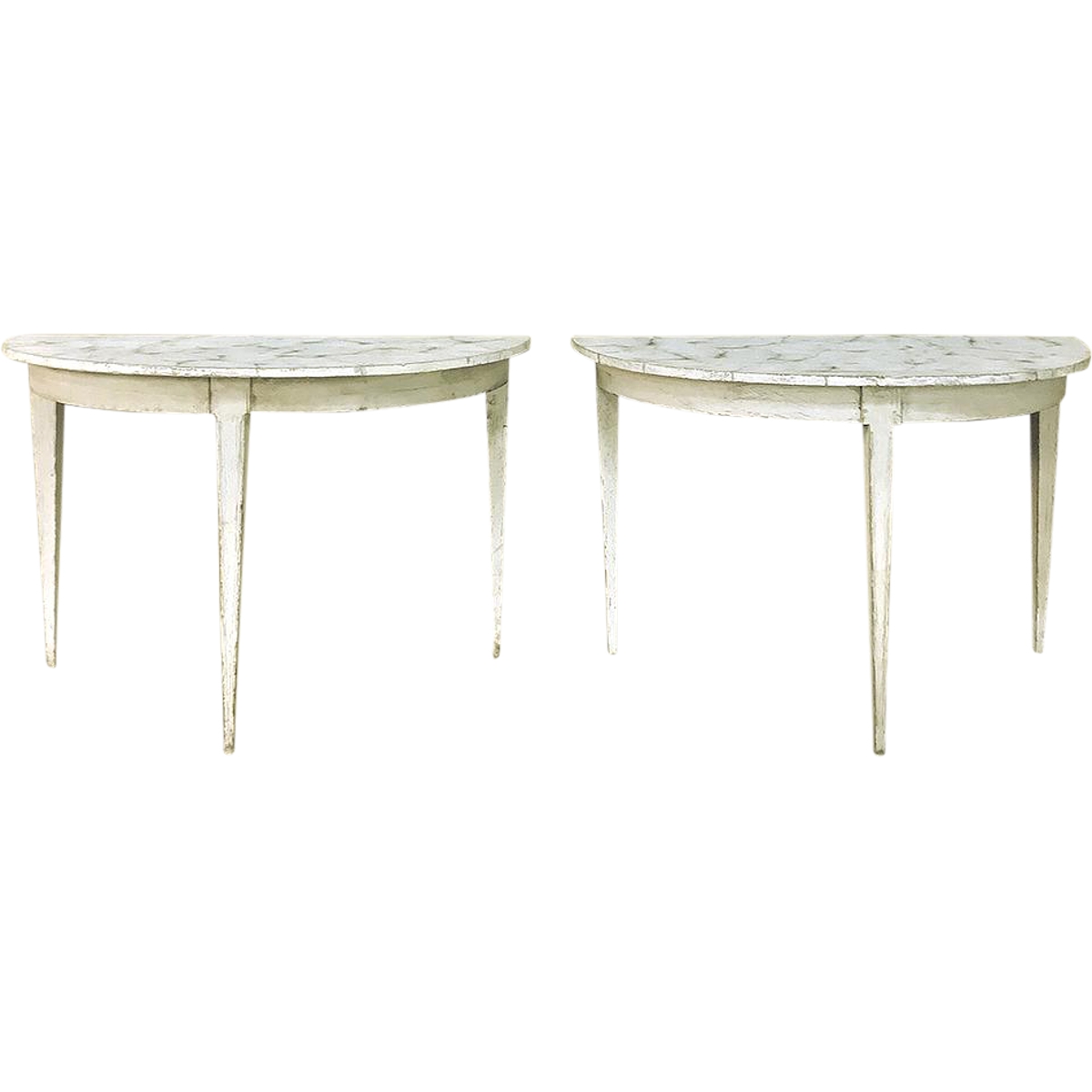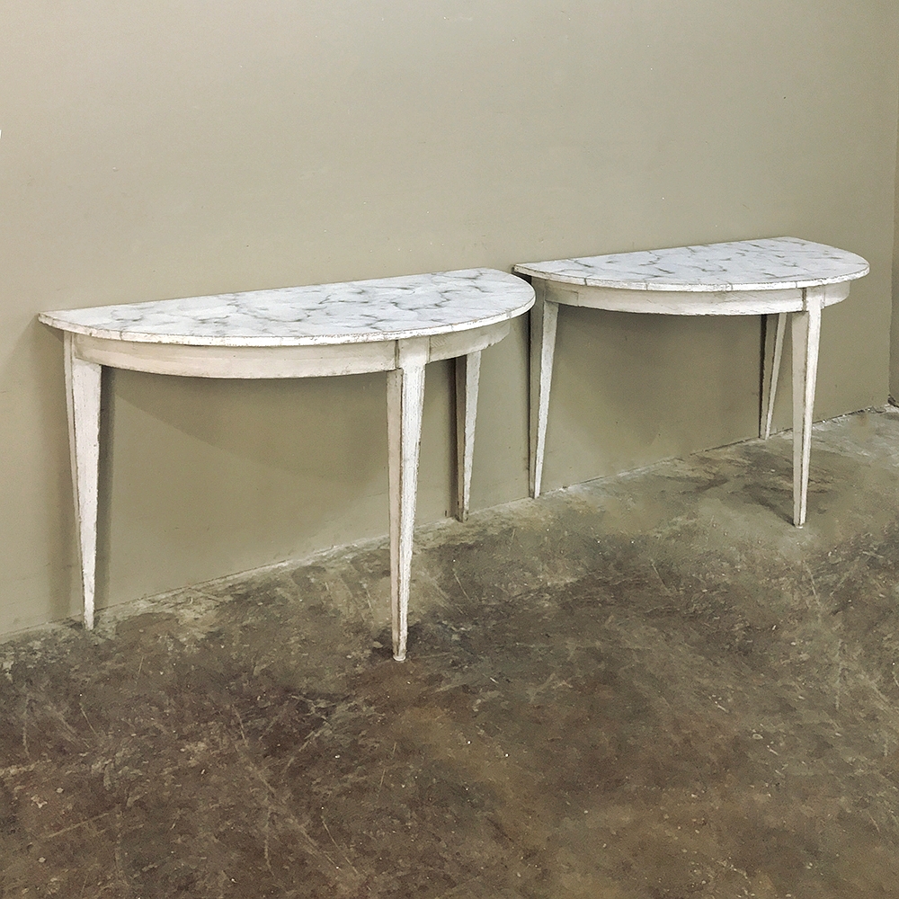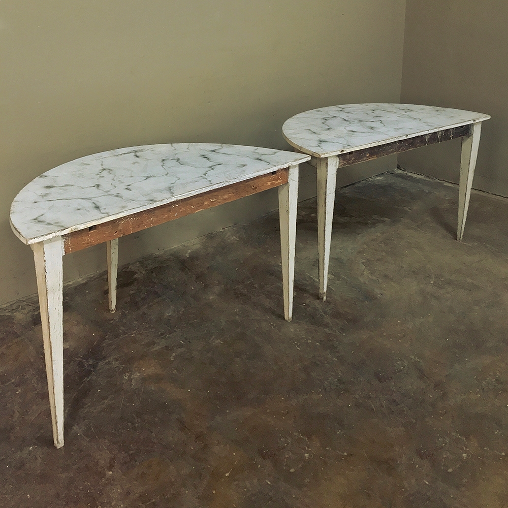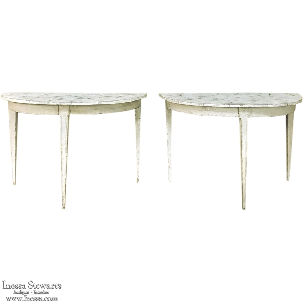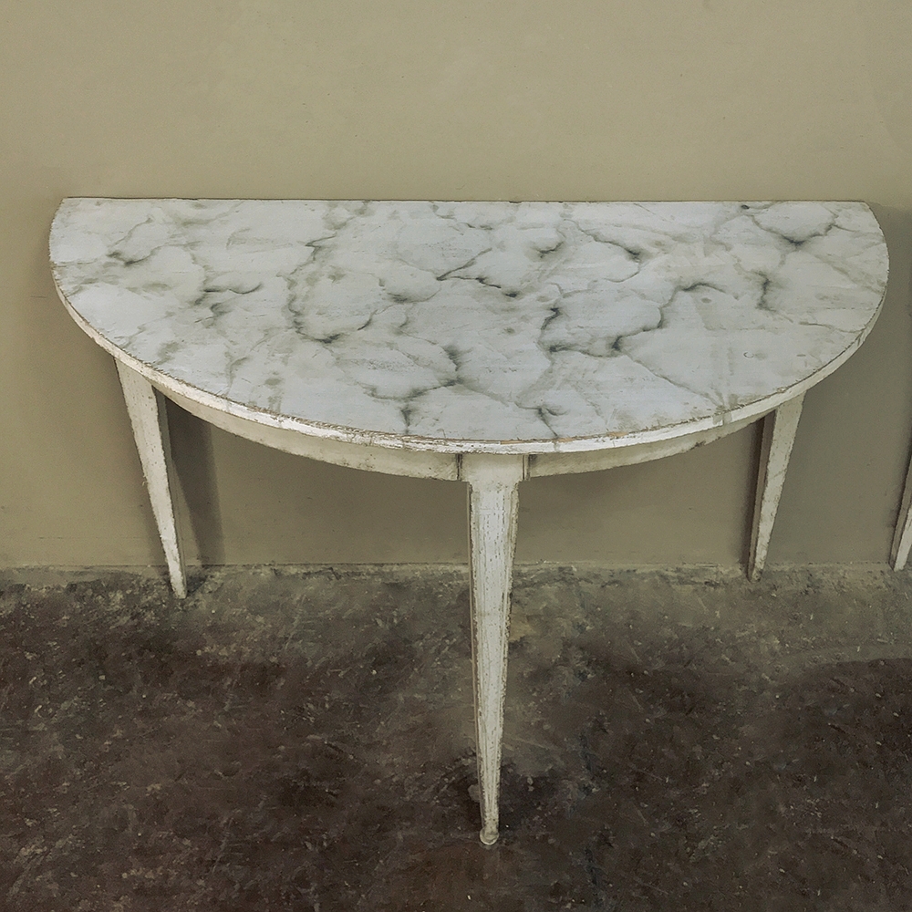 SalePair 19th Century Swedish Demilune Painted Consoles are perfect for adding symmetry to any room, and features tailored rectilinear architecture reminiscent of the neoclassic movement. Each console is supported by three tapered legs, and features a patinaed painted finish including a faux marble effect painted on the half-moon shaped top surfaces. Because each is supported by three legs, the design does not have to be physically mounted to the wall, making them very versatile and easy to move about the room as one's design whimsies can be explored. Put the two back to back, and create a great little game table or breakfast table, increasing the pair's versatility even more!