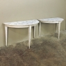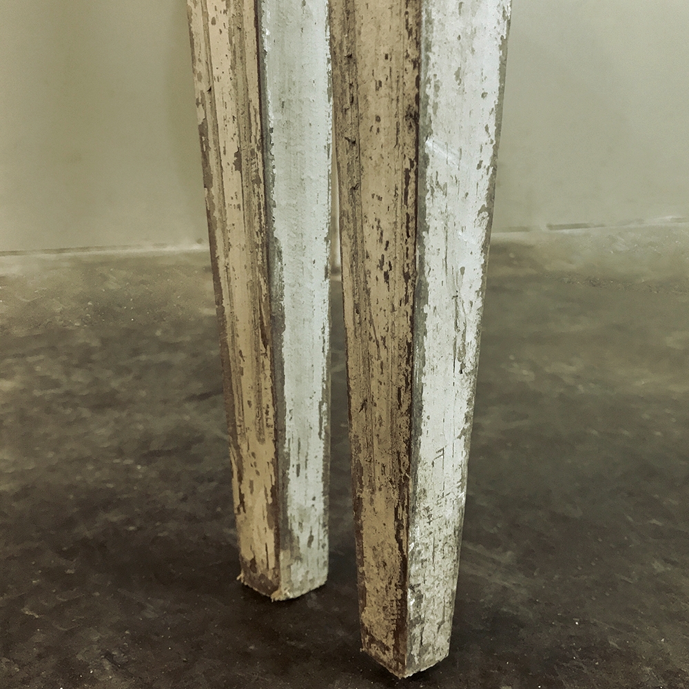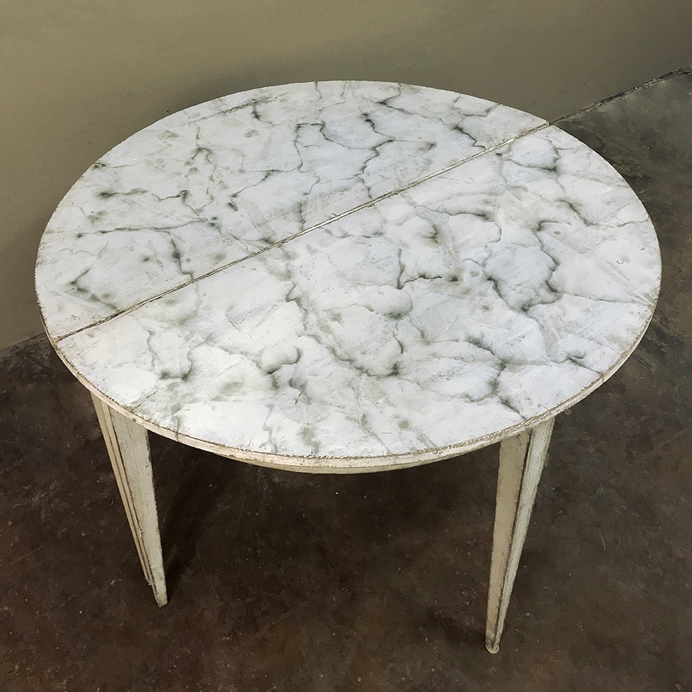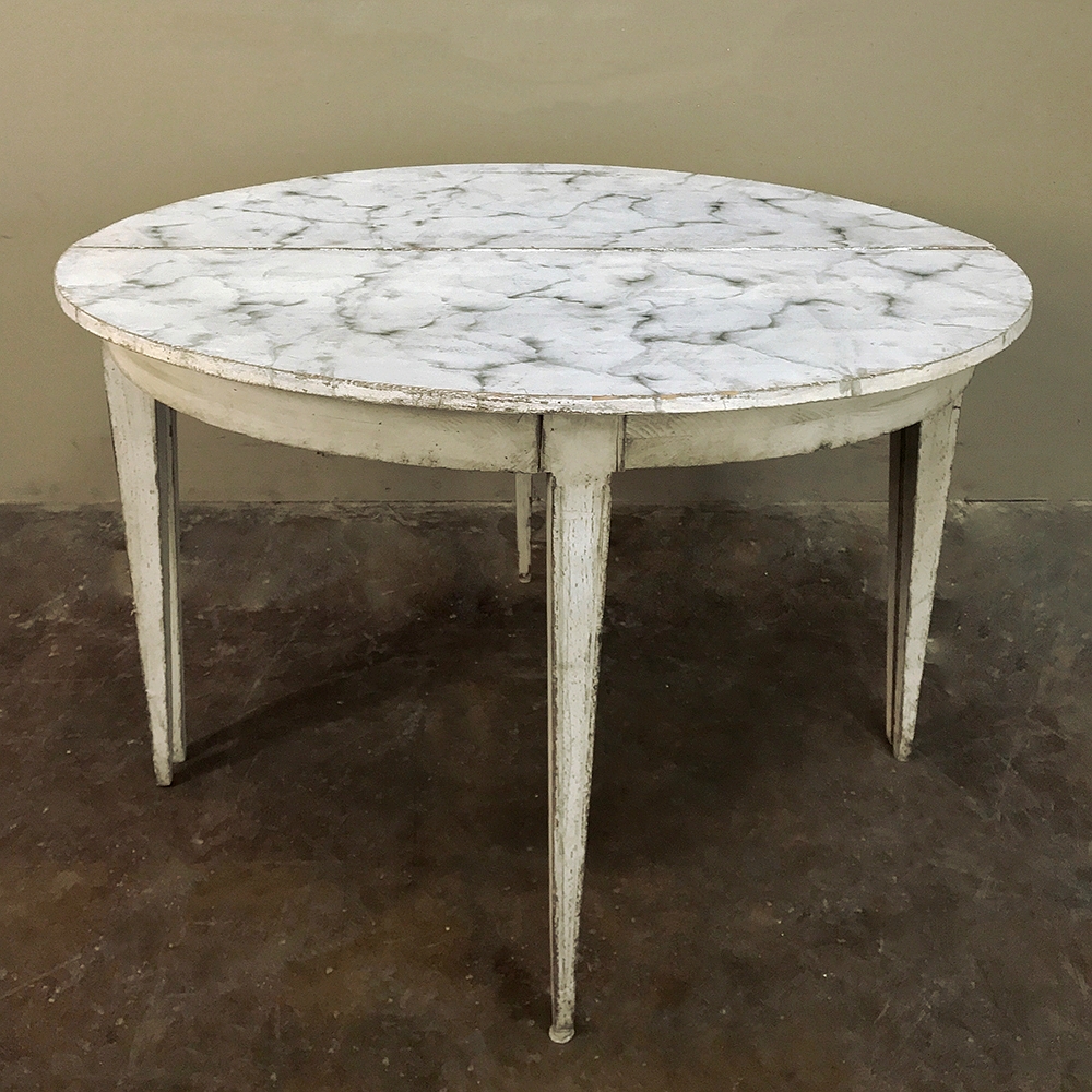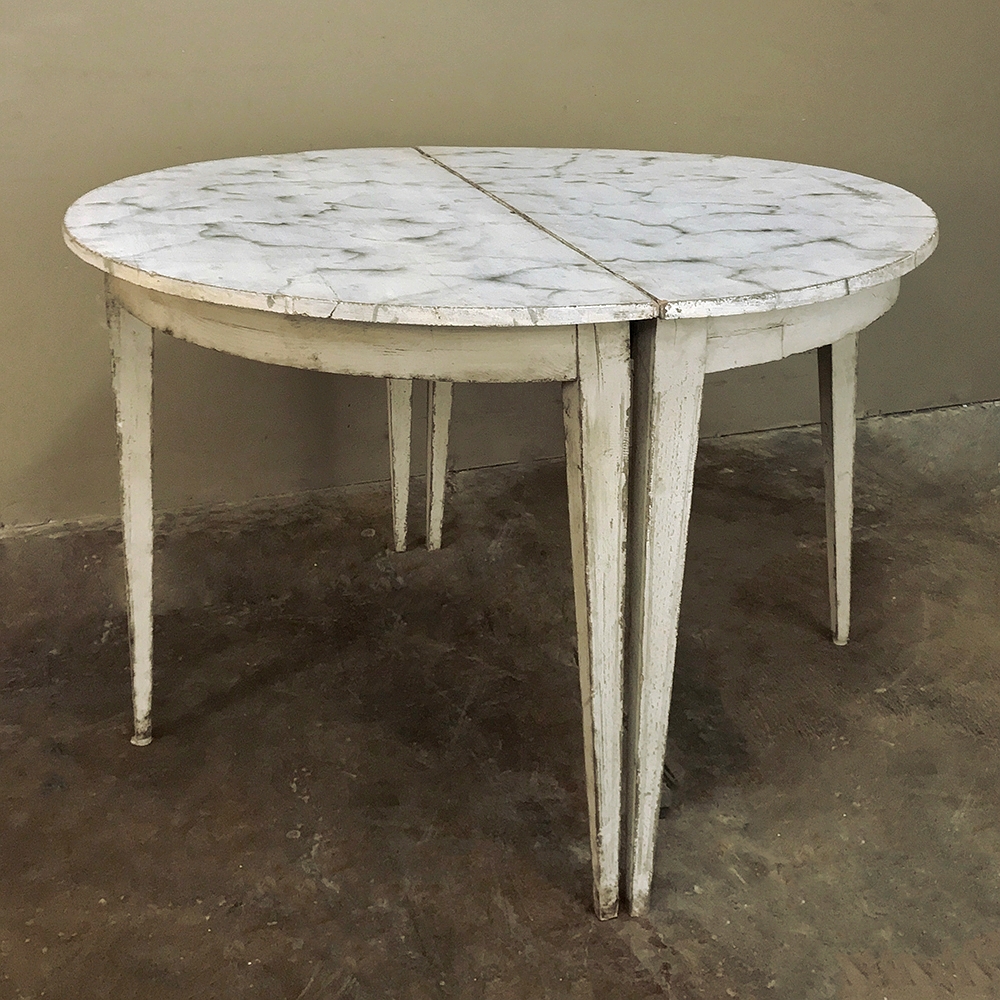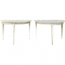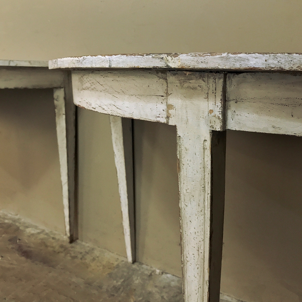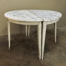 SalePair 19th Century Swedish Demilune Painted Consoles are perfect for adding symmetry to any room, and features tailored rectilinear architecture reminiscent of the neoclassic movement. Each console is supported by three tapered legs, and features a patinaed painted finish including a faux marble effect painted on the half-moon shaped top surfaces. Because each is supported by three legs, the design does not have to be physically mounted to the wall, making them very versatile and easy to move about the room as one's design whimsies can be explored. Put the two back to back, and create a great little game table or breakfast table, increasing the pair's versatility even more!