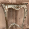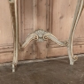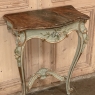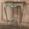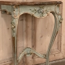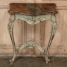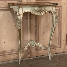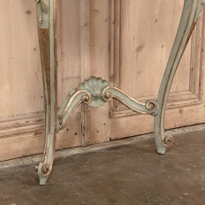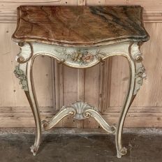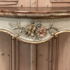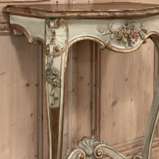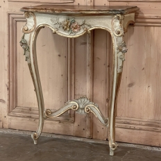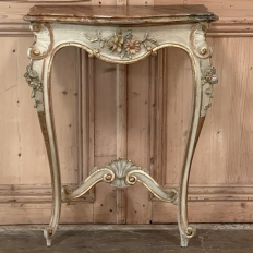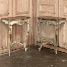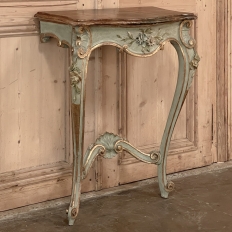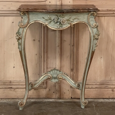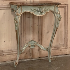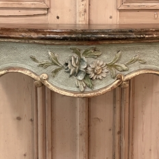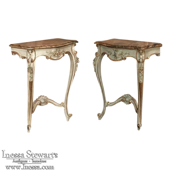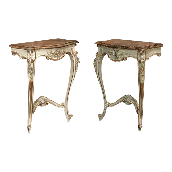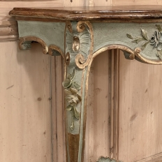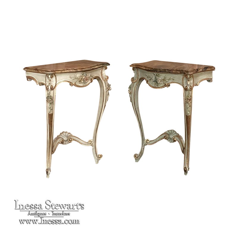 Pair Antique Italian Hand-Painted Consoles were sculpted in the Rococo style, and feature graceful cabriole legs connected with arched stretchers, all of which are carved with shell and floral designs. The contoured apron features a relief carving of a floral spray, and subtle painted accents including gold trim enhance the carved detail to a wonderful degree. Of particular note, however, are the faux marble painted tops! One has to look closely to determine they're wood, and not real stone... Original hand-painted finish with gold highlights displays two subtly different hues, one more green and the other more beige.