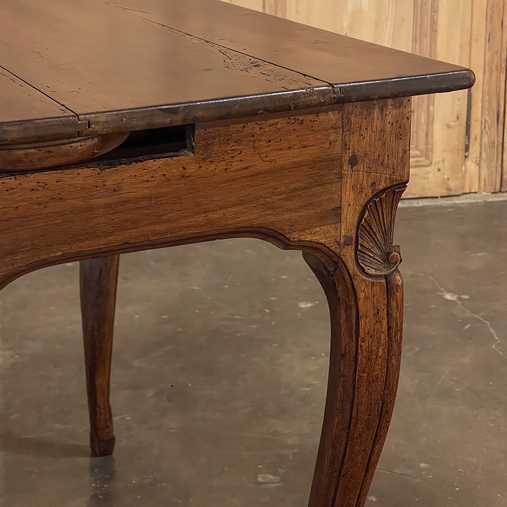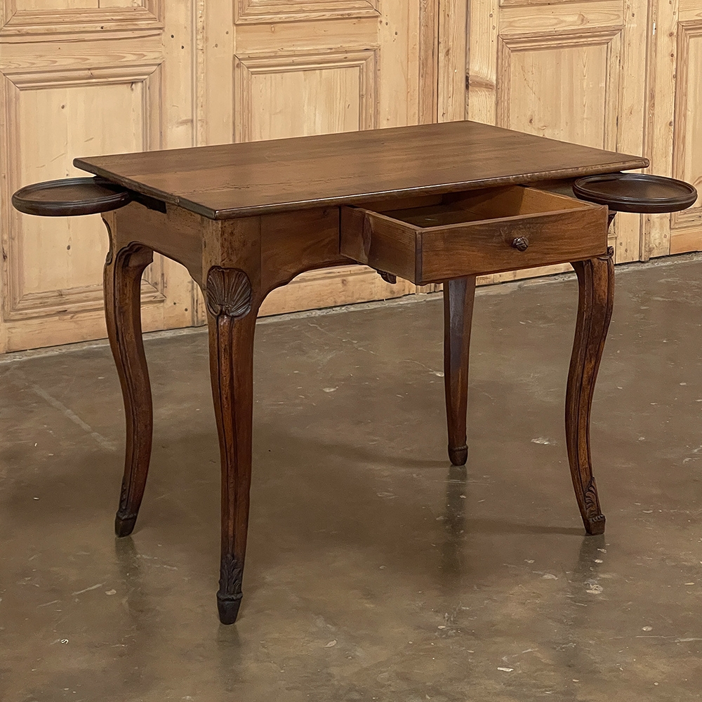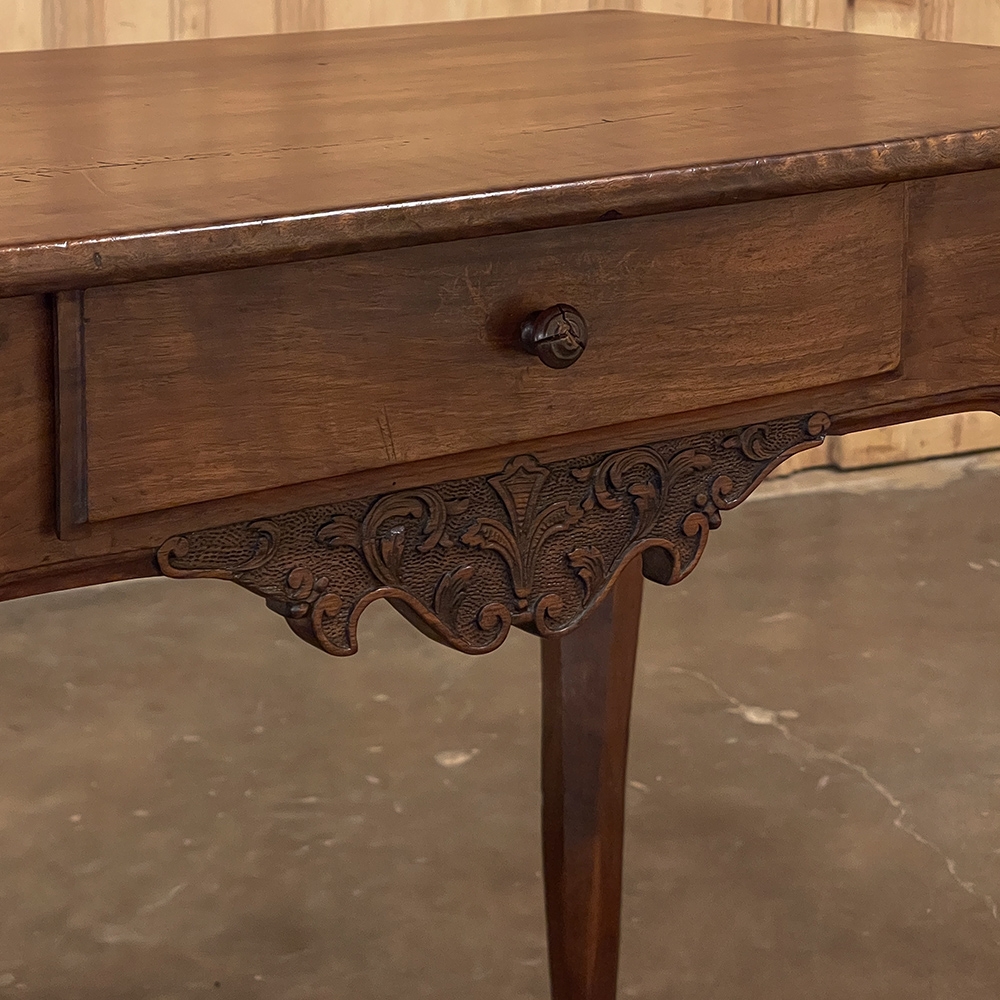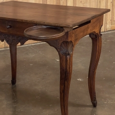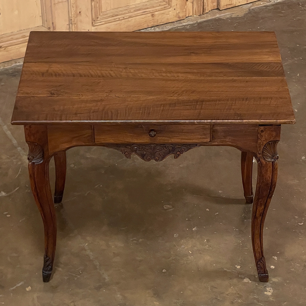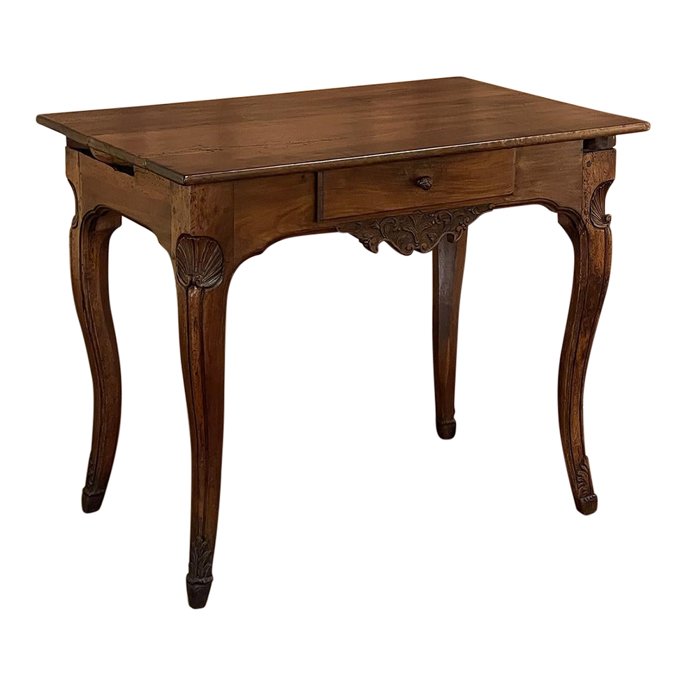 18th Century Country French Writing Table ~ End Table was beautifully hand-crafted from solid indigenous walnut, and features amazing style rendered by capable rural artisans with what was considered then to be innovative techniques. The solid plank top and somewhat tailored aprons all around differ on the side with the drawer, where a relief carving featuring a Florentine-style fleur de lys has been carved surrounded by foliates. Each of the subtly scrolled legs was crafted from a single post of walnut, then carved with bold shell motifs on the shoulders, hoof feet and upturned acanthus plumes. Fastened to the apron with pegged mortise & tenon joinery, the craftsmen added a unique twist ~ a pivoting round drink holder that rotates out when needed, yet tucks back in to return the piece to its regular rectangular geometry. Such features make it a good choice for a two-person game table, a side table, and end table, or just about anything your imagination can conjure!