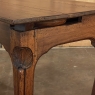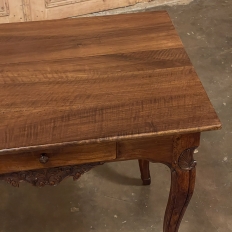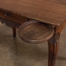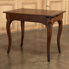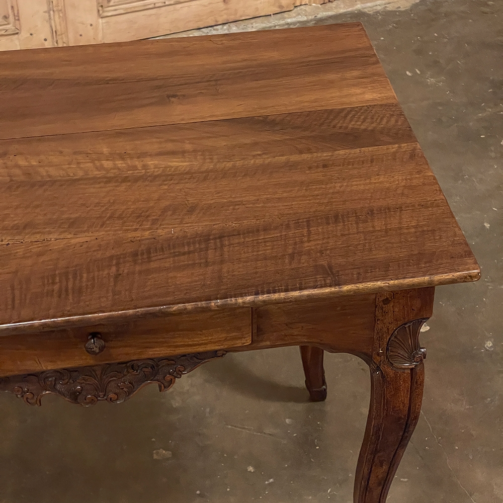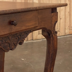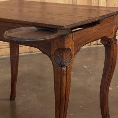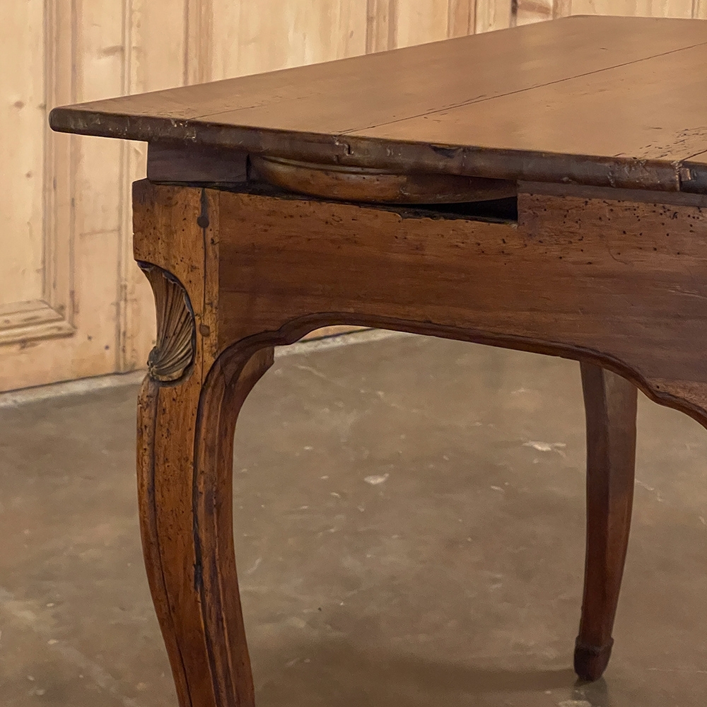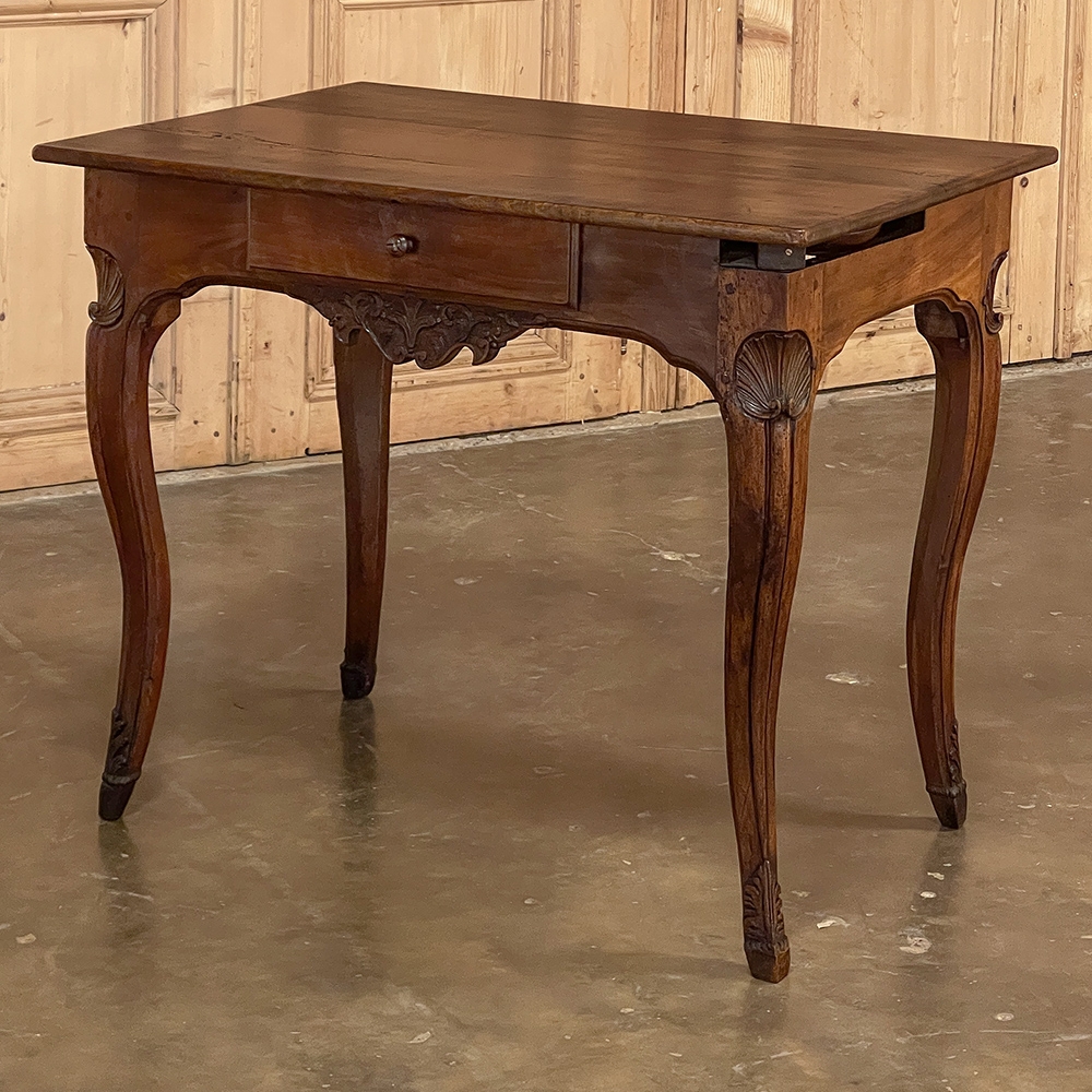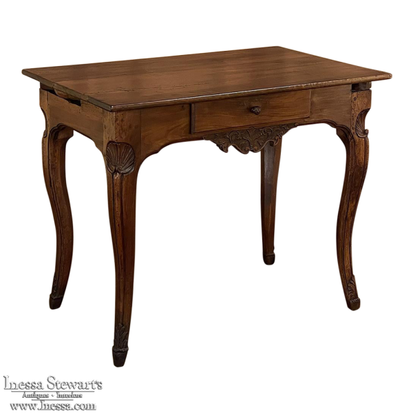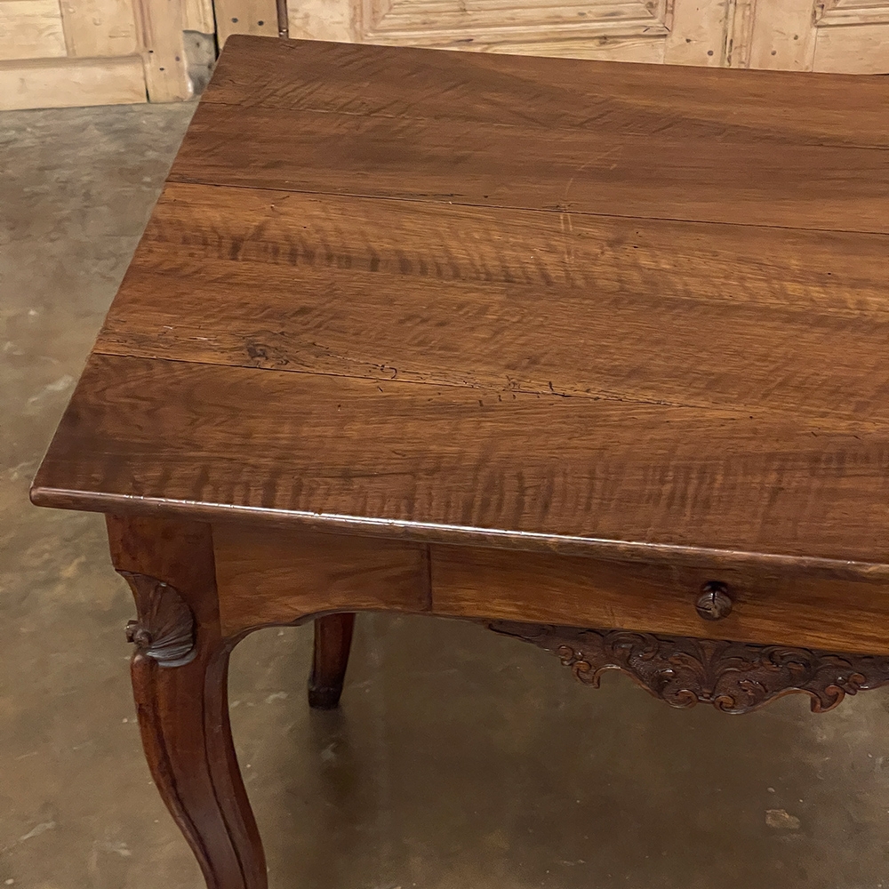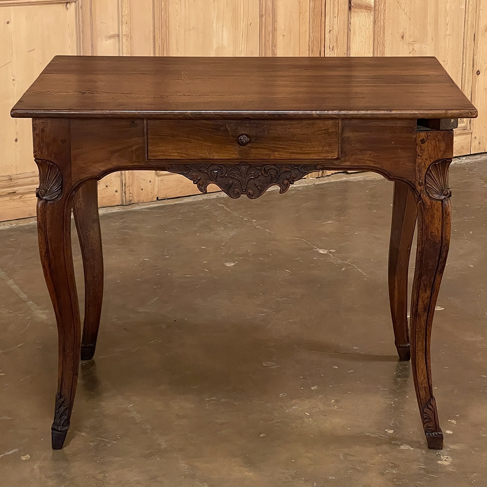 18th Century Country French Writing Table ~ End Table was beautifully hand-crafted from solid indigenous walnut, and features amazing style rendered by capable rural artisans with what was considered then to be innovative techniques. The solid plank top and somewhat tailored aprons all around differ on the side with the drawer, where a relief carving featuring a Florentine-style fleur de lys has been carved surrounded by foliates. Each of the subtly scrolled legs was crafted from a single post of walnut, then carved with bold shell motifs on the shoulders, hoof feet and upturned acanthus plumes. Fastened to the apron with pegged mortise & tenon joinery, the craftsmen added a unique twist ~ a pivoting round drink holder that rotates out when needed, yet tucks back in to return the piece to its regular rectangular geometry. Such features make it a good choice for a two-person game table, a side table, and end table, or just about anything your imagination can conjure!