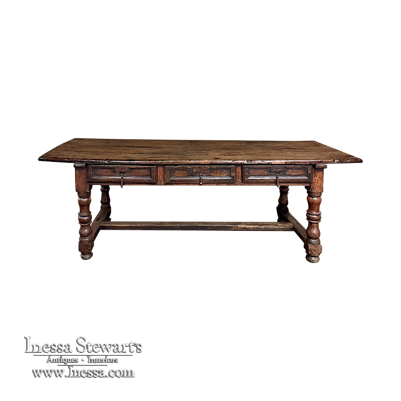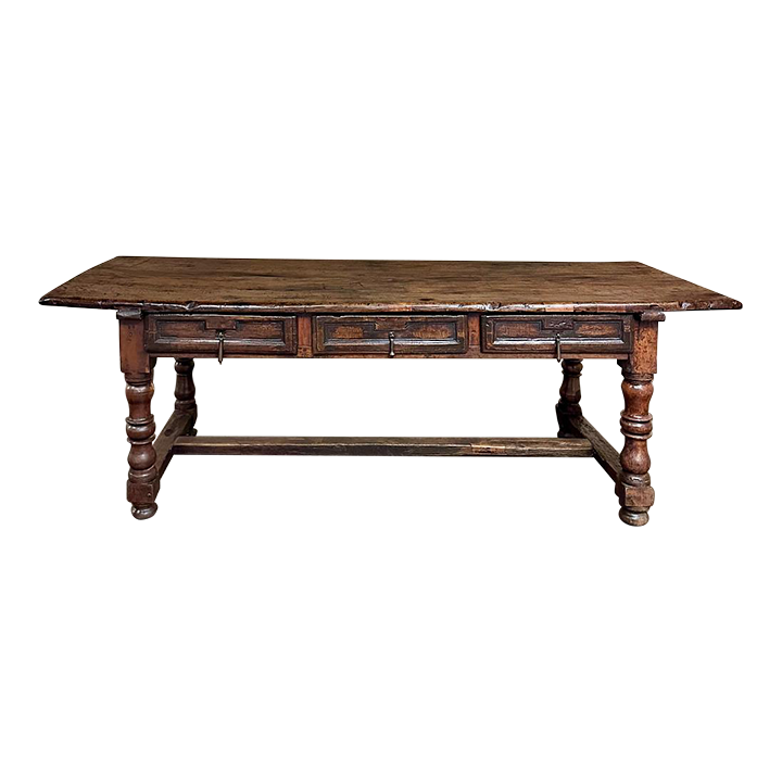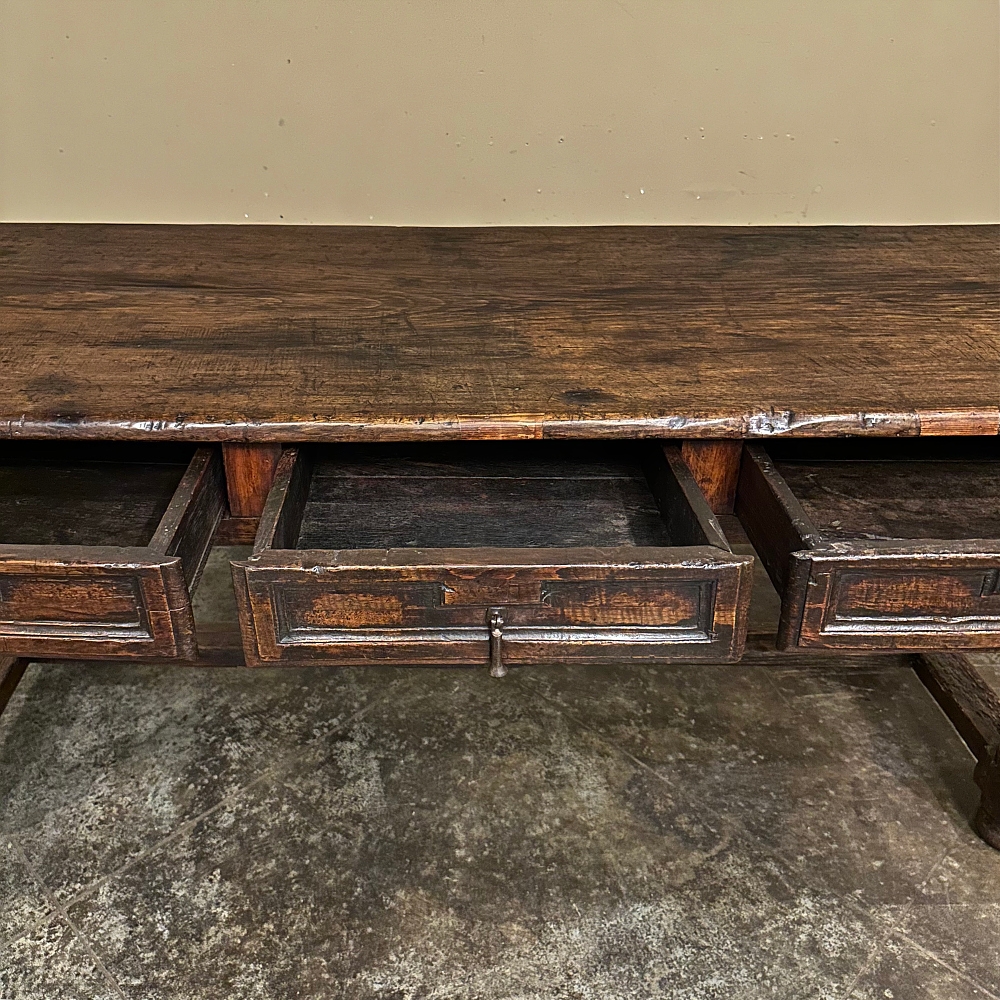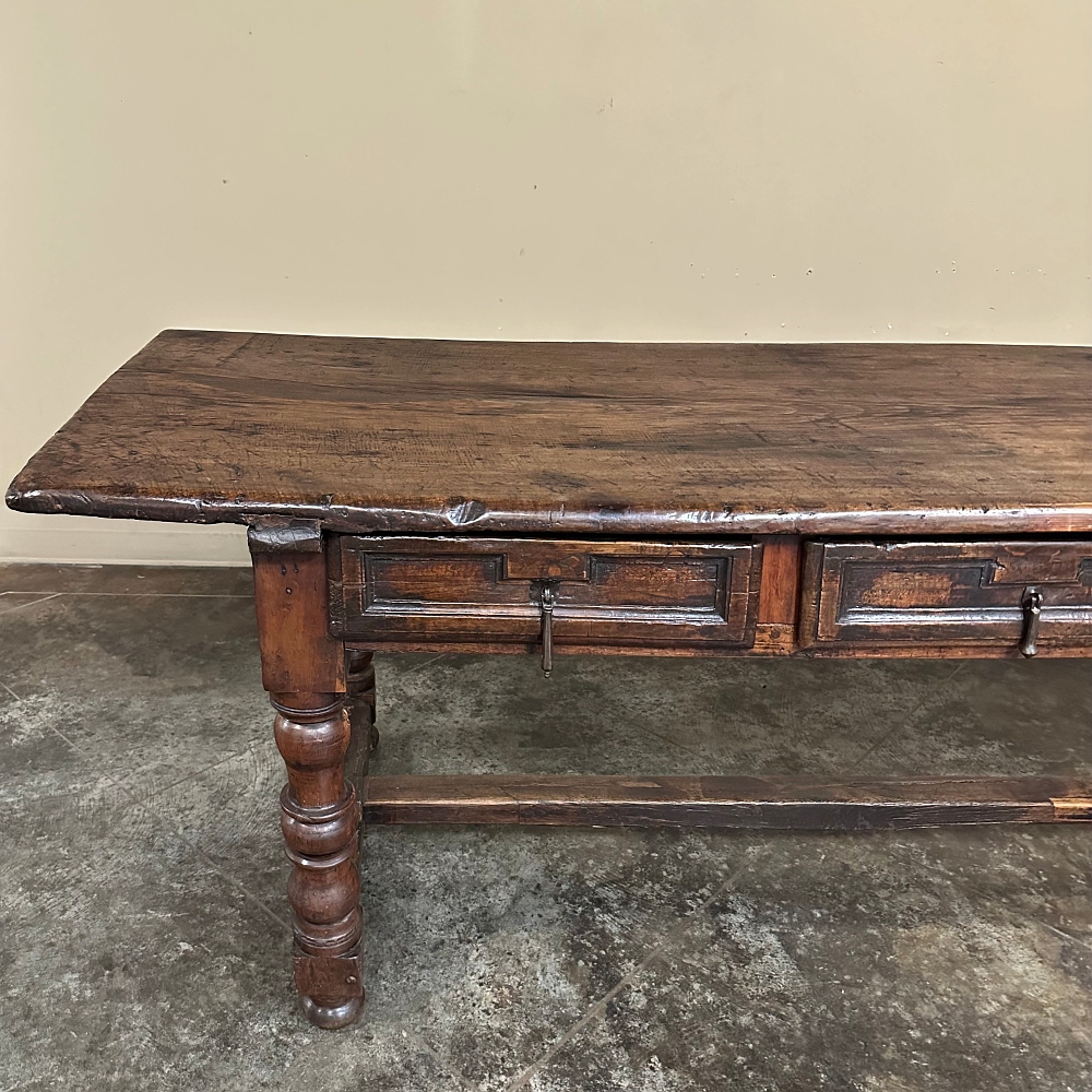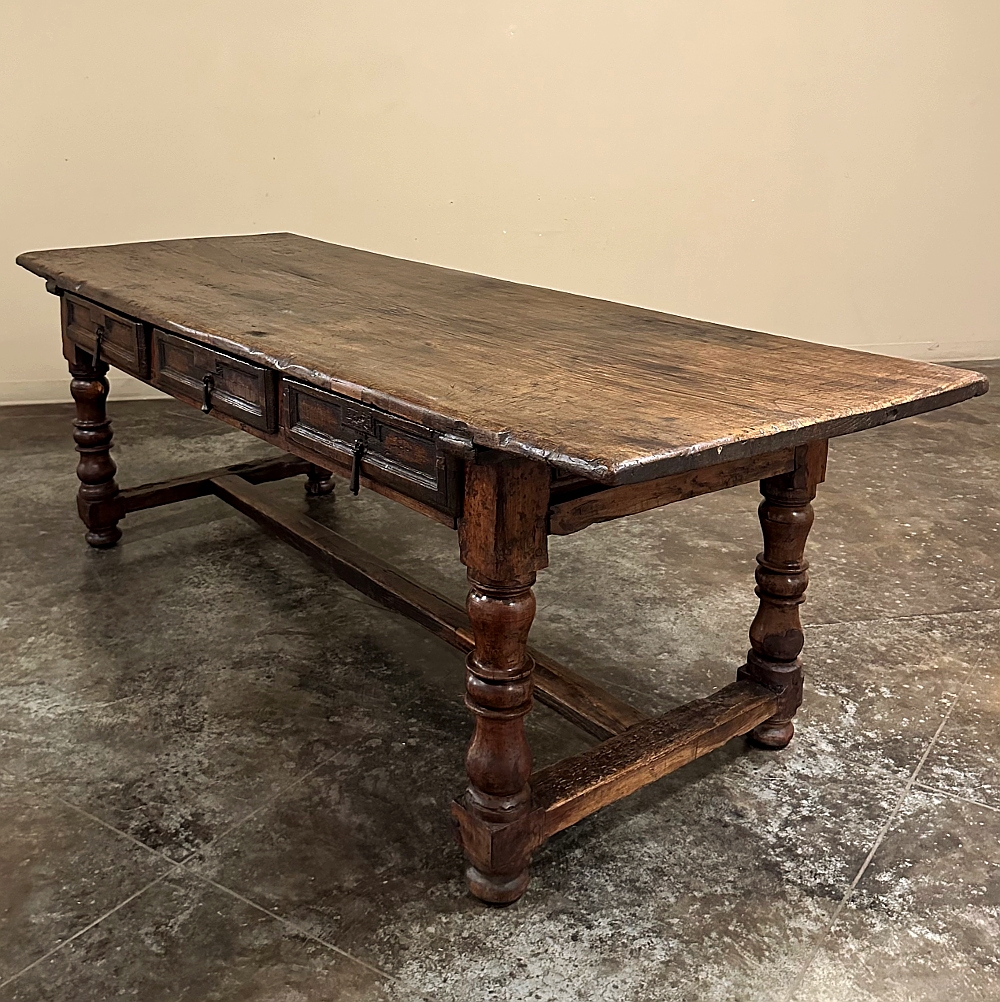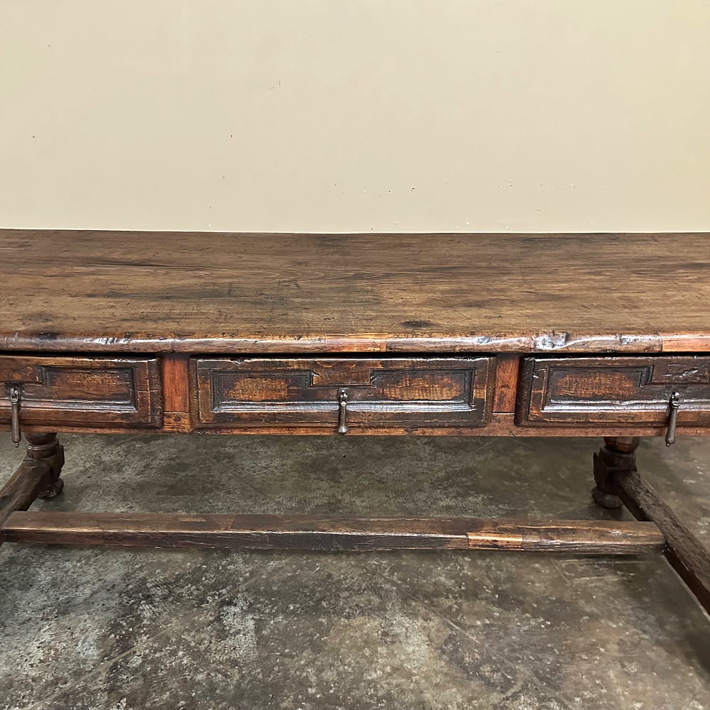 18th Century Rustic Spanish Walnut Desk recalls the days when Spain was still considered one of the mightiest nations in the world with an extraordinary navy, although somewhat in decline by the 1700s. This desk represents the vestiges of the colonial period, with solid plank top supported by turned legs dovetailed underneath, with a tier of three drawers, tailored in design, and fitted with steel pendant pulls. The legs are joined with a classic "H" stretcher for strength and longevity. Such a desk would have belonged only to the affluent, who could afford the education and status, especially with a desk almost 8' in width for a spacious workspace as well as to impress guests.