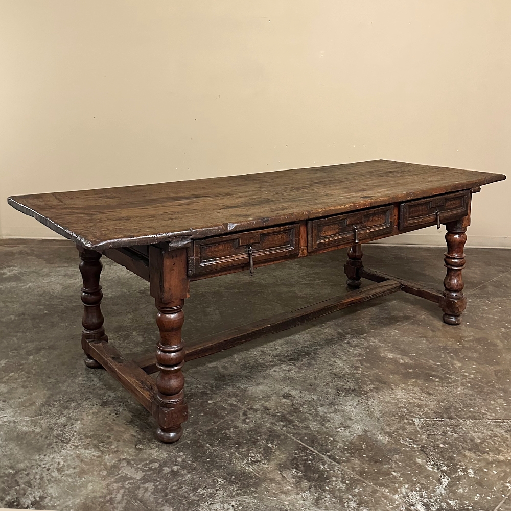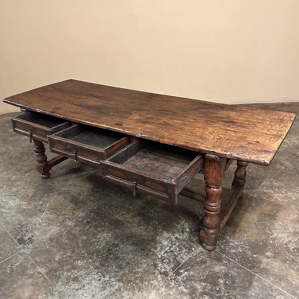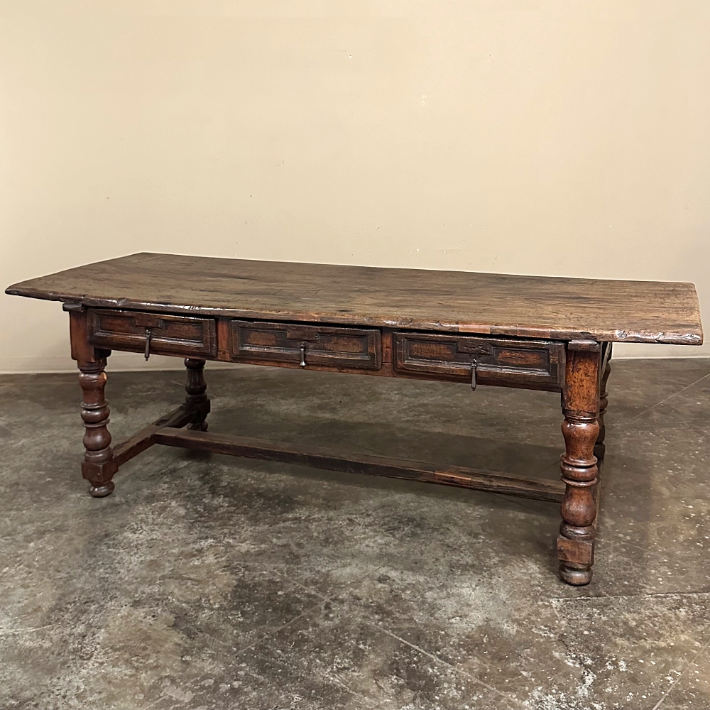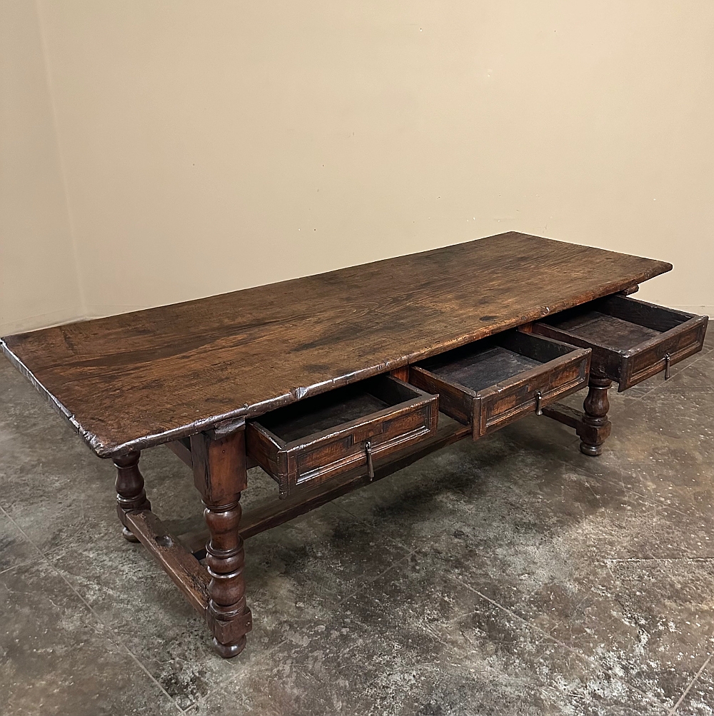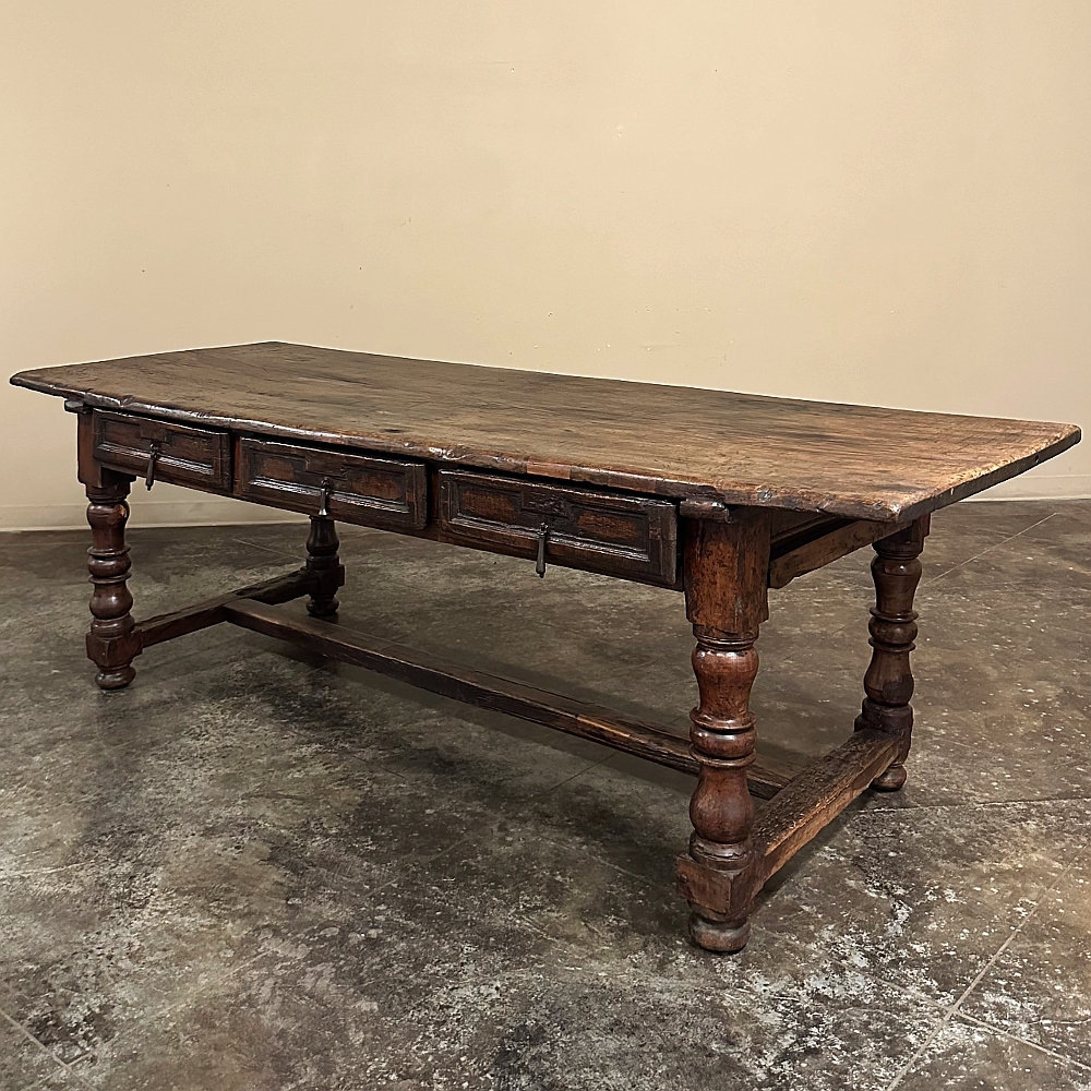 18th Century Rustic Spanish Walnut Desk recalls the days when Spain was still considered one of the mightiest nations in the world with an extraordinary navy, although somewhat in decline by the 1700s. This desk represents the vestiges of the colonial period, with solid plank top supported by turned legs dovetailed underneath, with a tier of three drawers, tailored in design, and fitted with steel pendant pulls. The legs are joined with a classic "H" stretcher for strength and longevity. Such a desk would have belonged only to the affluent, who could afford the education and status, especially with a desk almost 8' in width for a spacious workspace as well as to impress guests.