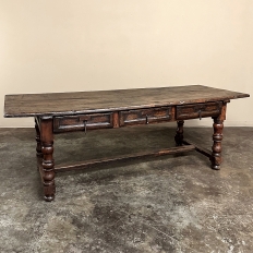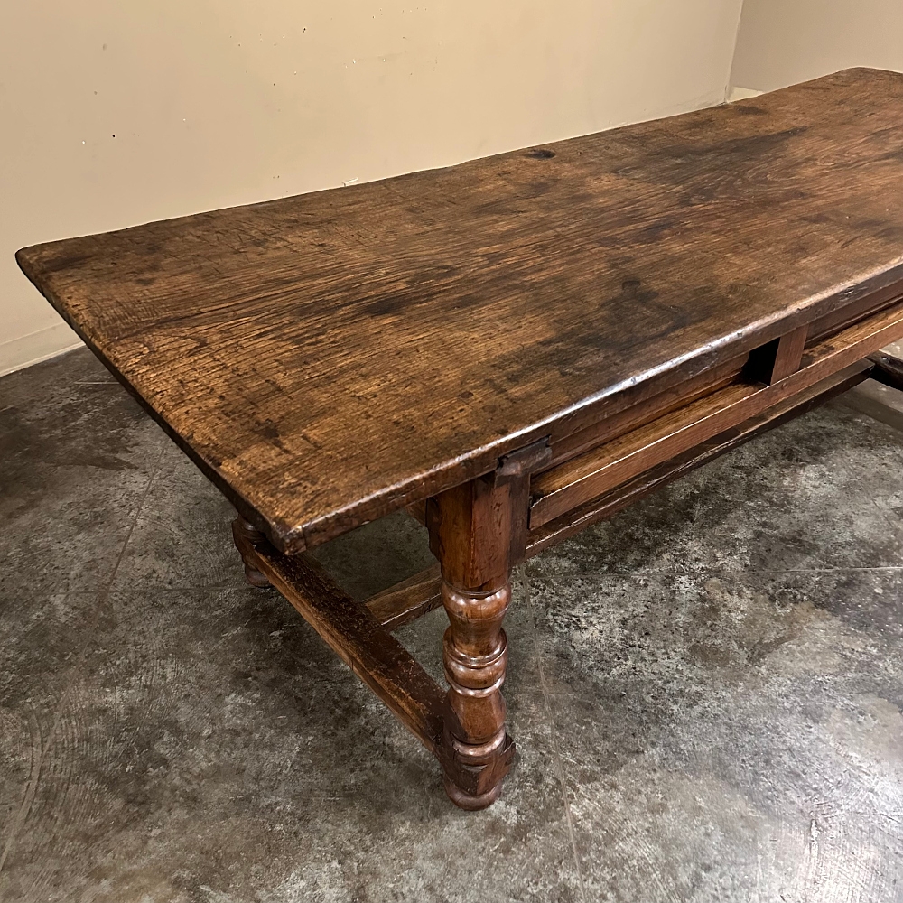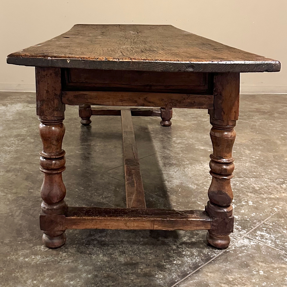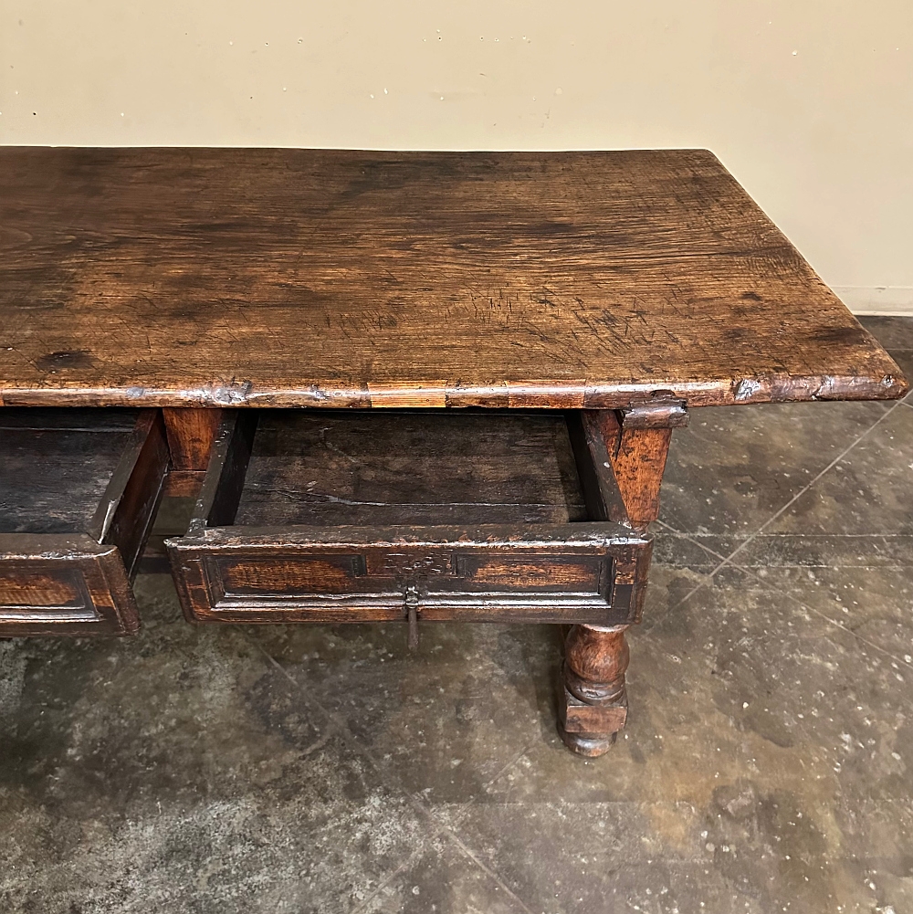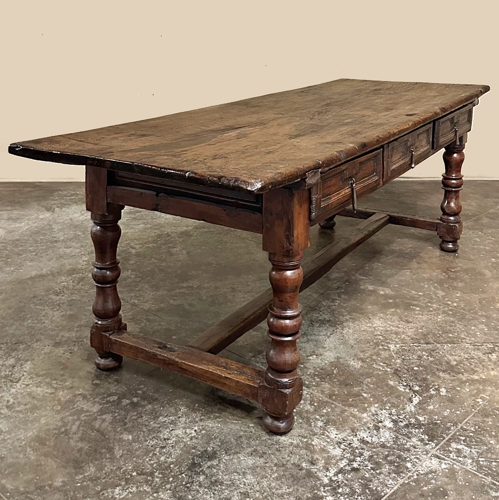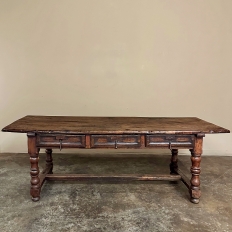 18th Century Rustic Spanish Walnut Desk recalls the days when Spain was still considered one of the mightiest nations in the world with an extraordinary navy, although somewhat in decline by the 1700s. This desk represents the vestiges of the colonial period, with solid plank top supported by turned legs dovetailed underneath, with a tier of three drawers, tailored in design, and fitted with steel pendant pulls. The legs are joined with a classic "H" stretcher for strength and longevity. Such a desk would have belonged only to the affluent, who could afford the education and status, especially with a desk almost 8' in width for a spacious workspace as well as to impress guests.