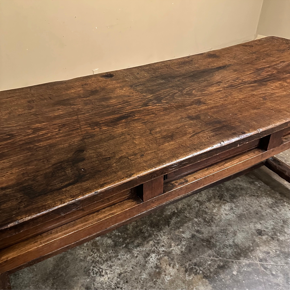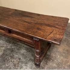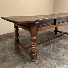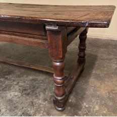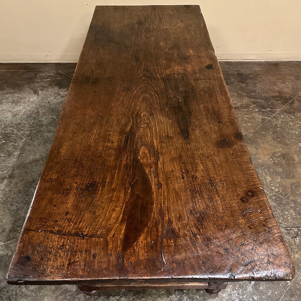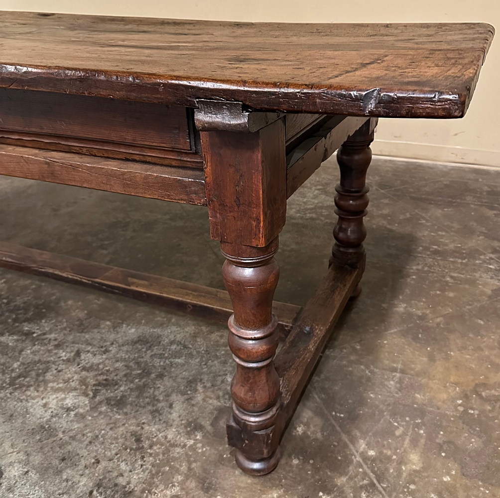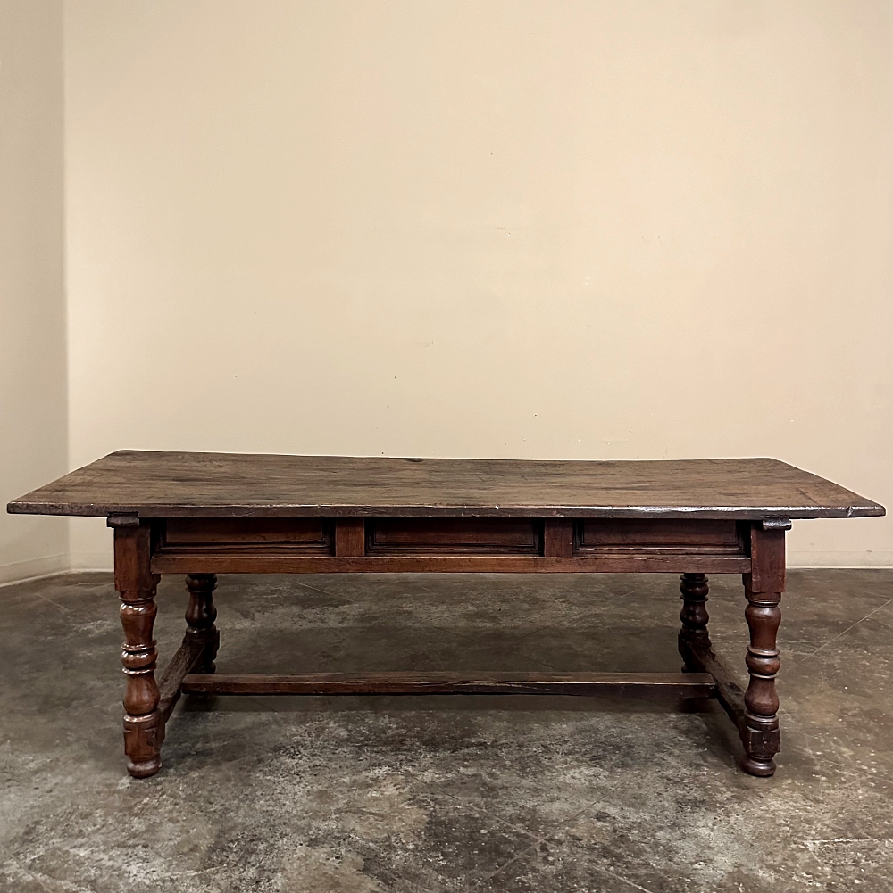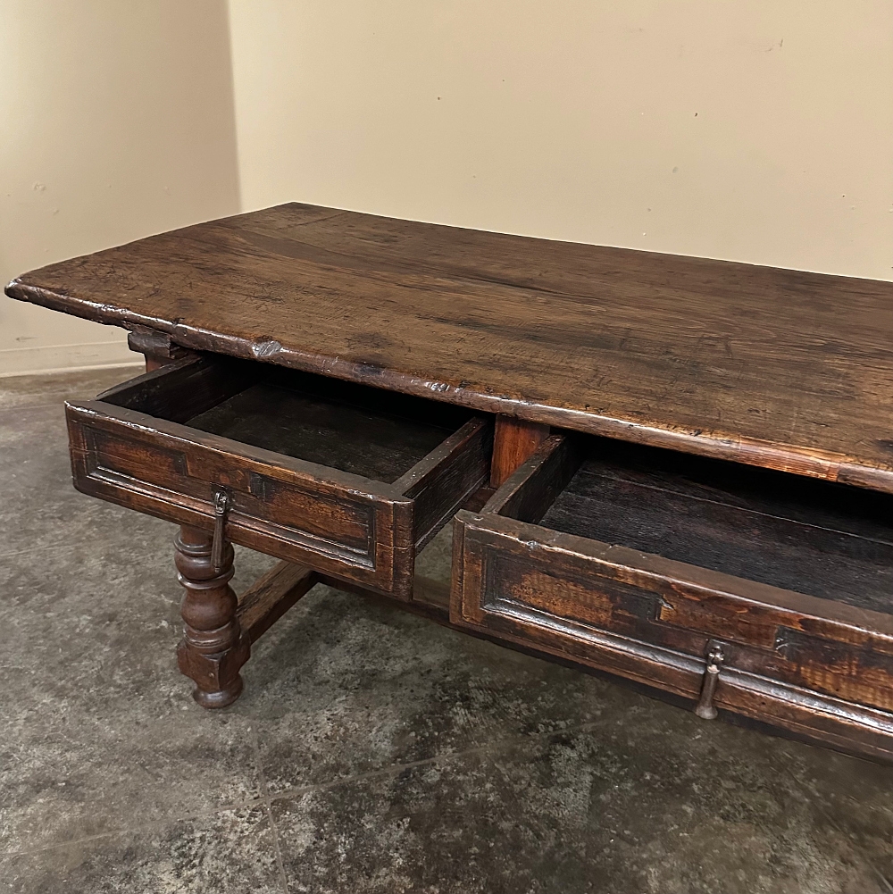 18th Century Rustic Spanish Walnut Desk recalls the days when Spain was still considered one of the mightiest nations in the world with an extraordinary navy, although somewhat in decline by the 1700s. This desk represents the vestiges of the colonial period, with solid plank top supported by turned legs dovetailed underneath, with a tier of three drawers, tailored in design, and fitted with steel pendant pulls. The legs are joined with a classic "H" stretcher for strength and longevity. Such a desk would have belonged only to the affluent, who could afford the education and status, especially with a desk almost 8' in width for a spacious workspace as well as to impress guests.