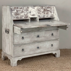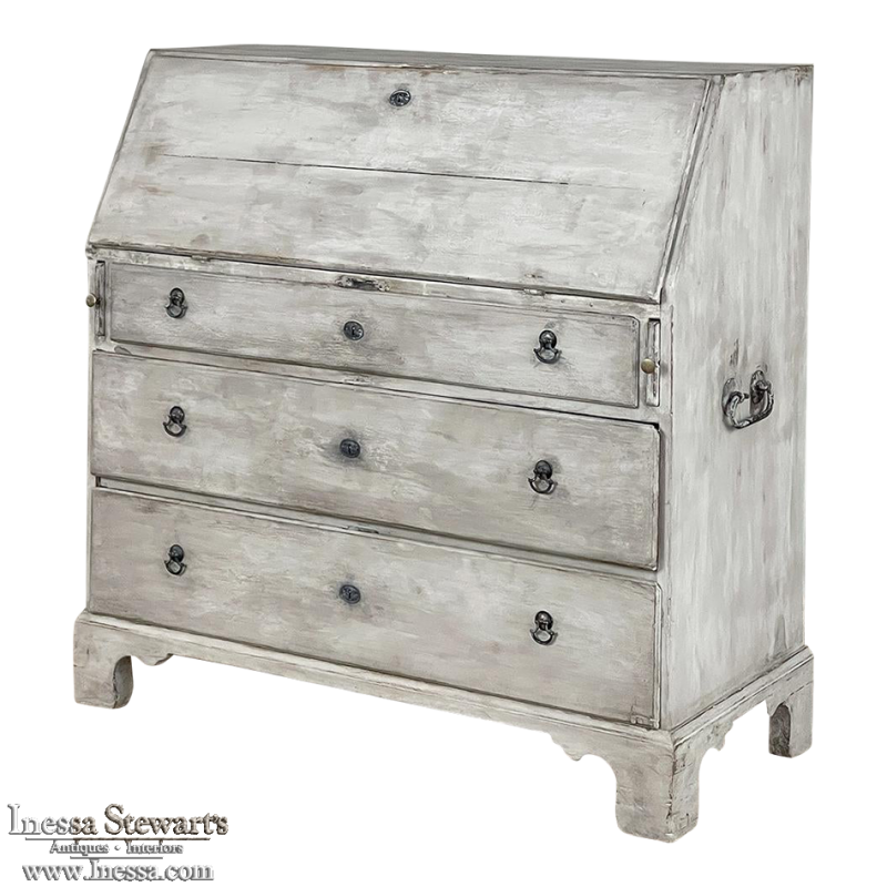18th Century Swedish Neoclassical Painted Secretary Desk will make the perfect addition to your home whether your decor is modern, traditional, classic or rustic! Hand-crafted from dense, old-growth pine that is similar in characteristics to today's hardwoods, it features a classic design with tailored lines enhanced by the distressed, patinaed painted finish and the corbel-style base structure below. Brass pulls, keyguards and side handles add a nice accent. Open the drawers to reveal capacious storage, and flanking the top drawer are two pull-out supports that provide a sturdy base for the drop-front desk surface. When open, the interior reveals three cubby holes, 12 larger drawers and six smaller drawers plus a central cabinet!