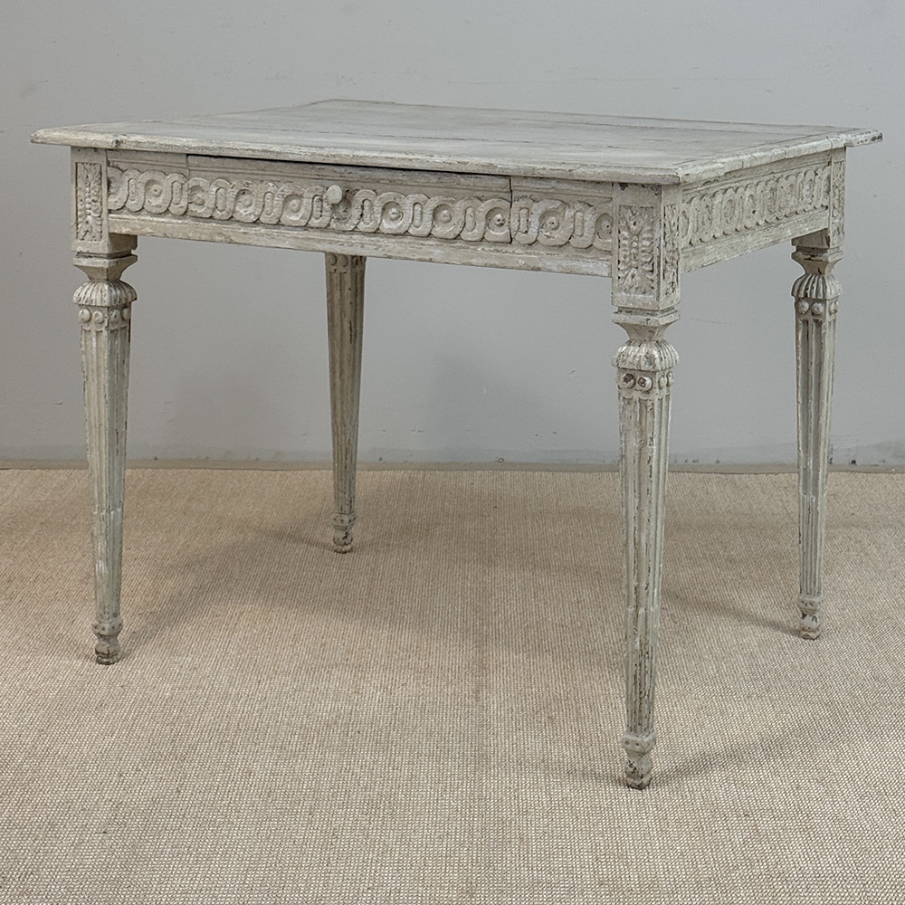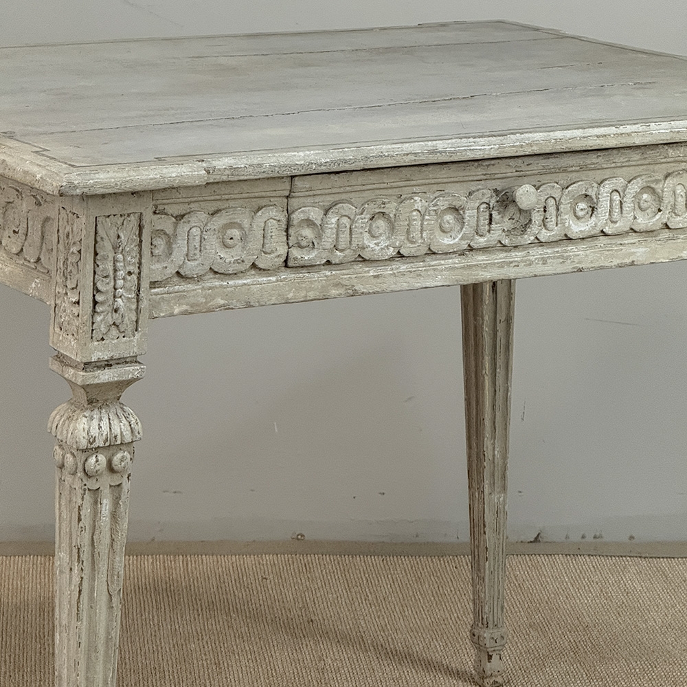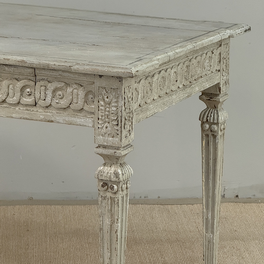 This selection embodies the quiet refinement and understated elegance of Scandinavian neoclassical design. Raised on slender fluted tapering legs, the table is richly detailed with hand-carved apron decoration and retains a beautifully timeworn painted surface that gives it warmth, depth, and character. The single drawer adds practicality, allowing it to serve just as beautifully as a writing desk as it does a center table.