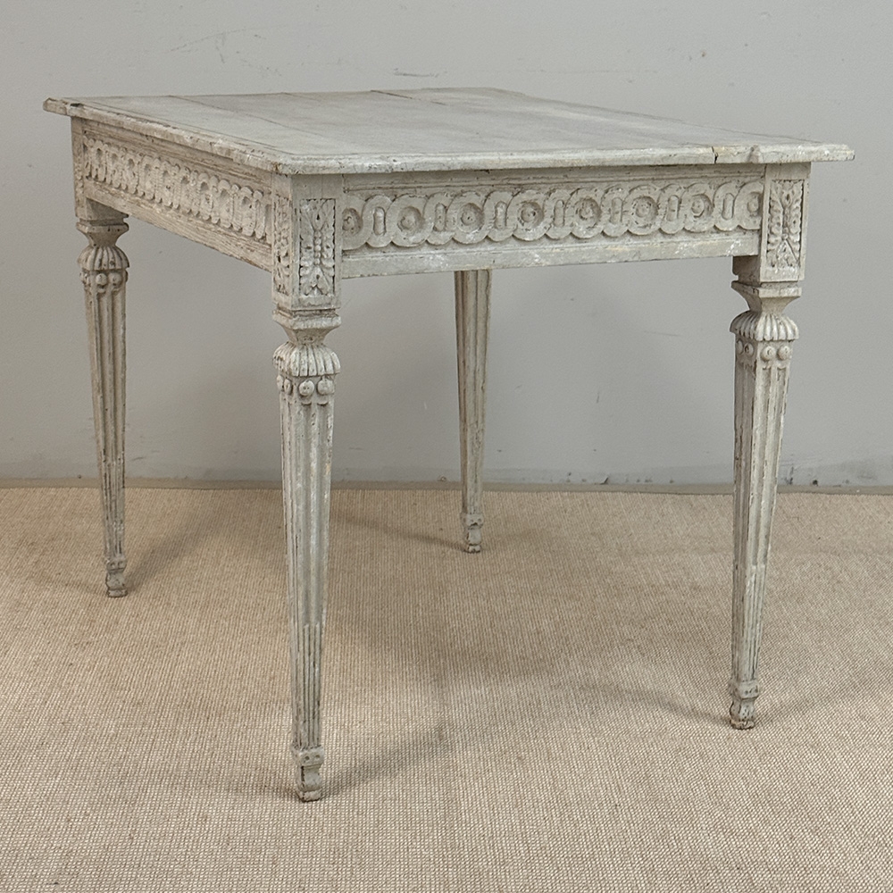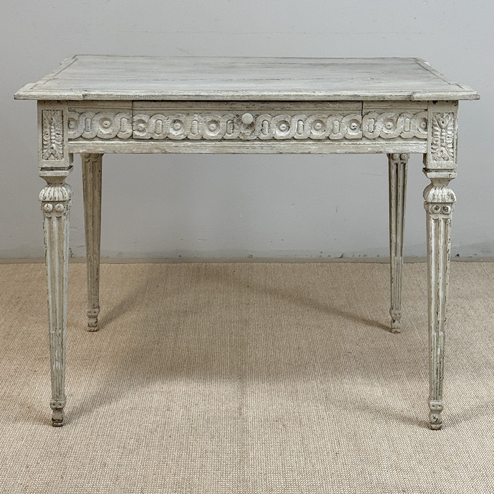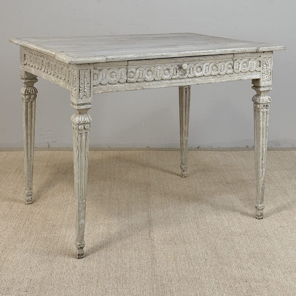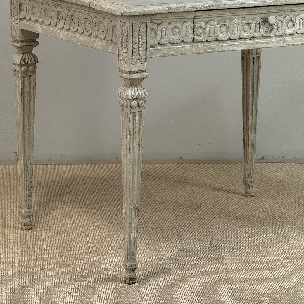 This selection embodies the quiet refinement and understated elegance of Scandinavian neoclassical design. Raised on slender fluted tapering legs, the table is richly detailed with hand-carved apron decoration and retains a beautifully timeworn painted surface that gives it warmth, depth, and character. The single drawer adds practicality, allowing it to serve just as beautifully as a writing desk as it does a center table.