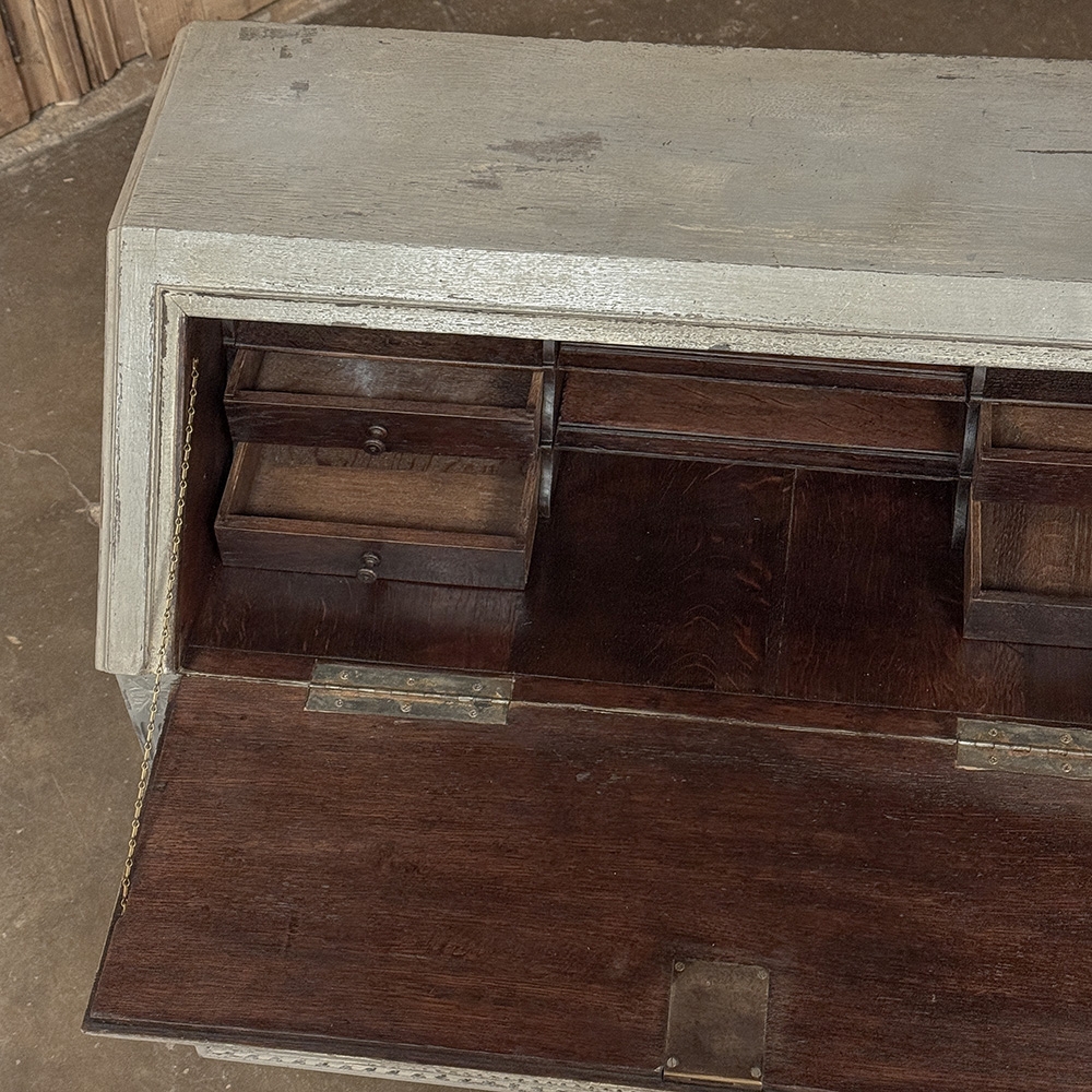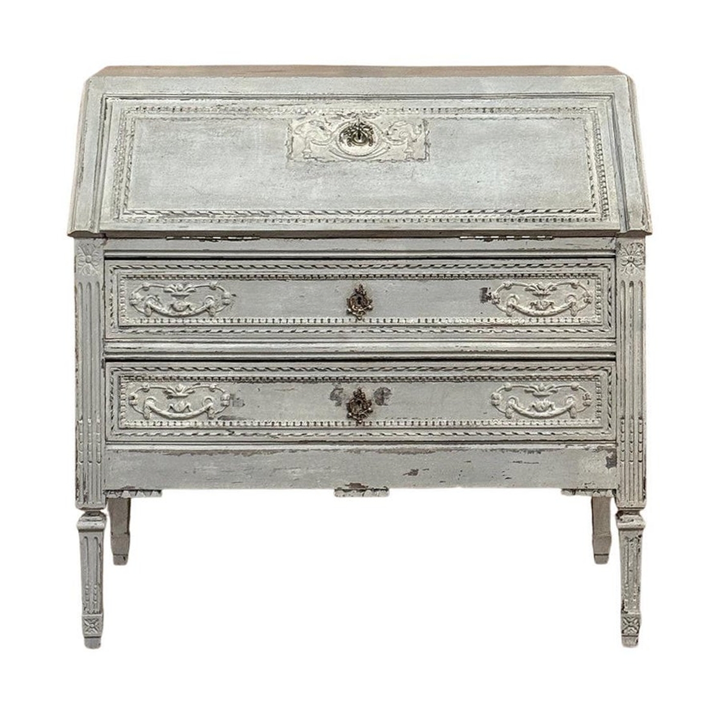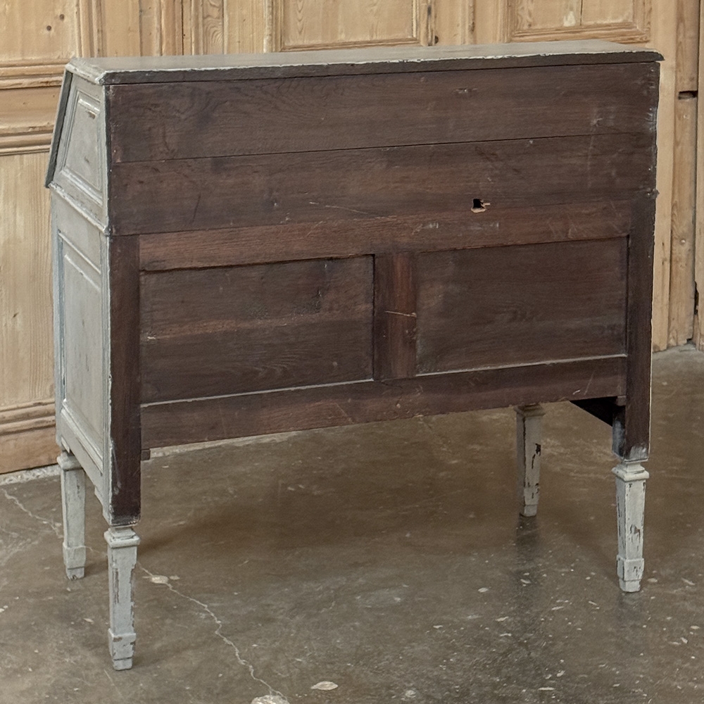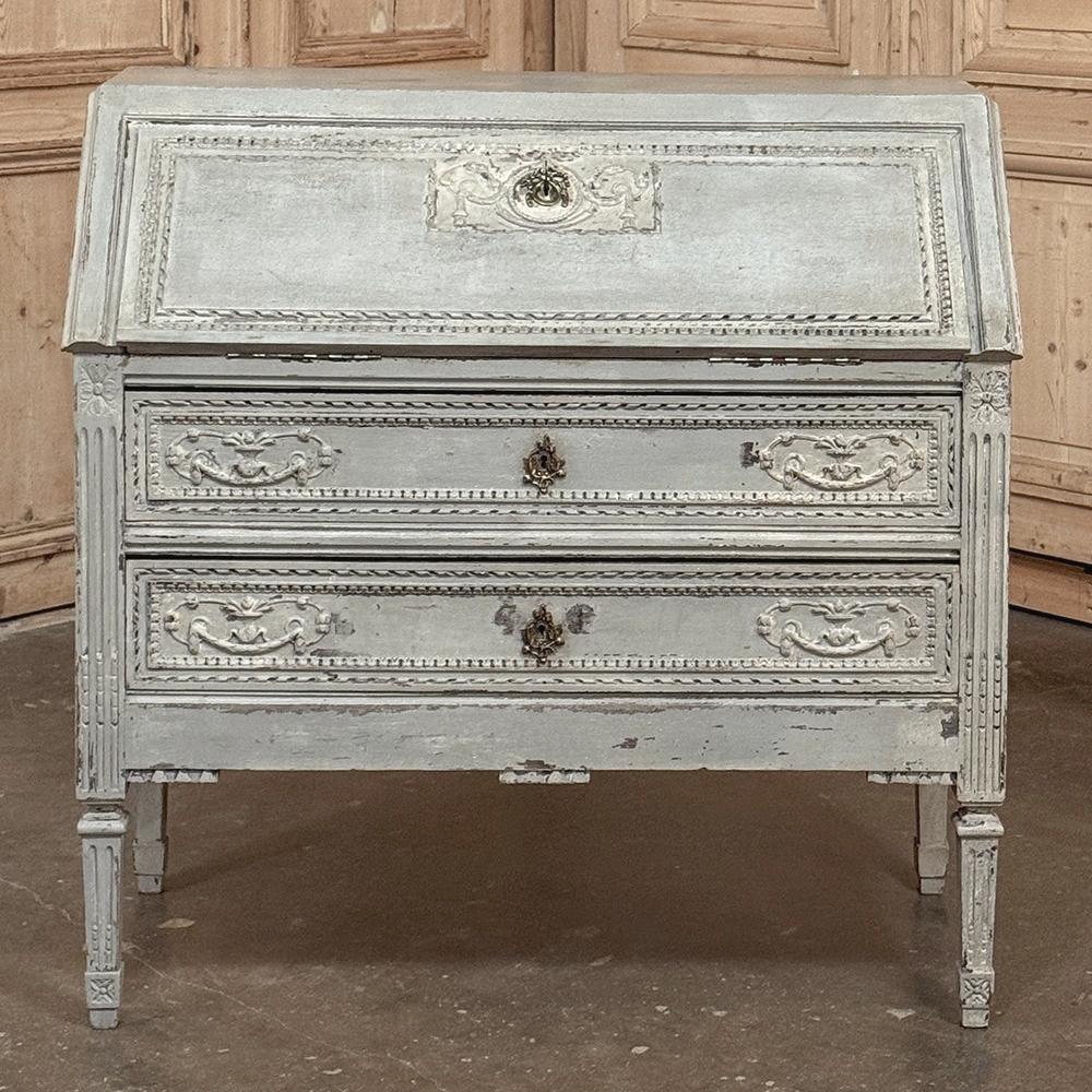 19th Century Country French Louis XVI Painted Secretaire is a marvelous example of rural artisans in the provinces emulating the styles in current favor of the court. In the instance of King Louis XVI, the neoclassical style was revived in all its glory, recalling the masters of ancient Greek and Roman architecture and style. The slant front secretaire is a clever contrivance, providing all the necessary space and storage for a small home office or student's desk, all on a footprint that mimics that of a chest of drawers. This design indeed has two full width drawers, but the slant front drops down with internal folding supports to reveal not only a writing surface, but two pairs of drawers and four cubby holes. Carved visual enhancement includes timeless urns with foliate sprays, laurel wreaths and tassels. Cast brass key guards add punctuation. The entire casework including the tapered legs and egg & dart molding trim exhibit what appears to be the original if not an early painted finish which has achieved a lovely patina with a hint of charming distressing over the many decades of serving its family.