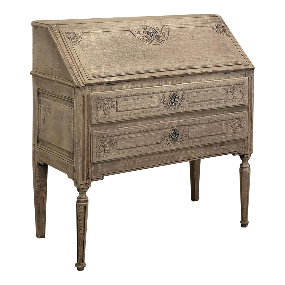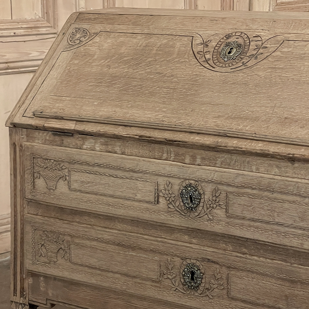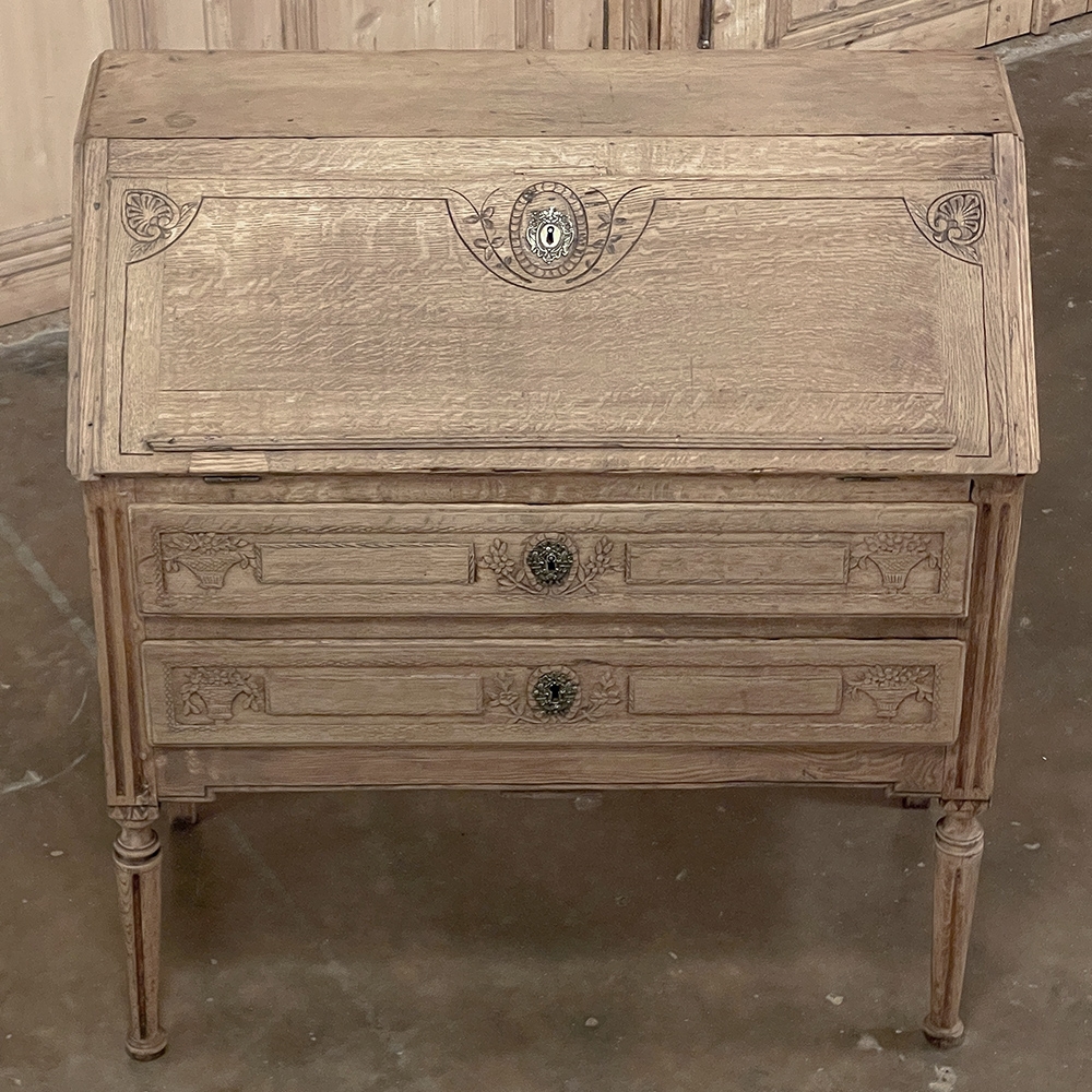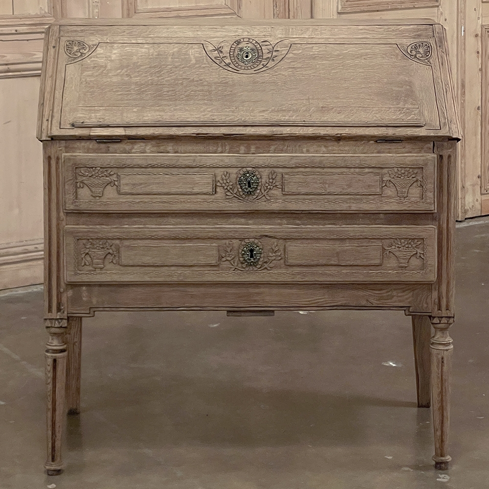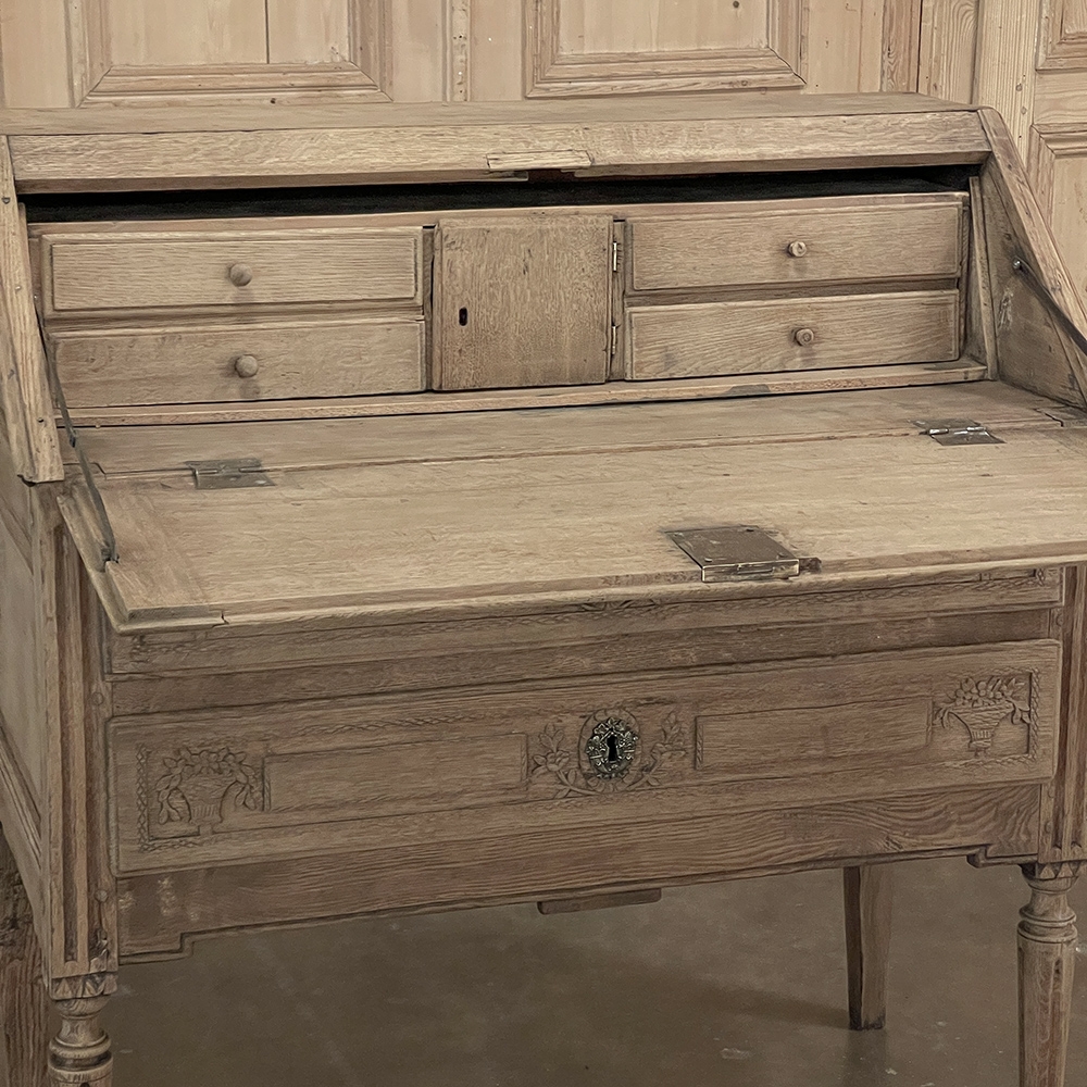 18th Century Country French Louis XVI Secretary represents the essence of efficiency with a flair for style! Hand-crafted from solid oak, its design is less than 18" deep when not in use, minimizing its floor plan foot print. The slant front top section features understated elegance with intaglio carved detailing with emphasis around the intricate cast brass key guard, which had companions on the pair of full-width drawers below. The slant front also has a shallow ledge making this piece useful for holding books or sheet music. Baskets of flowers in relief adorn the drawers below, with wheat bordering, and wildflower sprays surrounding the aforementioned key guards. Drawers open to reveal surprising storage opportunities. Fluting on the corner posts complements the tapered and fluted legs below. Open the slant-front, which is secured by internal hinged brass supports, and one discovers four small storage drawers, and a small cabinet door that opens to reveal two even smaller drawers, with the back side of the slant front becoming a splendid work surface, perfect for tablets or laptops! Thanks to our proprietary non-petrochemical stripping process, the natural beauty and patina of the wood has been revealed for a wonderfully soft visual impact and earth tone.