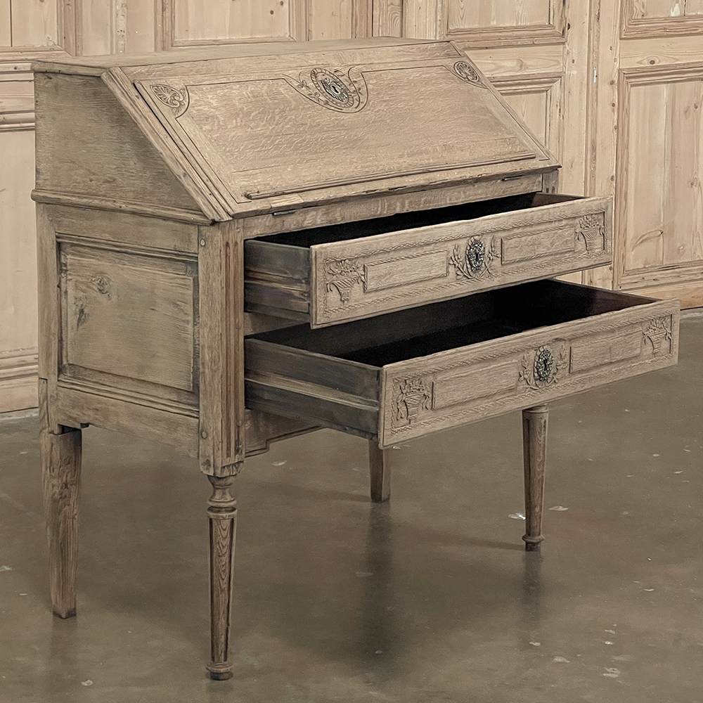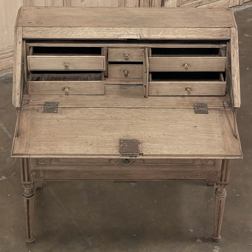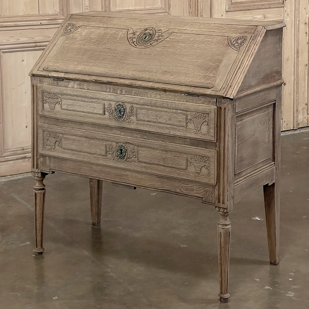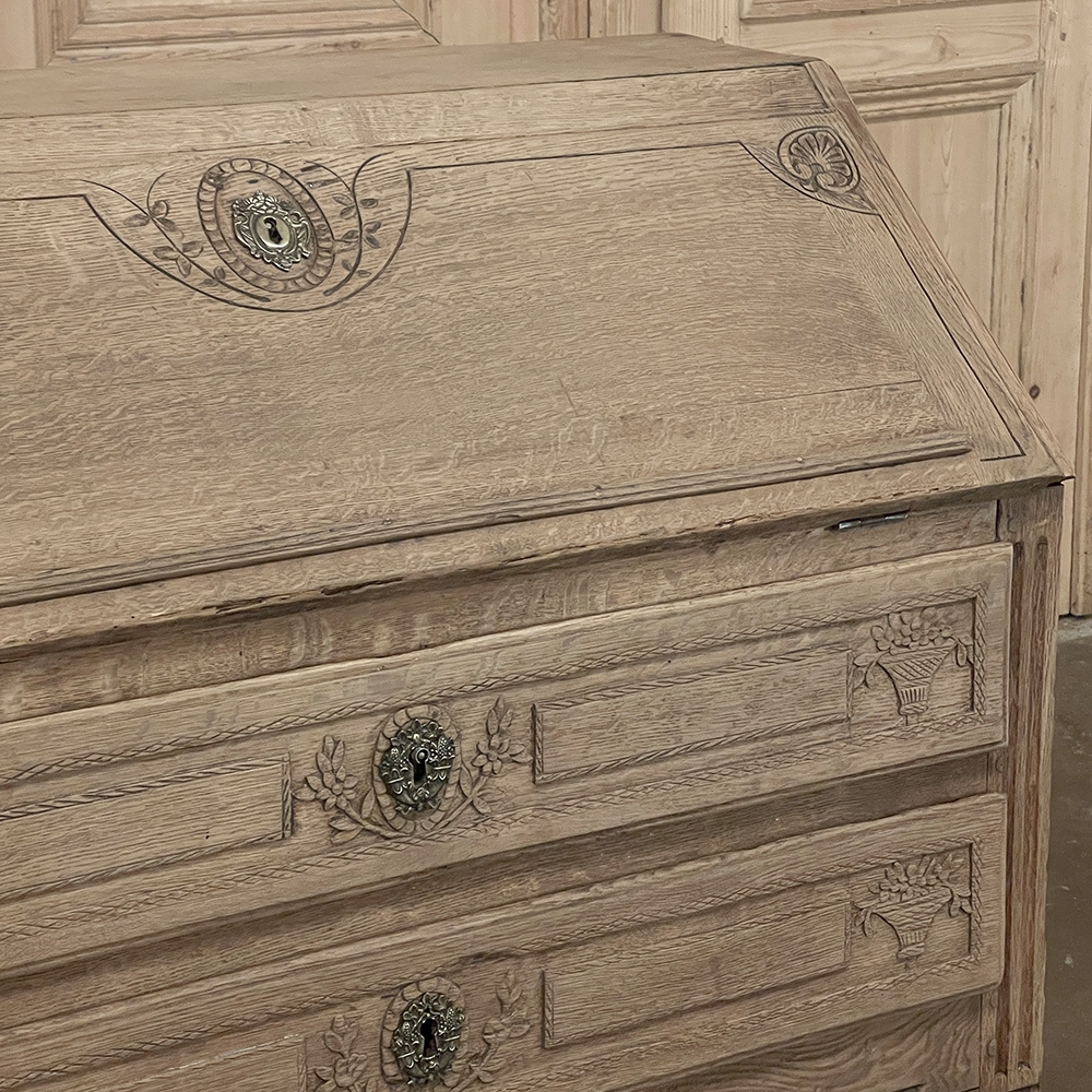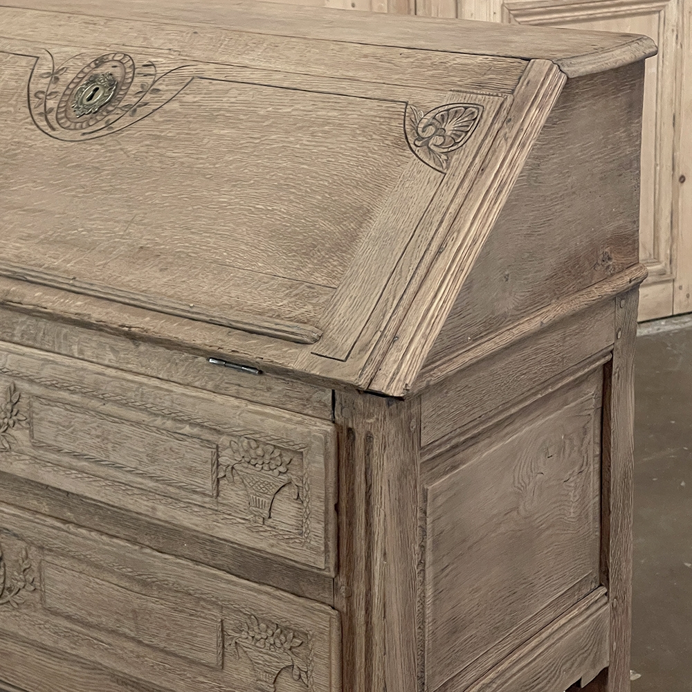 18th Century Country French Louis XVI Secretary represents the essence of efficiency with a flair for style! Hand-crafted from solid oak, its design is less than 18" deep when not in use, minimizing its floor plan foot print. The slant front top section features understated elegance with intaglio carved detailing with emphasis around the intricate cast brass key guard, which had companions on the pair of full-width drawers below. The slant front also has a shallow ledge making this piece useful for holding books or sheet music. Baskets of flowers in relief adorn the drawers below, with wheat bordering, and wildflower sprays surrounding the aforementioned key guards. Drawers open to reveal surprising storage opportunities. Fluting on the corner posts complements the tapered and fluted legs below. Open the slant-front, which is secured by internal hinged brass supports, and one discovers four small storage drawers, and a small cabinet door that opens to reveal two even smaller drawers, with the back side of the slant front becoming a splendid work surface, perfect for tablets or laptops! Thanks to our proprietary non-petrochemical stripping process, the natural beauty and patina of the wood has been revealed for a wonderfully soft visual impact and earth tone.