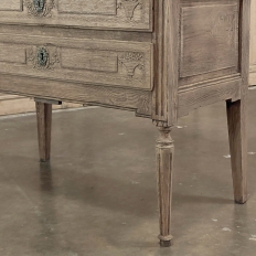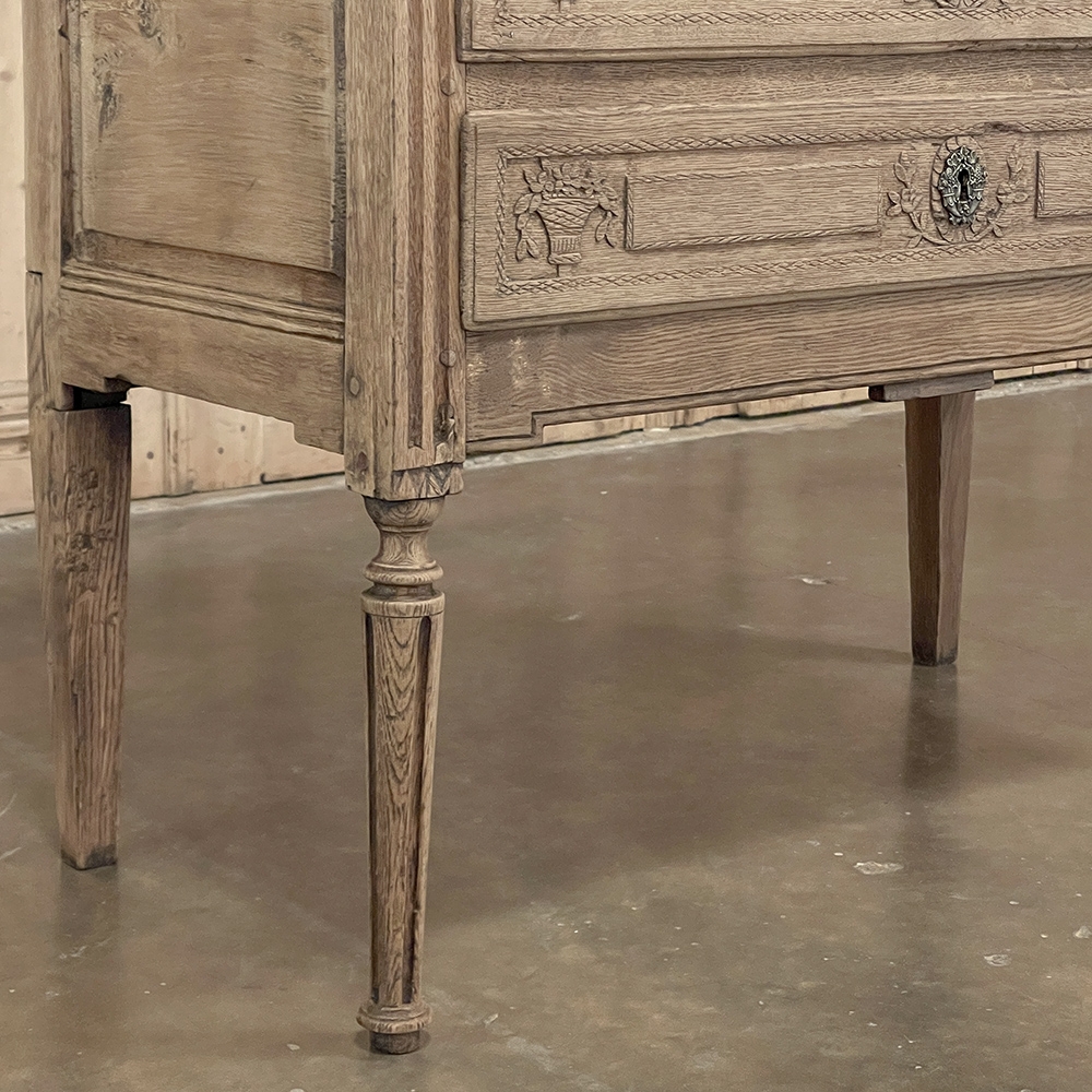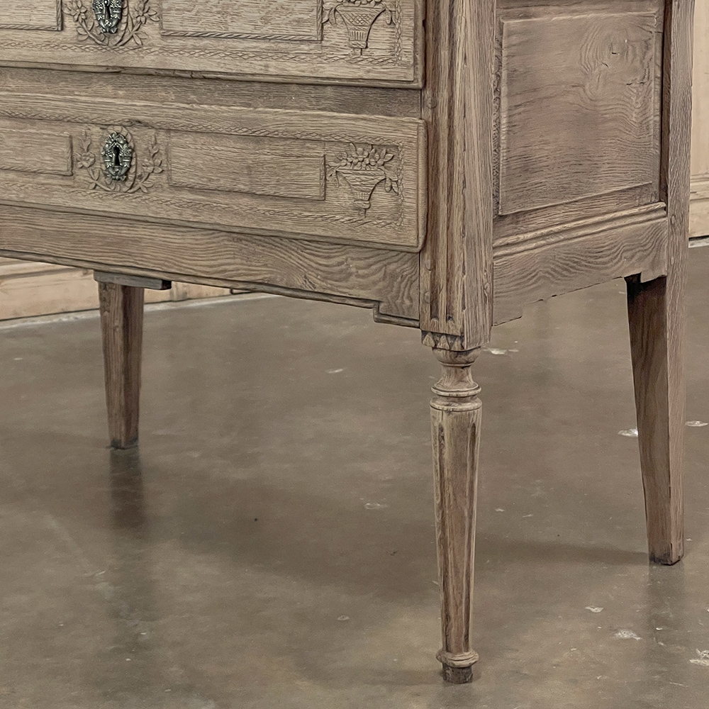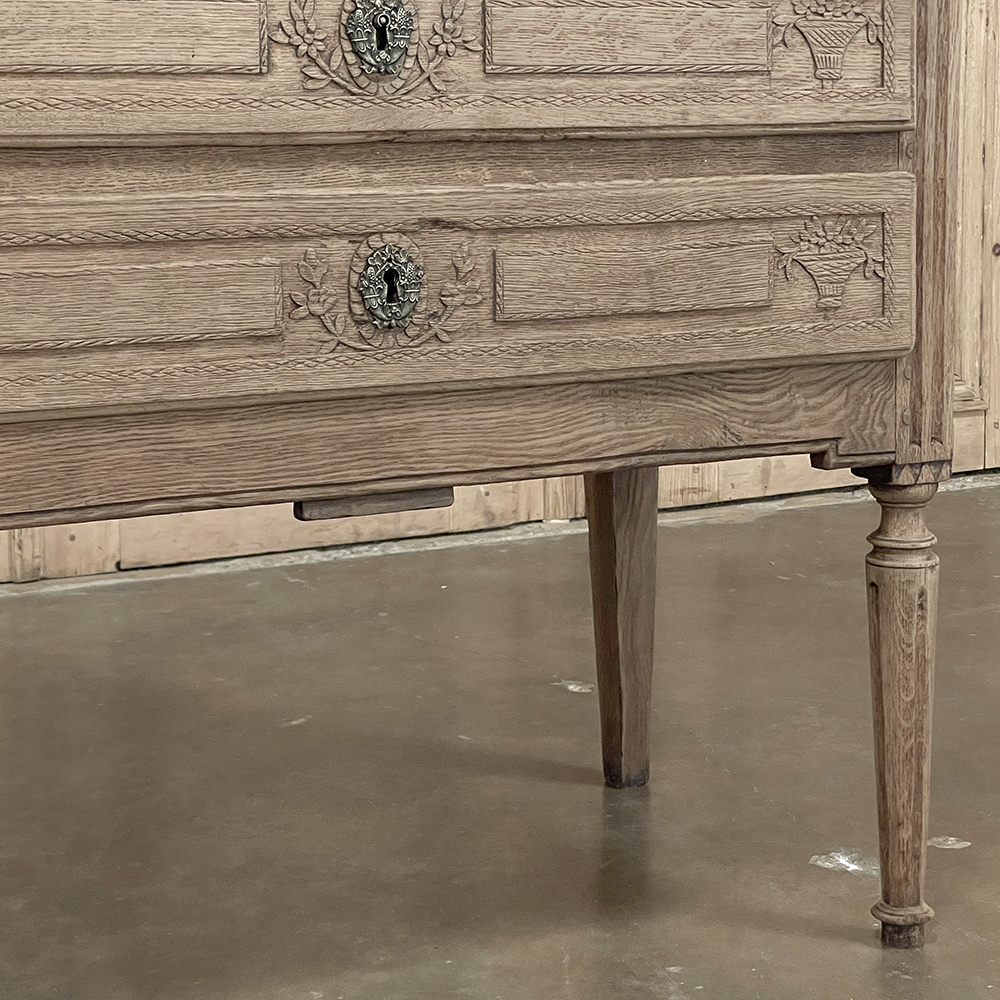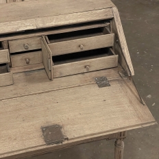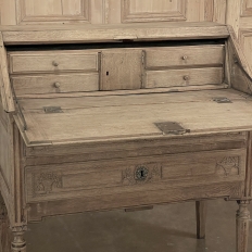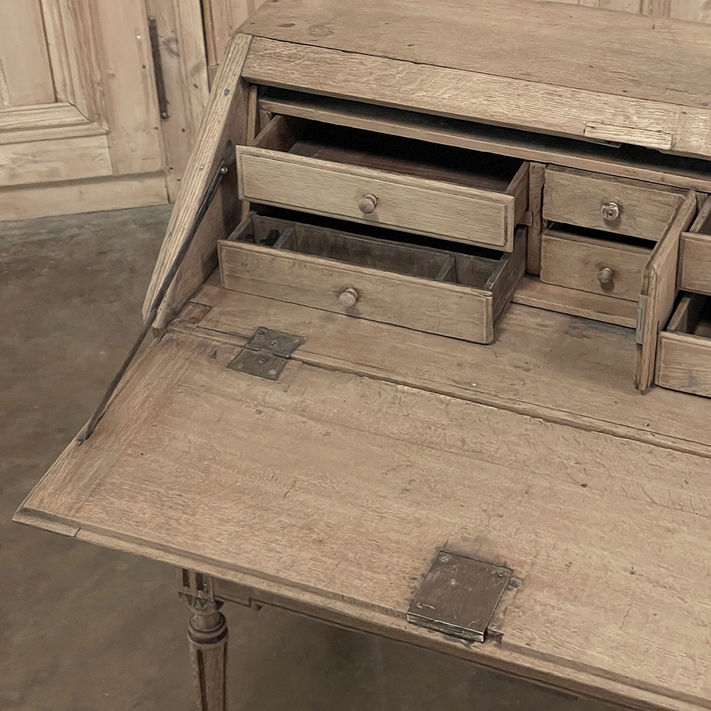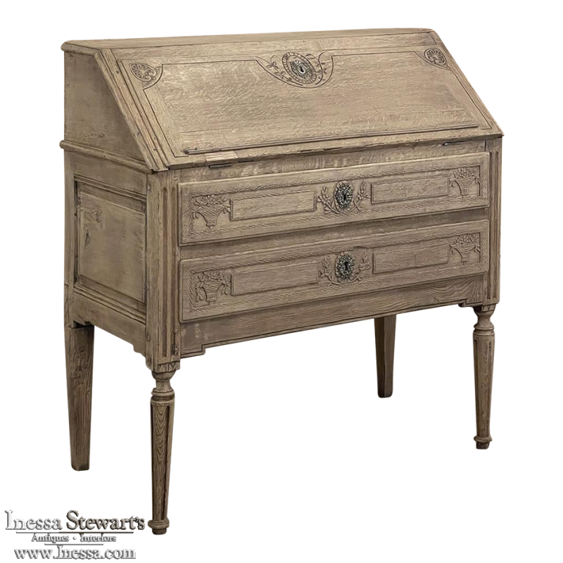 18th Century Country French Louis XVI Secretary represents the essence of efficiency with a flair for style! Hand-crafted from solid oak, its design is less than 18" deep when not in use, minimizing its floor plan foot print. The slant front top section features understated elegance with intaglio carved detailing with emphasis around the intricate cast brass key guard, which had companions on the pair of full-width drawers below. The slant front also has a shallow ledge making this piece useful for holding books or sheet music. Baskets of flowers in relief adorn the drawers below, with wheat bordering, and wildflower sprays surrounding the aforementioned key guards. Drawers open to reveal surprising storage opportunities. Fluting on the corner posts complements the tapered and fluted legs below. Open the slant-front, which is secured by internal hinged brass supports, and one discovers four small storage drawers, and a small cabinet door that opens to reveal two even smaller drawers, with the back side of the slant front becoming a splendid work surface, perfect for tablets or laptops! Thanks to our proprietary non-petrochemical stripping process, the natural beauty and patina of the wood has been revealed for a wonderfully soft visual impact and earth tone.