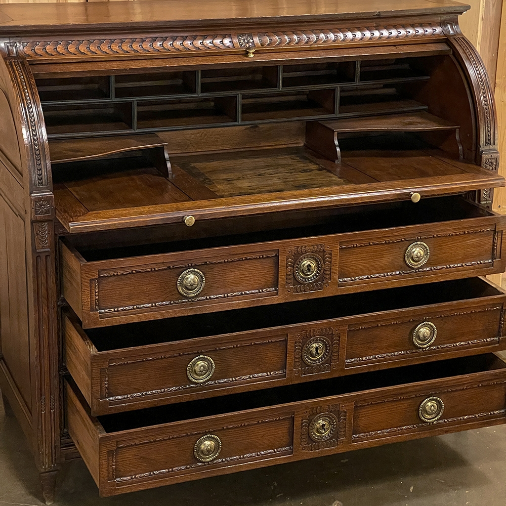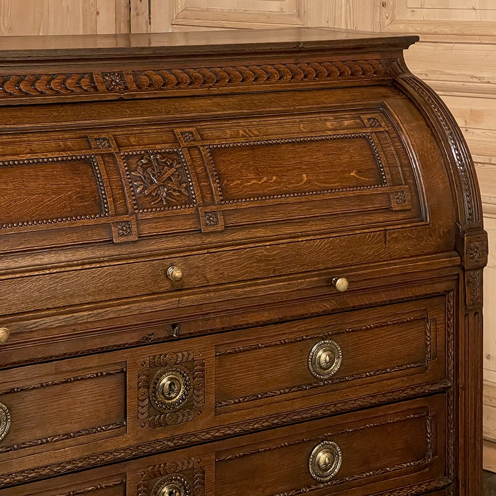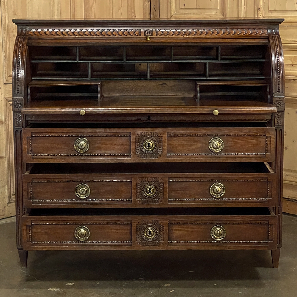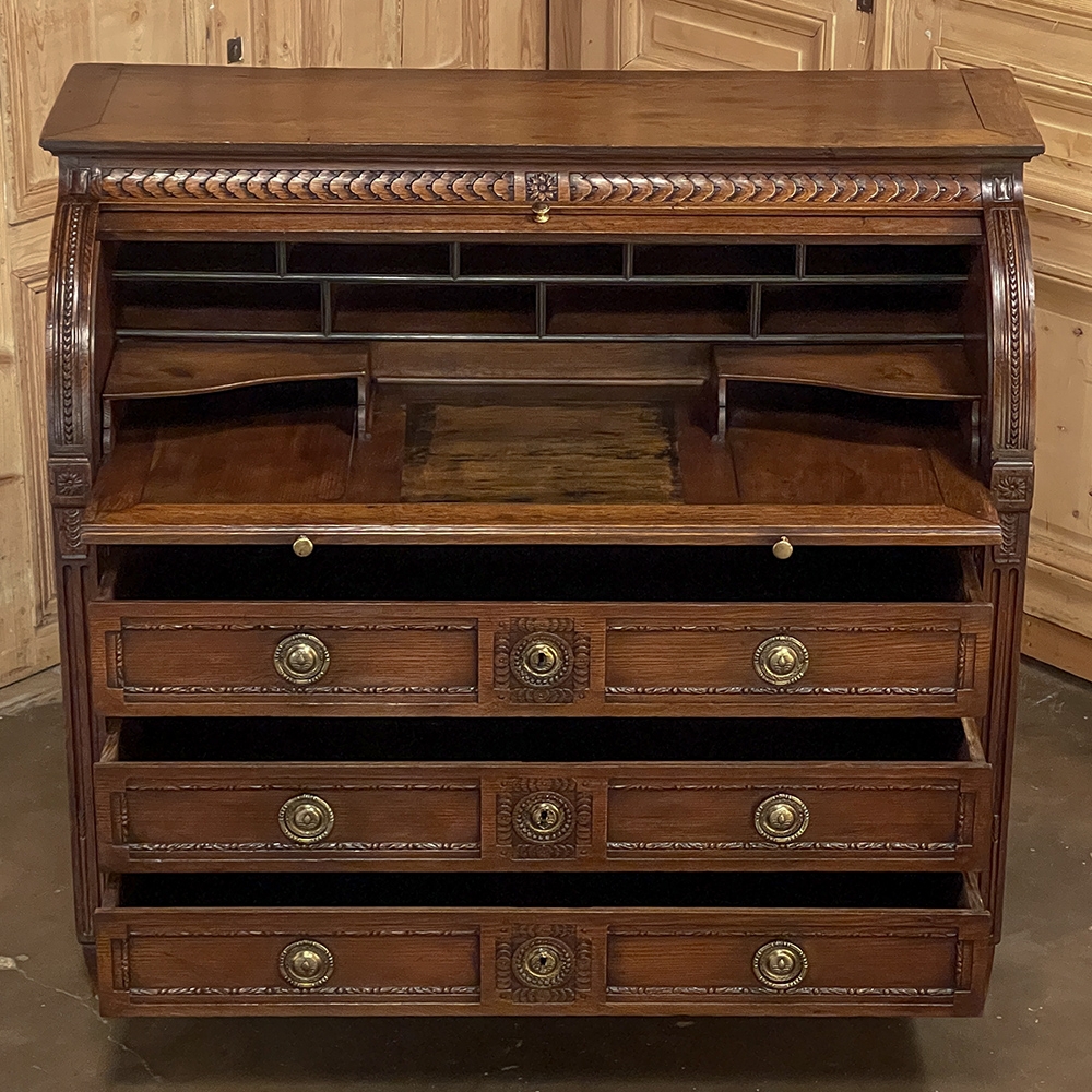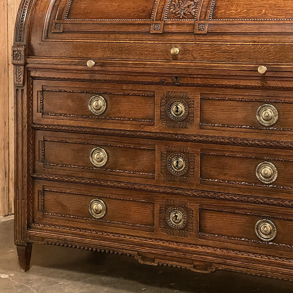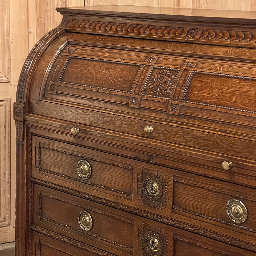 19th Century French Grand Louis XVI Cylinder Desk is the perfect answer to all your modern office needs! Designed on a larger scale than is typical of the genre, it was hand-crafted from solid old-growth oak to last for centuries and features a solid cylindrical upper tier that rolls back into the casework. When open, it reveals a capacious interior with no less than a dozen cubby holes, and a desk surface the pulls out thanks to a pair of brass knobs. The cylinder exterior is carved with motifs inspired by the neoclassical revival of the period, with rectilinear framework accented with rosettes and beading, centered with a square plaque-style carving depicting symbols of engineering and architecture on a foliate & ribbon background. The cylinder is also accessed with a brass knob. Above the cylinder appears a molded trim of Greek coin overlay centered with a rosette, and above that a generous surface for permanent display. The genius of the design also includes three huge full width drawers in the casework below, each framed with complementary motifs and fitted with bronze ring pulls with embossed medallions, centered with bronze key guards in their own Greek coin overlay framing. Wheat trim appears above, on and below the drawers, complementing the cornerposts which are fluted and reeded at the base with wheat motif. At the top of the cornerposts appears more Greek coin overlay and a rosette, in a continuation of the theme. The contoured apron is enhanced with beading, with finely chamfered panels on the sides enhanced with complementary molded detail. Tapered feet provide support.