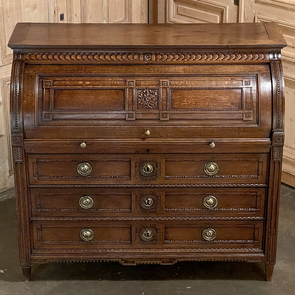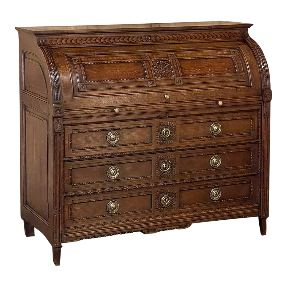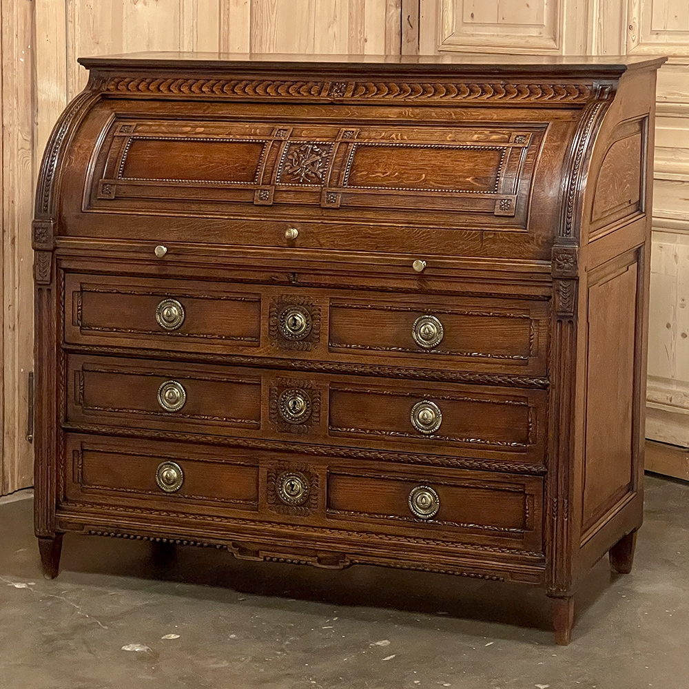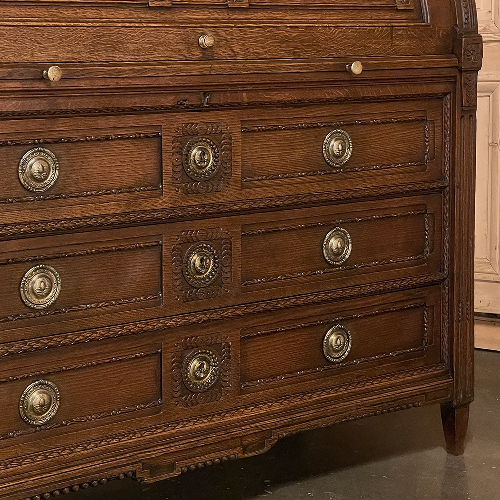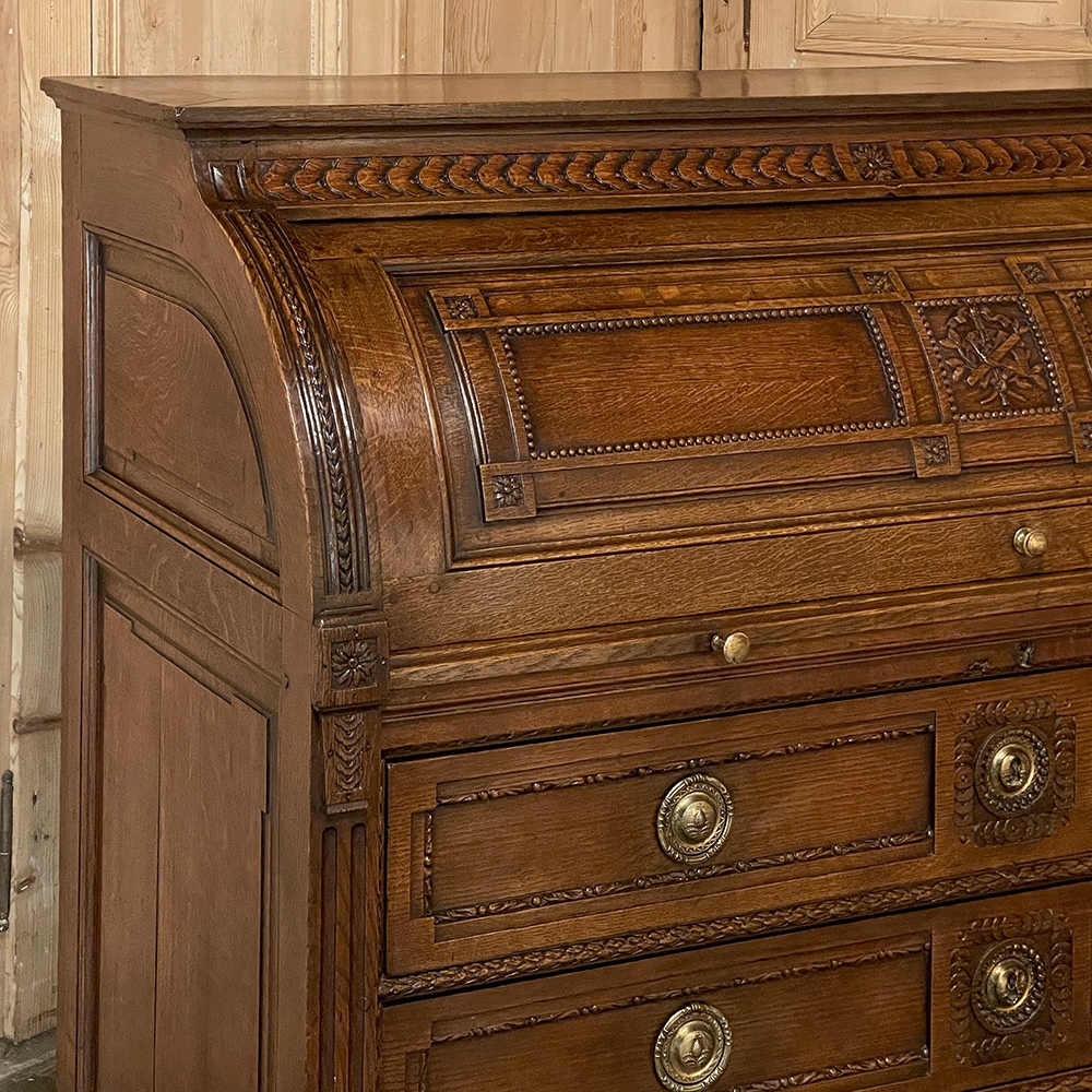19th Century French Grand Louis XVI Cylinder Desk is the perfect answer to all your modern office needs! Designed on a larger scale than is typical of the genre, it was hand-crafted from solid old-growth oak to last for centuries and features a solid cylindrical upper tier that rolls back into the casework. When open, it reveals a capacious interior with no less than a dozen cubby holes, and a desk surface the pulls out thanks to a pair of brass knobs. The cylinder exterior is carved with motifs inspired by the neoclassical revival of the period, with rectilinear framework accented with rosettes and beading, centered with a square plaque-style carving depicting symbols of engineering and architecture on a foliate & ribbon background. The cylinder is also accessed with a brass knob. Above the cylinder appears a molded trim of Greek coin overlay centered with a rosette, and above that a generous surface for permanent display. The genius of the design also includes three huge full width drawers in the casework below, each framed with complementary motifs and fitted with bronze ring pulls with embossed medallions, centered with bronze key guards in their own Greek coin overlay framing. Wheat trim appears above, on and below the drawers, complementing the cornerposts which are fluted and reeded at the base with wheat motif. At the top of the cornerposts appears more Greek coin overlay and a rosette, in a continuation of the theme. The contoured apron is enhanced with beading, with finely chamfered panels on the sides enhanced with complementary molded detail. Tapered feet provide support.