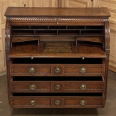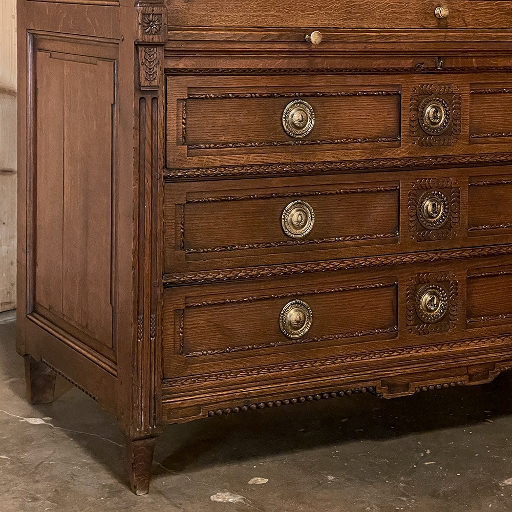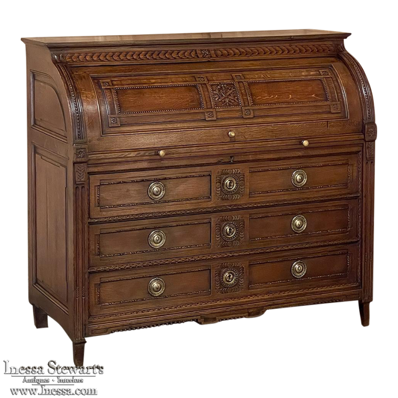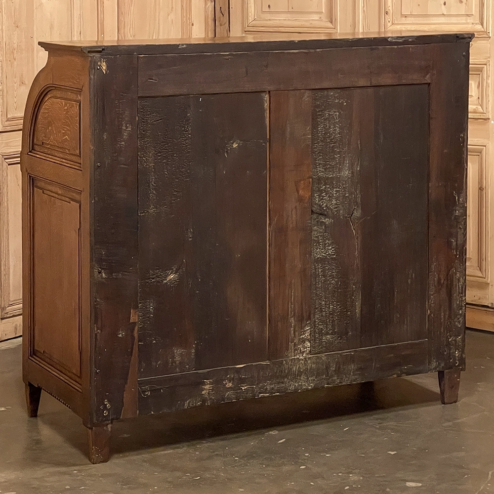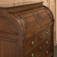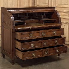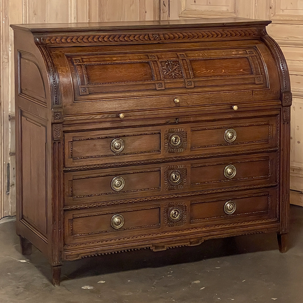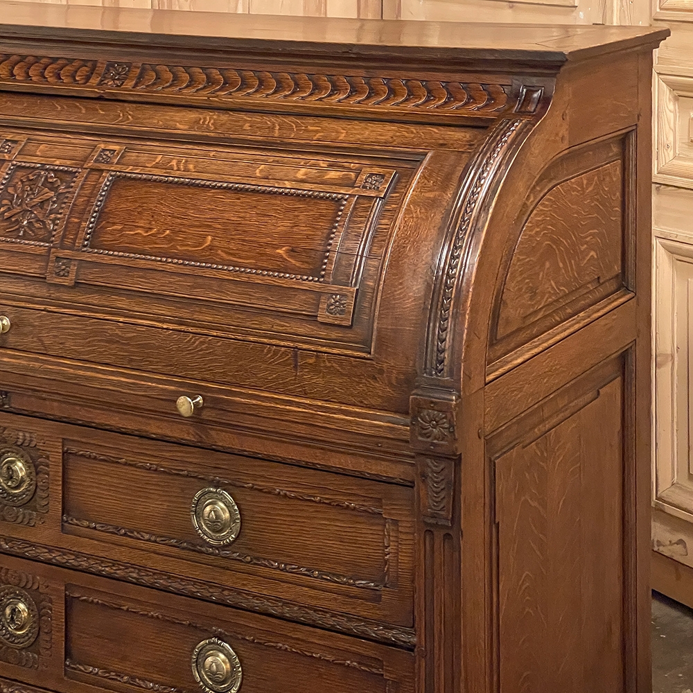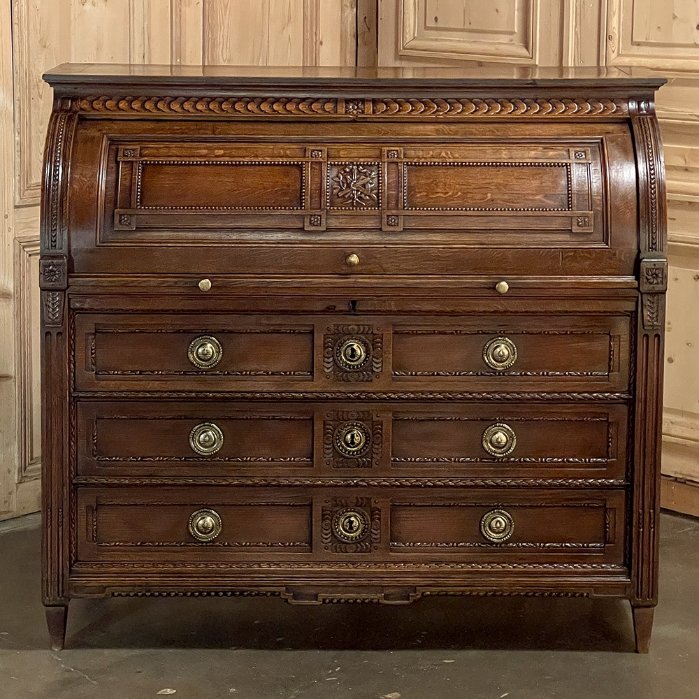 19th Century French Grand Louis XVI Cylinder Desk is the perfect answer to all your modern office needs! Designed on a larger scale than is typical of the genre, it was hand-crafted from solid old-growth oak to last for centuries and features a solid cylindrical upper tier that rolls back into the casework. When open, it reveals a capacious interior with no less than a dozen cubby holes, and a desk surface the pulls out thanks to a pair of brass knobs. The cylinder exterior is carved with motifs inspired by the neoclassical revival of the period, with rectilinear framework accented with rosettes and beading, centered with a square plaque-style carving depicting symbols of engineering and architecture on a foliate & ribbon background. The cylinder is also accessed with a brass knob. Above the cylinder appears a molded trim of Greek coin overlay centered with a rosette, and above that a generous surface for permanent display. The genius of the design also includes three huge full width drawers in the casework below, each framed with complementary motifs and fitted with bronze ring pulls with embossed medallions, centered with bronze key guards in their own Greek coin overlay framing. Wheat trim appears above, on and below the drawers, complementing the cornerposts which are fluted and reeded at the base with wheat motif. At the top of the cornerposts appears more Greek coin overlay and a rosette, in a continuation of the theme. The contoured apron is enhanced with beading, with finely chamfered panels on the sides enhanced with complementary molded detail. Tapered feet provide support.