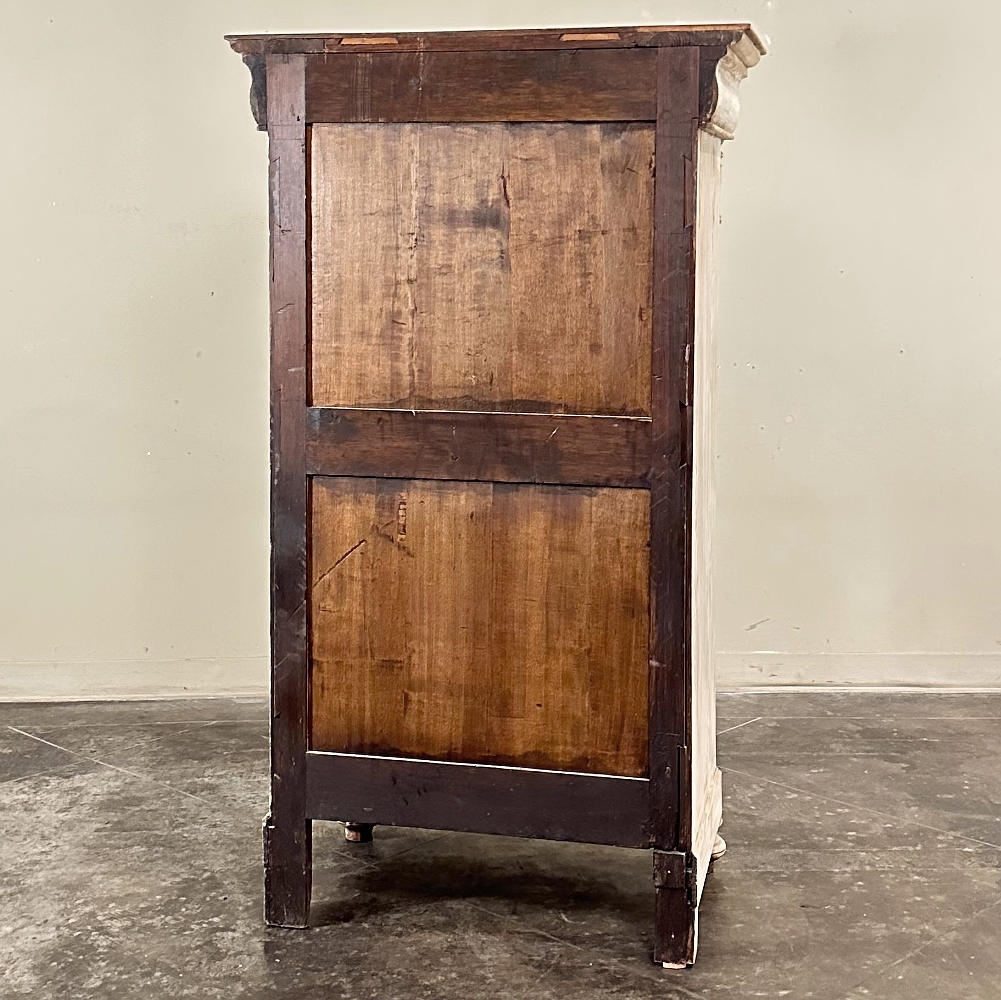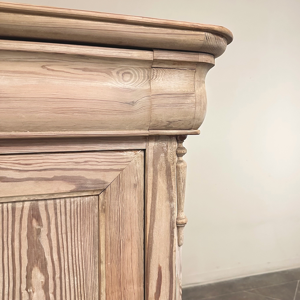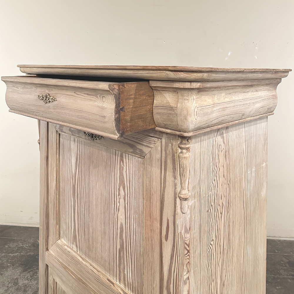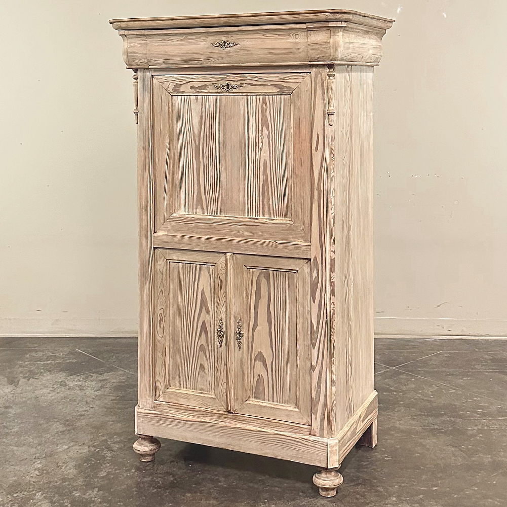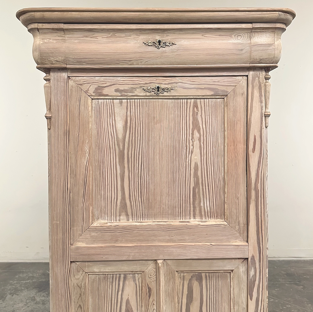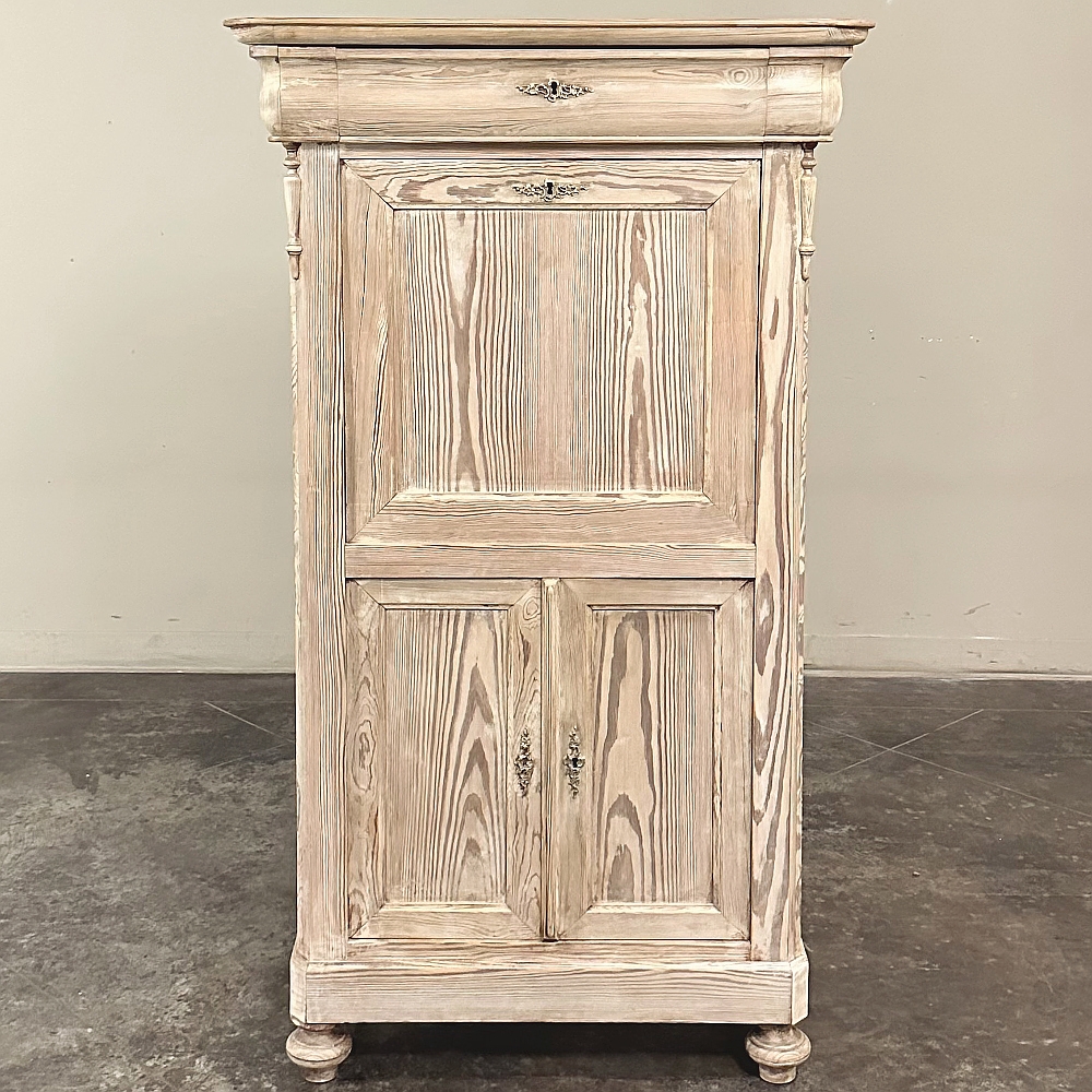 Handcrafted during the 19th century, this 19th Century French Louis Philippe Period Stripped Pine Secretary is ideal for the casual decor with its clean lines and sublime functionality. The tailored lines ensure its compatibility with almost any decor. The classic volute-shaped crown contains a full-width drawer that is situated over the drop front door that opens to reveal a slanted desktop, two cubby hole shelves and a trio of drawers fitted with inset turned knobs. The cabinet doors below open to reveal even more convenient storage! The tailored lines reflect the age which was a radical departure from the indulgences of past kings, and remains popular almost two centuries later due to its ability to subtly blend with almost any decor. Painstakingly stripped using our proprietary process that retains the patina and sheer natural beauty of the old wood, all performed by our expert in-house staff.