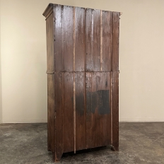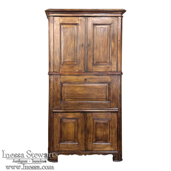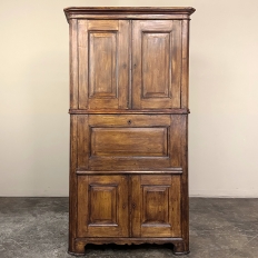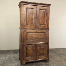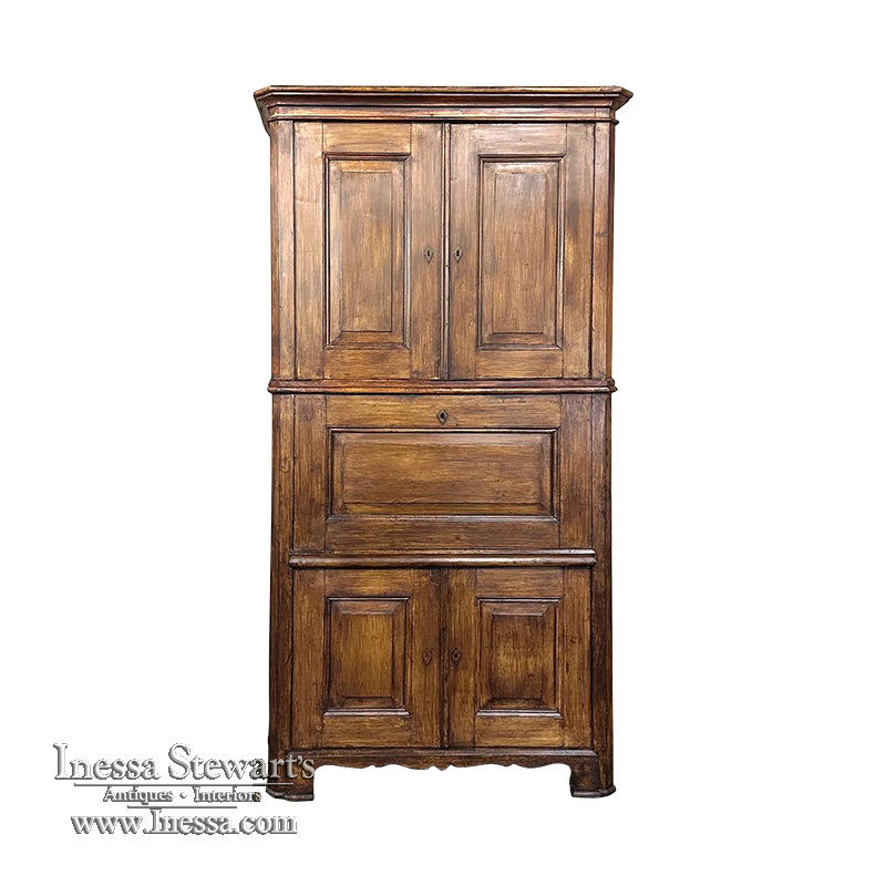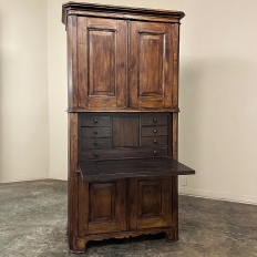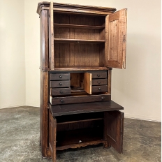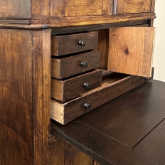 19th Century French Louis Philippe Pine Secretary ~ Bookcase is an unusual combination of tailored elegance melded with a casual impression providing both storage and a work surface, all in one! Hand-crafted from solid pine, it features the trademark classically inspired architecture with a minimum of embellishment found in the molding detail, the mitered corners, and brass key guards. The base features the only scrolled contour with the apron, and pediment style legs provides support. Two surprisingly capacious cabinets are in the design, both above and below, with doors that open without a stile for unimpeded access to the shelves and surfaces within. At the middle, this piece truly stands apart with a drop front panel that opens to create a writing surface, while revealing an interior fitted with a full width drawer, six smaller drawers and even a small cabinet! All drawers are fitted with turned knobs for convenience, making this intriguing piece as functional as it is visually arresting.