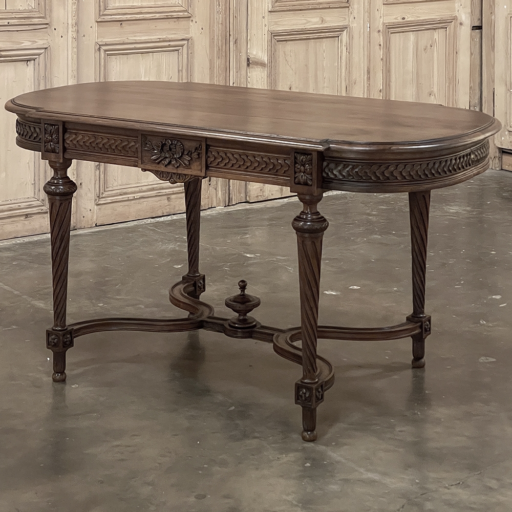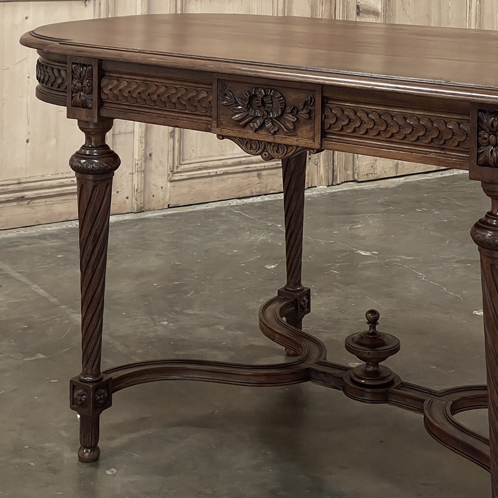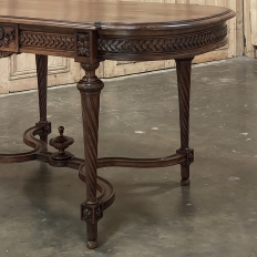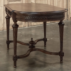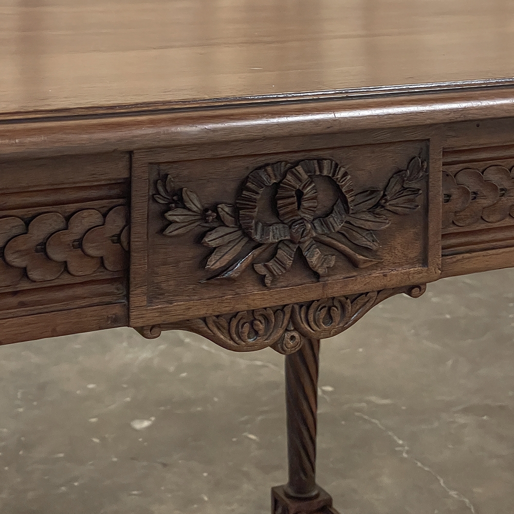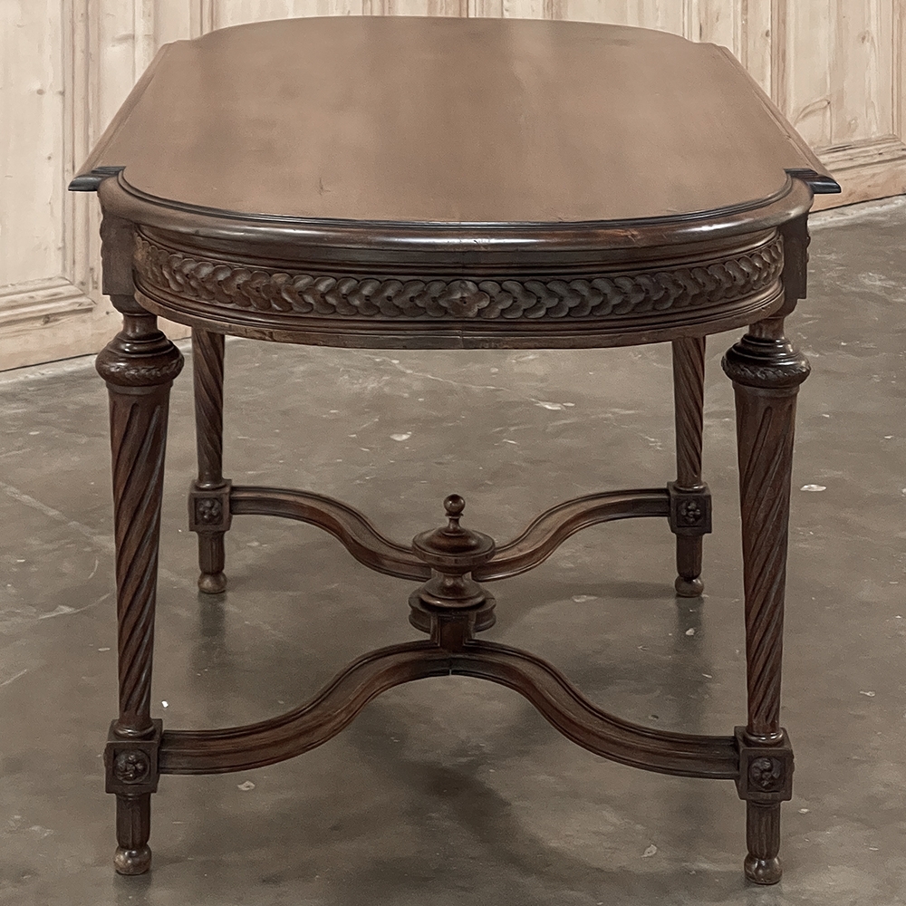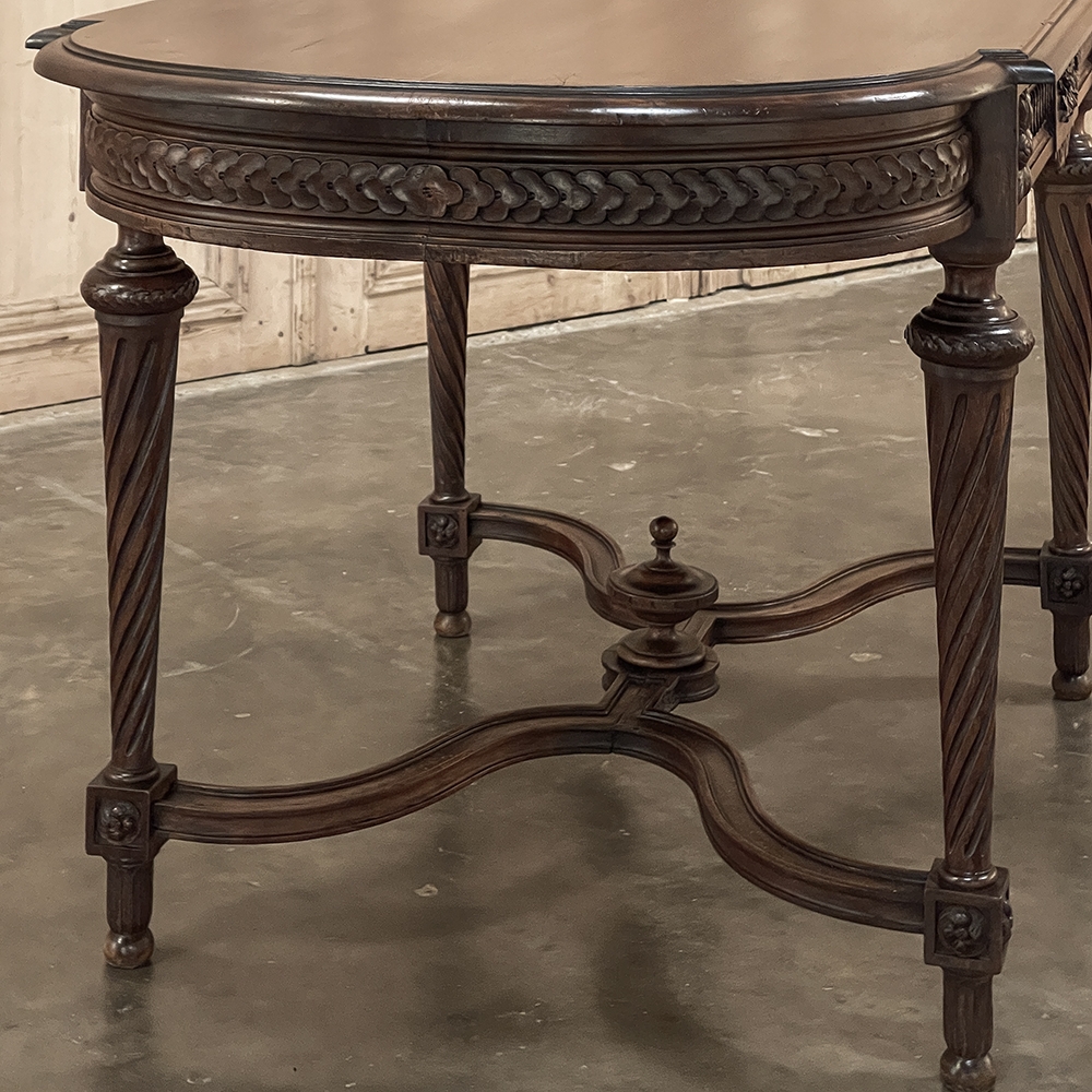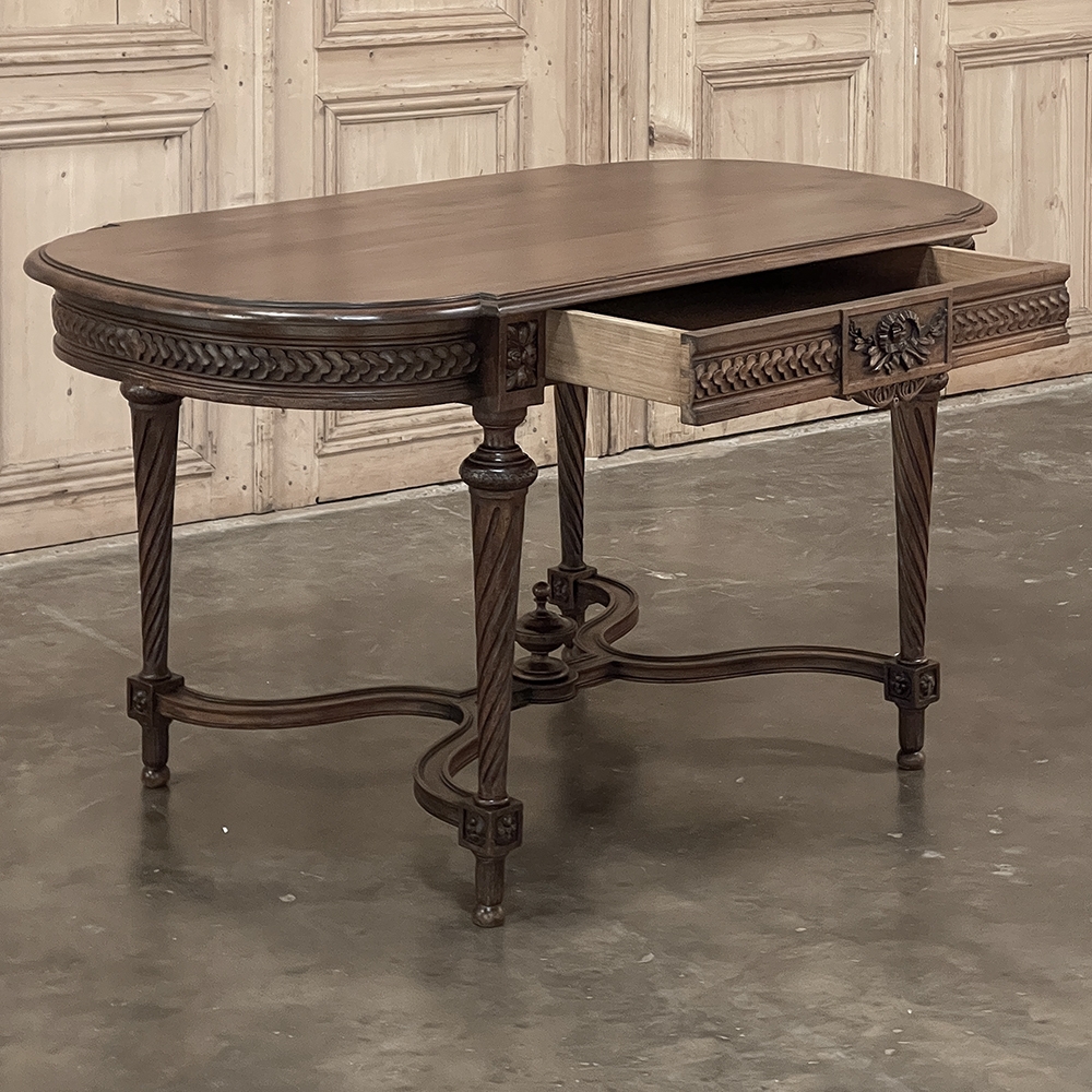 19th Century French Louis XVI Walnut Writing Table combines classic architecture with modern sensibilities creating a table that can be used for a wide variety of purposes, all while exhibiting timeless style! Crafted from beautiful French walnut, it features a uniquely French table top design which consists of a basic rectangle where the short sides have been rounded off in a demilune fashion to completely eliminate sharp corners. The double beveled edging all around only enhances the effect. The apron below is carved completely around as well, featuring a repeating quatrefoil overlay pattern framed by fine molding above and below, and interrupted by plinth blocks above the legs carved with acanthus leaves, all in rich relief. Centered on the long straight sides is a framed segment carved with olive branches held together with flowing ribbon, and an acanthus flourish mounted underneath. The latter serves as the handle to open the spacious and convenient drawer, whereas on the opposite side the carved detail simply serves as symmetrical embellishment. The amazing detail doesn't stop there, as each of the tapered legs is fitted with a laurel wreath collar atop the spiral fluting, leading the eye down to a smaller plinth block also carved with smaller rosettes in relief, serving as the juncture of the feet below carved to depict a bulb with fresh shoots, while also connected to double lyre shaped stretchers that add structural strength in a graceful manner, finished with a turned urn finial at the center.