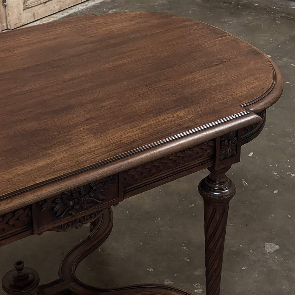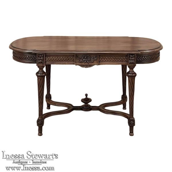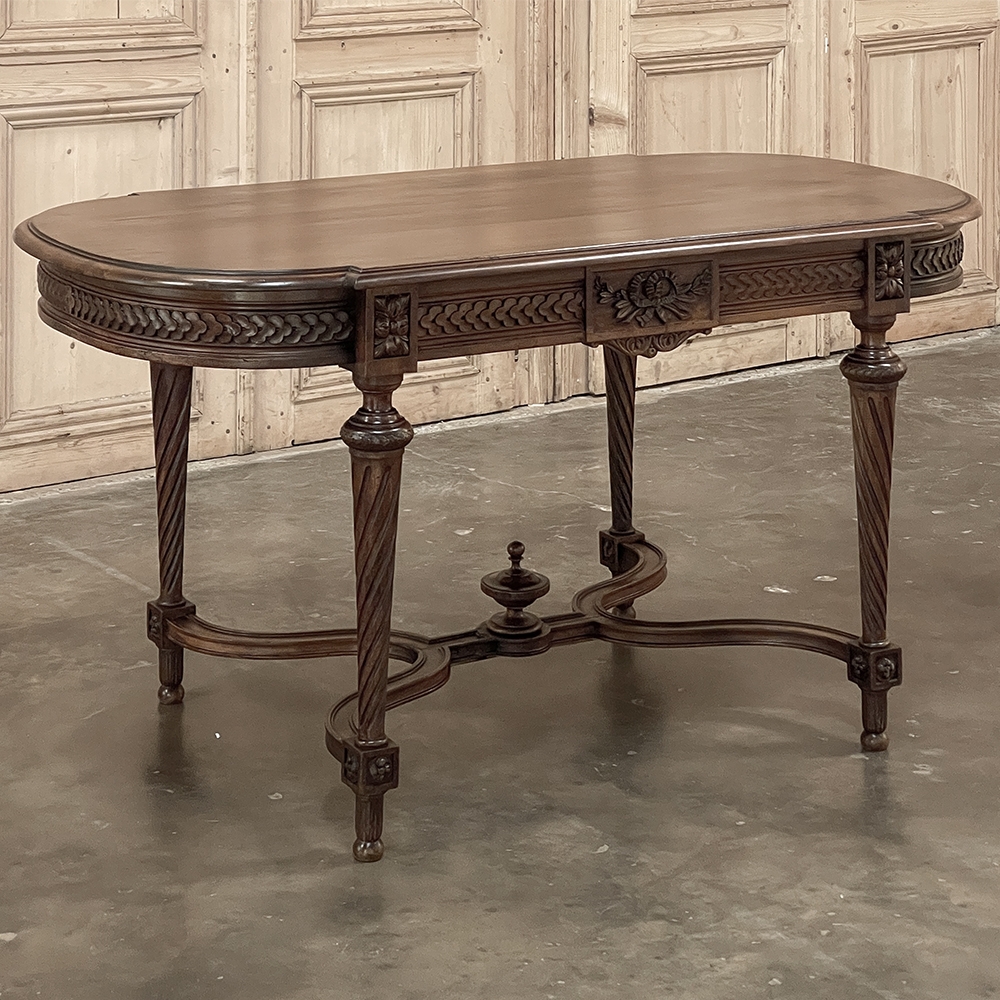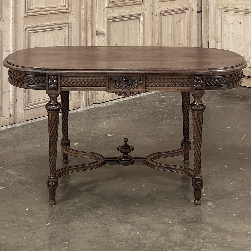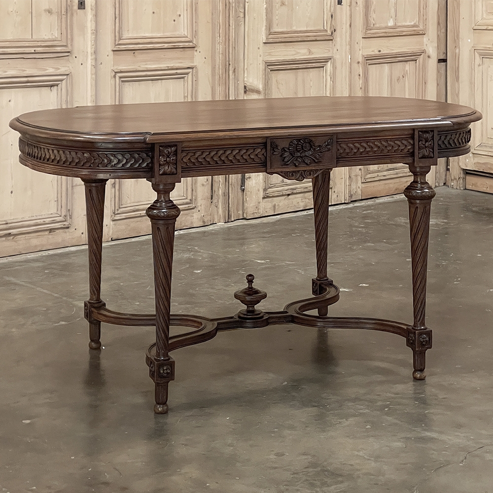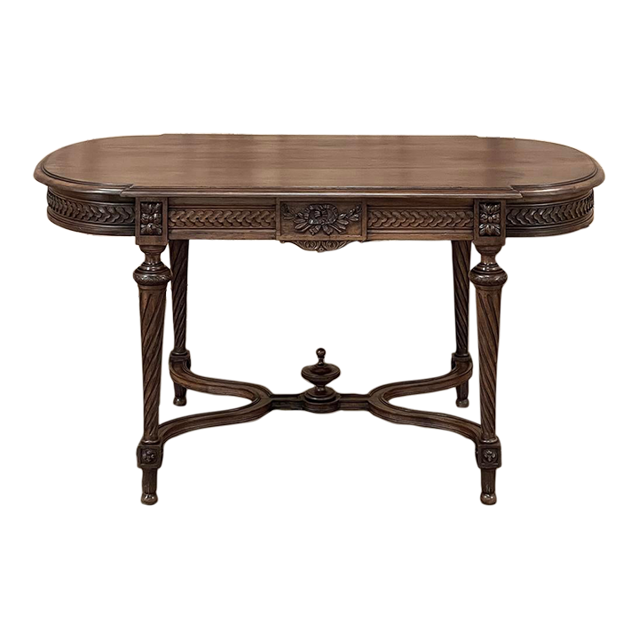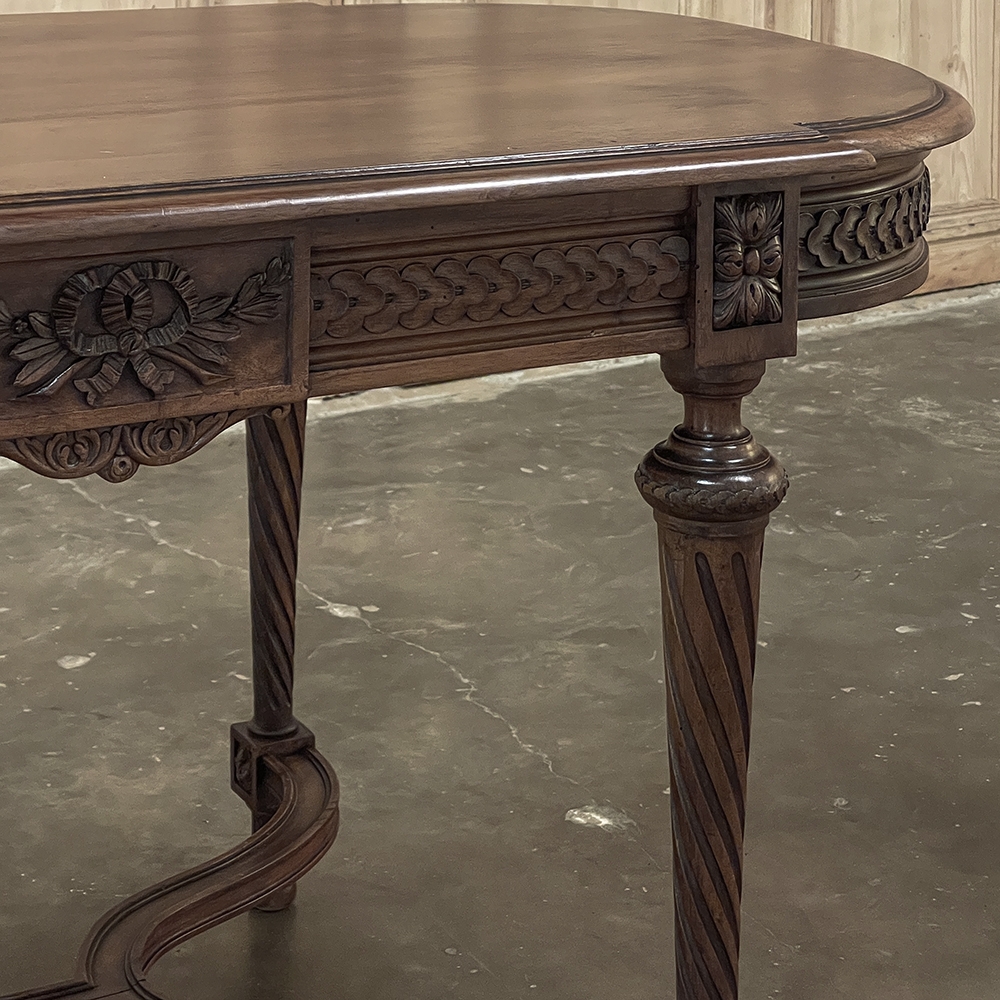 19th Century French Louis XVI Walnut Writing Table combines classic architecture with modern sensibilities creating a table that can be used for a wide variety of purposes, all while exhibiting timeless style! Crafted from beautiful French walnut, it features a uniquely French table top design which consists of a basic rectangle where the short sides have been rounded off in a demilune fashion to completely eliminate sharp corners. The double beveled edging all around only enhances the effect. The apron below is carved completely around as well, featuring a repeating quatrefoil overlay pattern framed by fine molding above and below, and interrupted by plinth blocks above the legs carved with acanthus leaves, all in rich relief. Centered on the long straight sides is a framed segment carved with olive branches held together with flowing ribbon, and an acanthus flourish mounted underneath. The latter serves as the handle to open the spacious and convenient drawer, whereas on the opposite side the carved detail simply serves as symmetrical embellishment. The amazing detail doesn't stop there, as each of the tapered legs is fitted with a laurel wreath collar atop the spiral fluting, leading the eye down to a smaller plinth block also carved with smaller rosettes in relief, serving as the juncture of the feet below carved to depict a bulb with fresh shoots, while also connected to double lyre shaped stretchers that add structural strength in a graceful manner, finished with a turned urn finial at the center.
