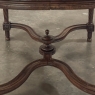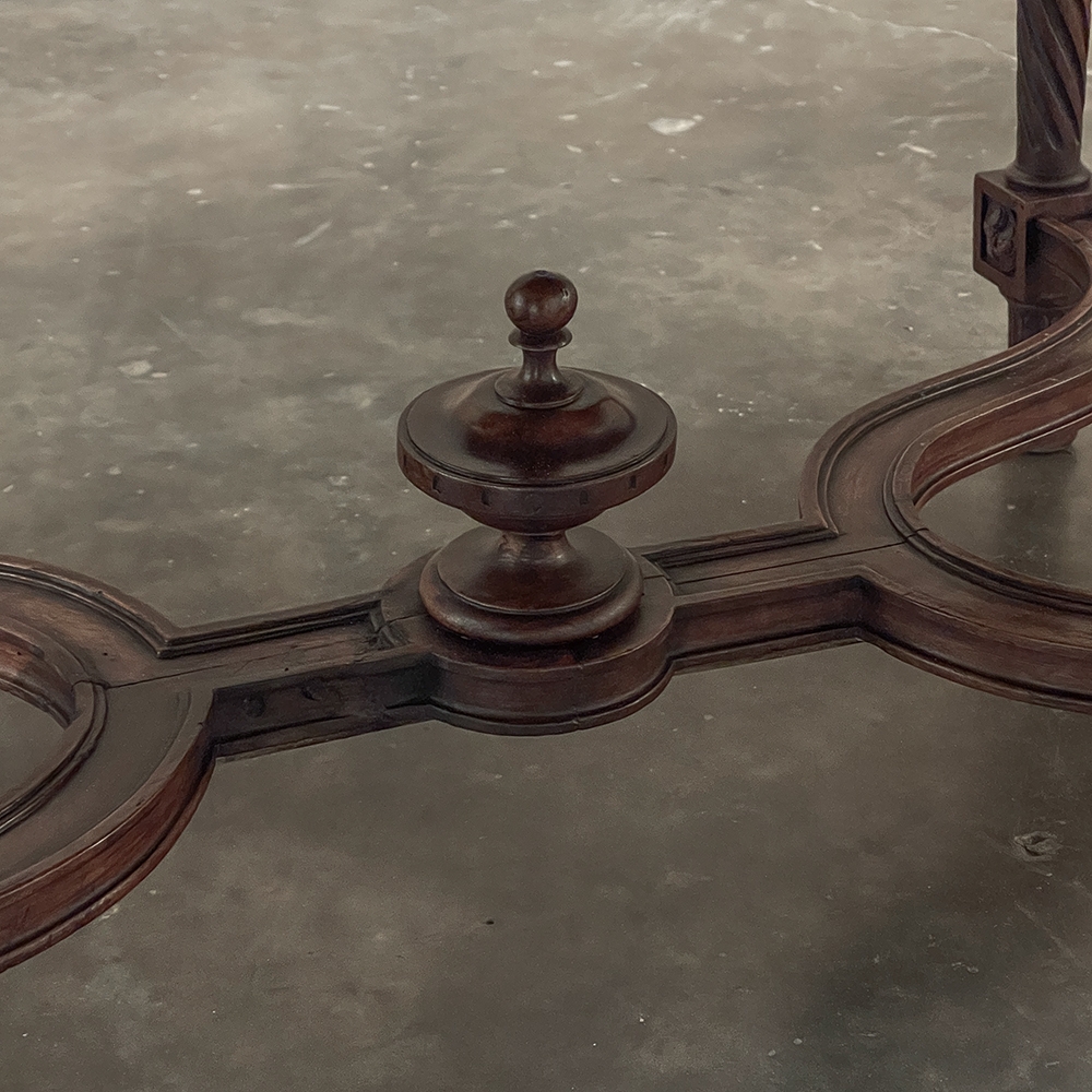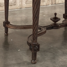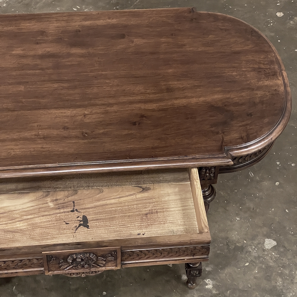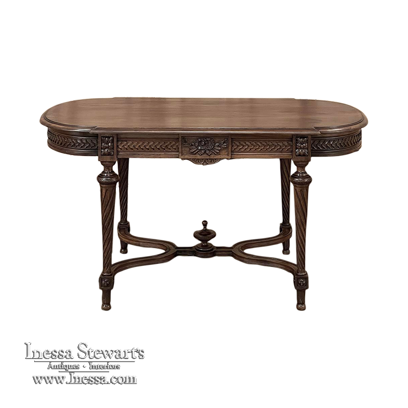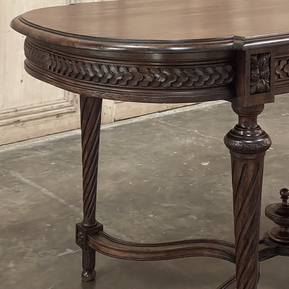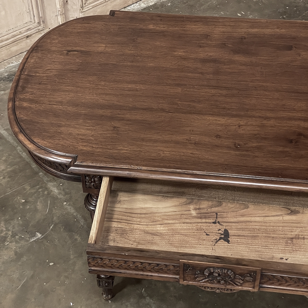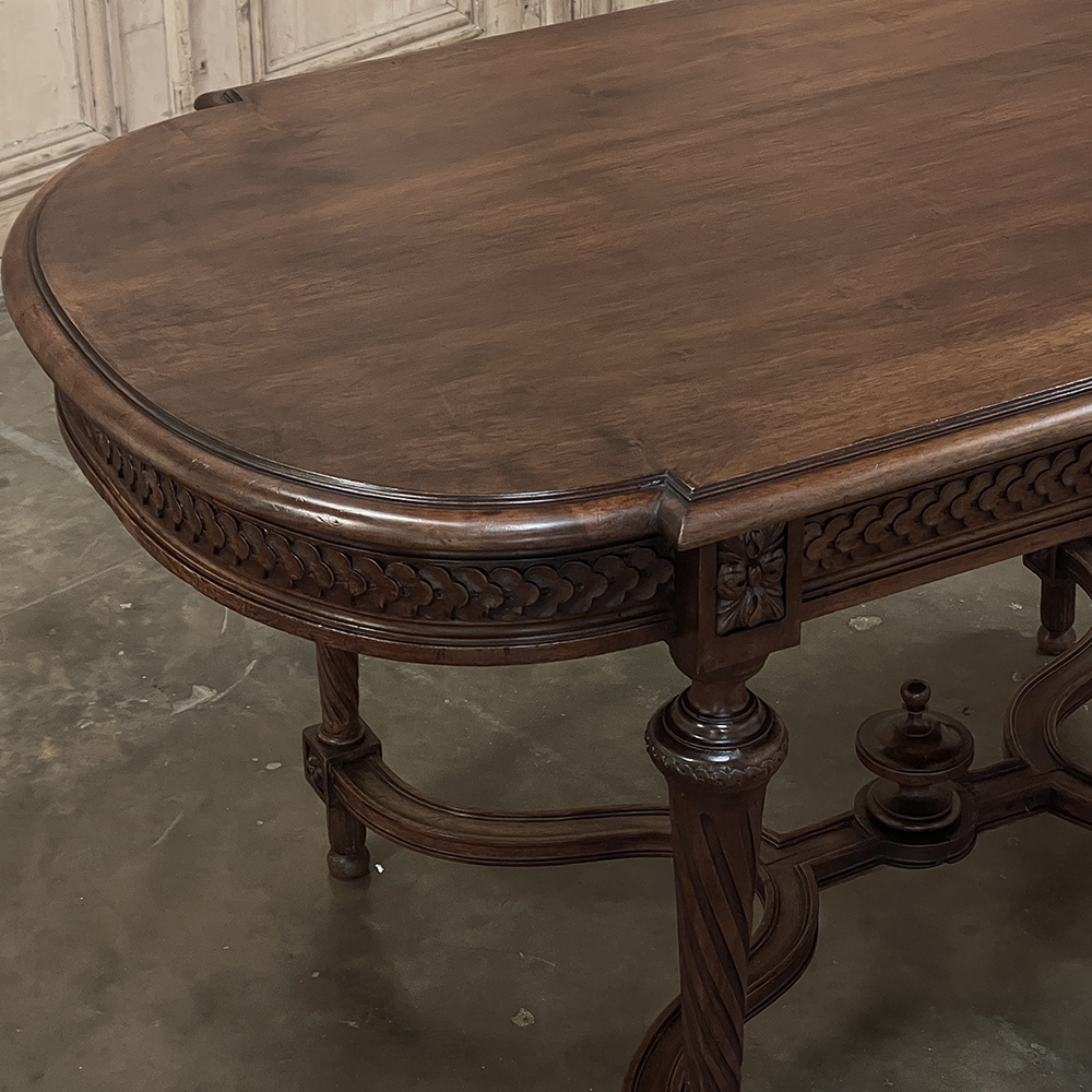 19th Century French Louis XVI Walnut Writing Table combines classic architecture with modern sensibilities creating a table that can be used for a wide variety of purposes, all while exhibiting timeless style! Crafted from beautiful French walnut, it features a uniquely French table top design which consists of a basic rectangle where the short sides have been rounded off in a demilune fashion to completely eliminate sharp corners. The double beveled edging all around only enhances the effect. The apron below is carved completely around as well, featuring a repeating quatrefoil overlay pattern framed by fine molding above and below, and interrupted by plinth blocks above the legs carved with acanthus leaves, all in rich relief. Centered on the long straight sides is a framed segment carved with olive branches held together with flowing ribbon, and an acanthus flourish mounted underneath. The latter serves as the handle to open the spacious and convenient drawer, whereas on the opposite side the carved detail simply serves as symmetrical embellishment. The amazing detail doesn't stop there, as each of the tapered legs is fitted with a laurel wreath collar atop the spiral fluting, leading the eye down to a smaller plinth block also carved with smaller rosettes in relief, serving as the juncture of the feet below carved to depict a bulb with fresh shoots, while also connected to double lyre shaped stretchers that add structural strength in a graceful manner, finished with a turned urn finial at the center.
