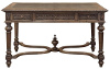 19th Century French Neoclassical Walnut Desk ~ Double Faced is a design that is perfect for placement anywhere in the room! Lavished on all four sides with French style Greek coin motif in bold relief, it features acanthus rosettes on each corner and turned wood drawer pulls on the outer drawers, with a keyhole access for the center drawer, all of which boast the same Greek coin design. Support is provided by four sturdy tapered and fluted column legs which are further reinforced with lyre-shaped stretchers below that allow for maximum foot room, and are embellished with a bold turned finial for visual interest below. The fully gadrooned top, all hand-carved of course, surrounds the leather top desk which sports gold embossing all around in amazing condition.