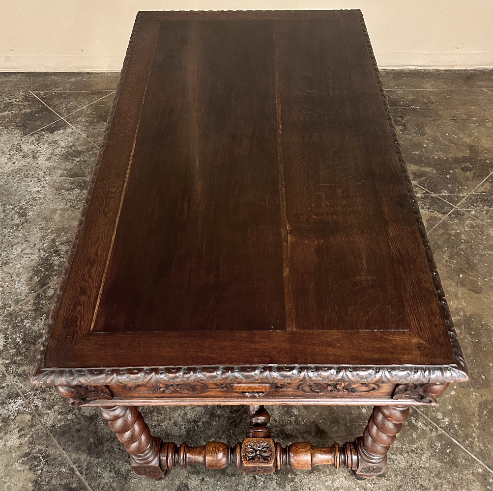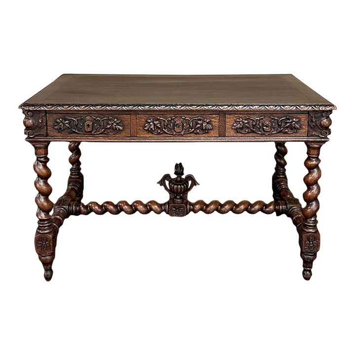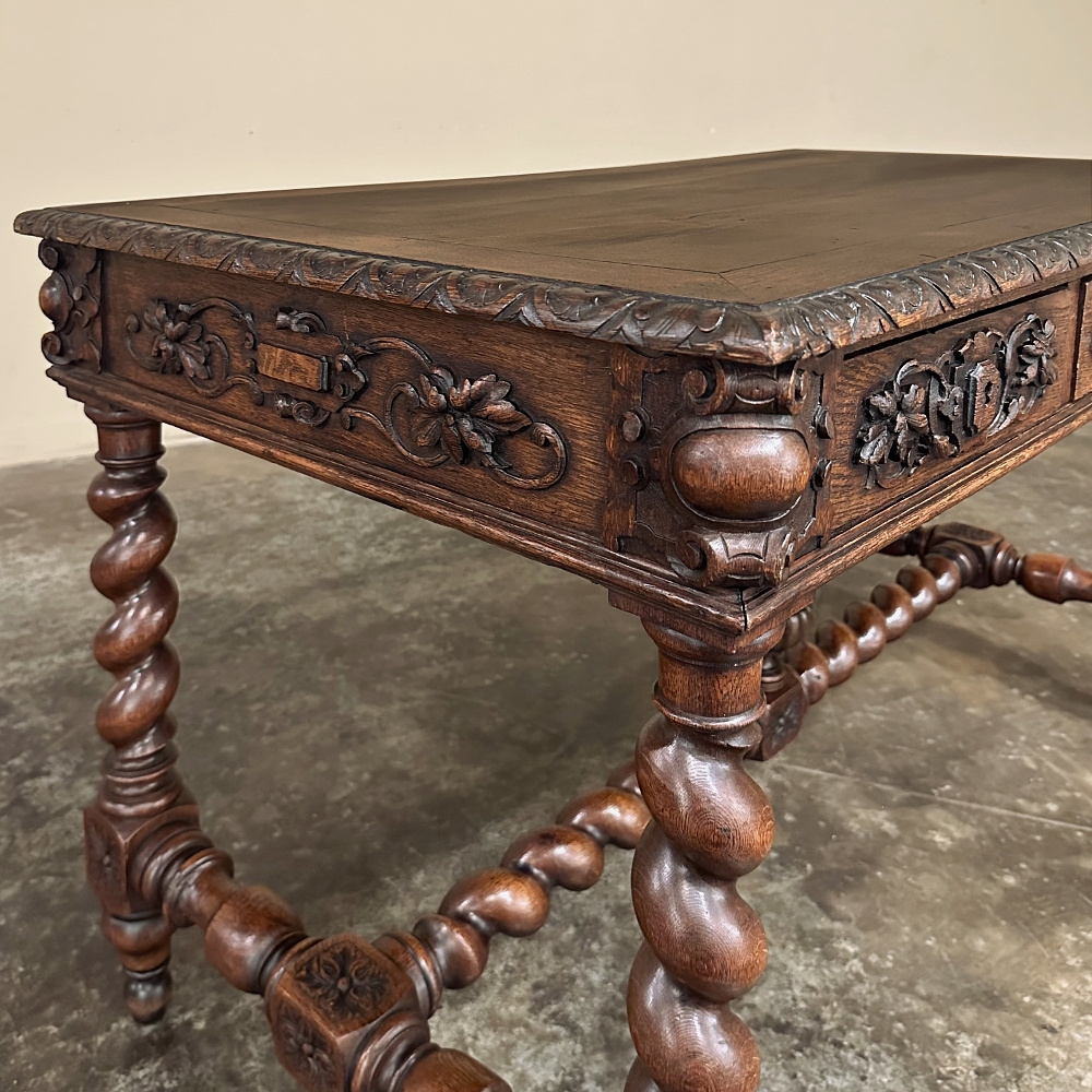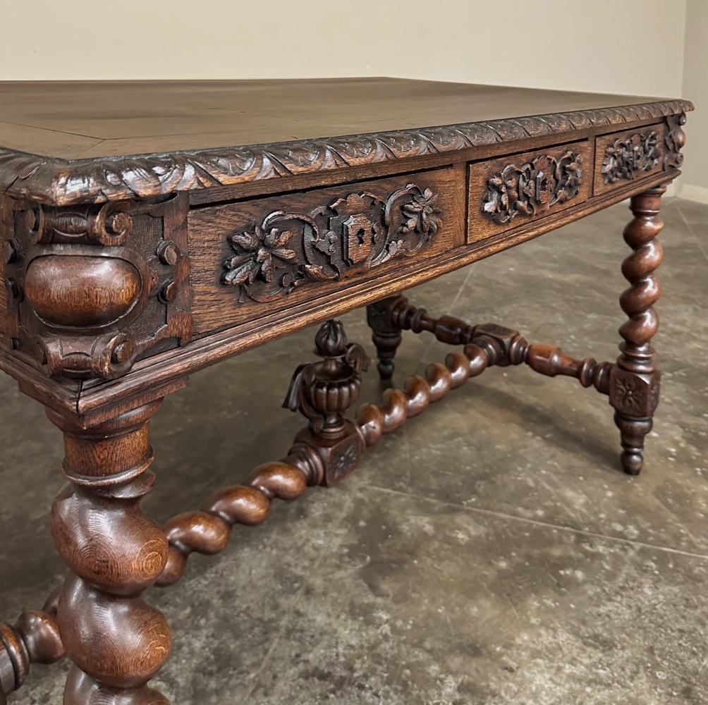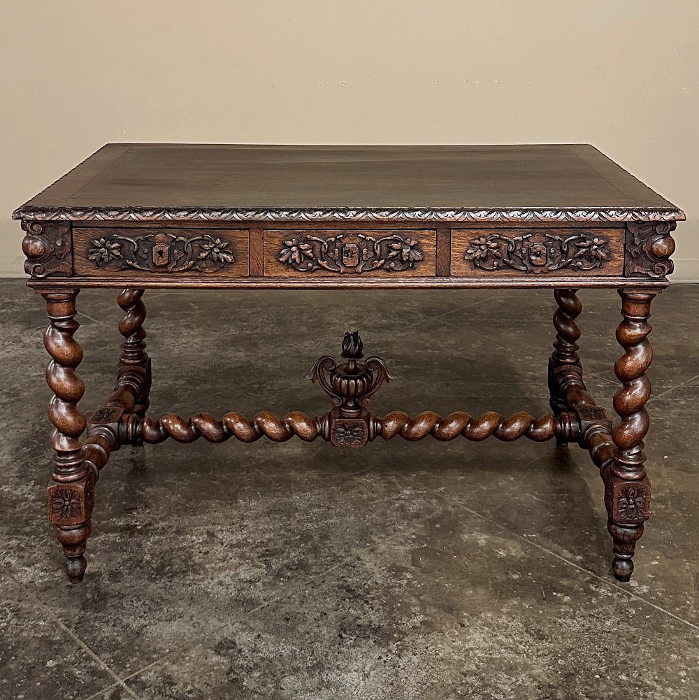 19th Century French Renaissance Barley Twist Desk ~ Bureau Plat is a splendid example of the period, and unusual for having three drawers. Hand-crafted and sculpted from old-growth oak, it features a fully gadrooned top edge overlooking the casework below which consists of the drawer tier, and relief carving on all four sides. Each corner features a three dimensional corbel treatment to soften the sharp edges. The carved motifs include stylized grapevine foliates and crests, with each drawer sporting its own separate carved detail while the opposite side, the "front" presented to the room, features a single continuous carved embellishment. Clockwise and counter-clockwise barley twist columns provide support, and are connected with an "H" stretcher with a twist (pardon the pun), with rosettes on all the connecting plinth blocks and barley twists meeting at the center plinth block which boasts a bold flaming urn finial with winged handles to create visual interest. Ideal for the home office, student desk or ancillary table.