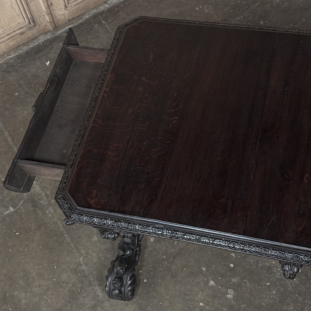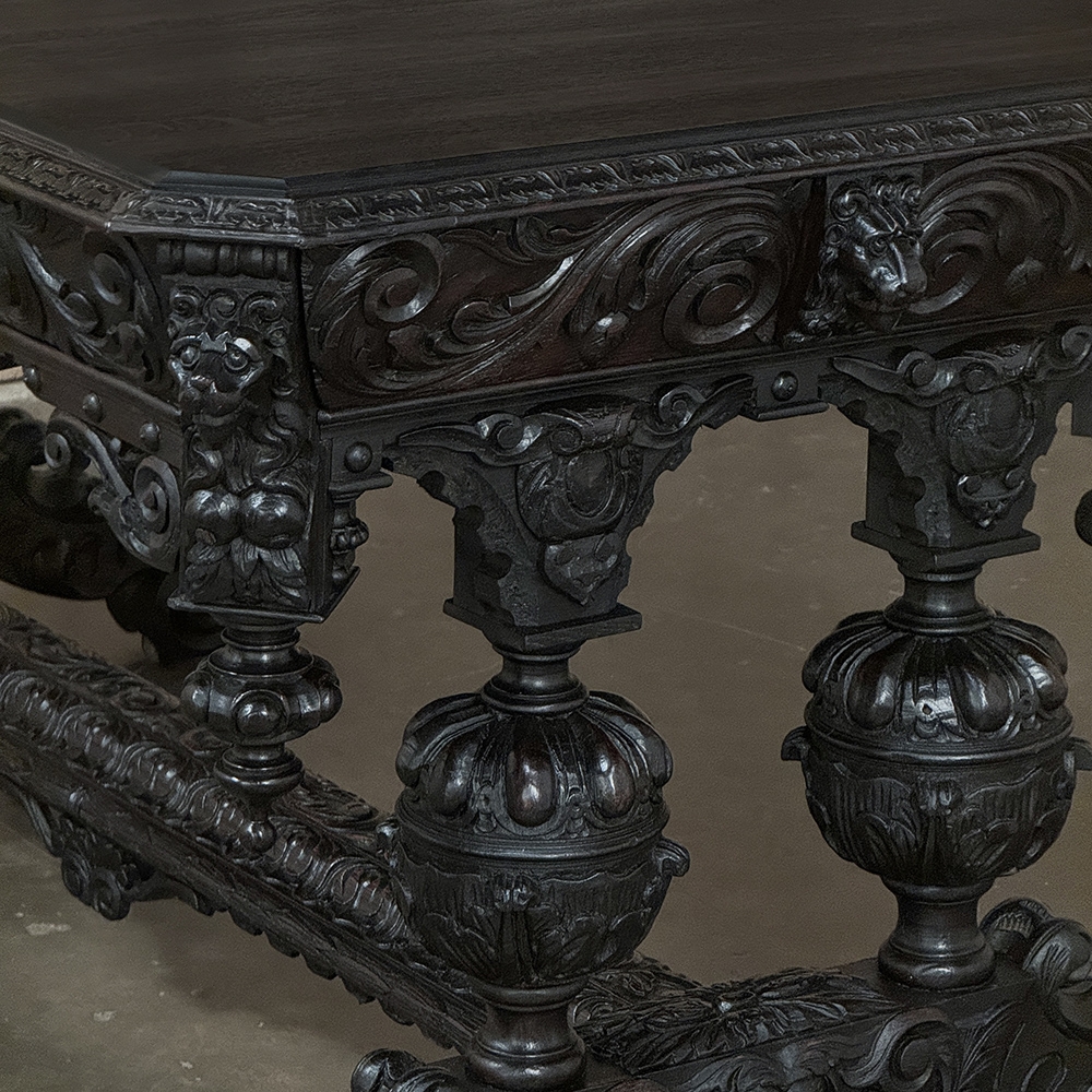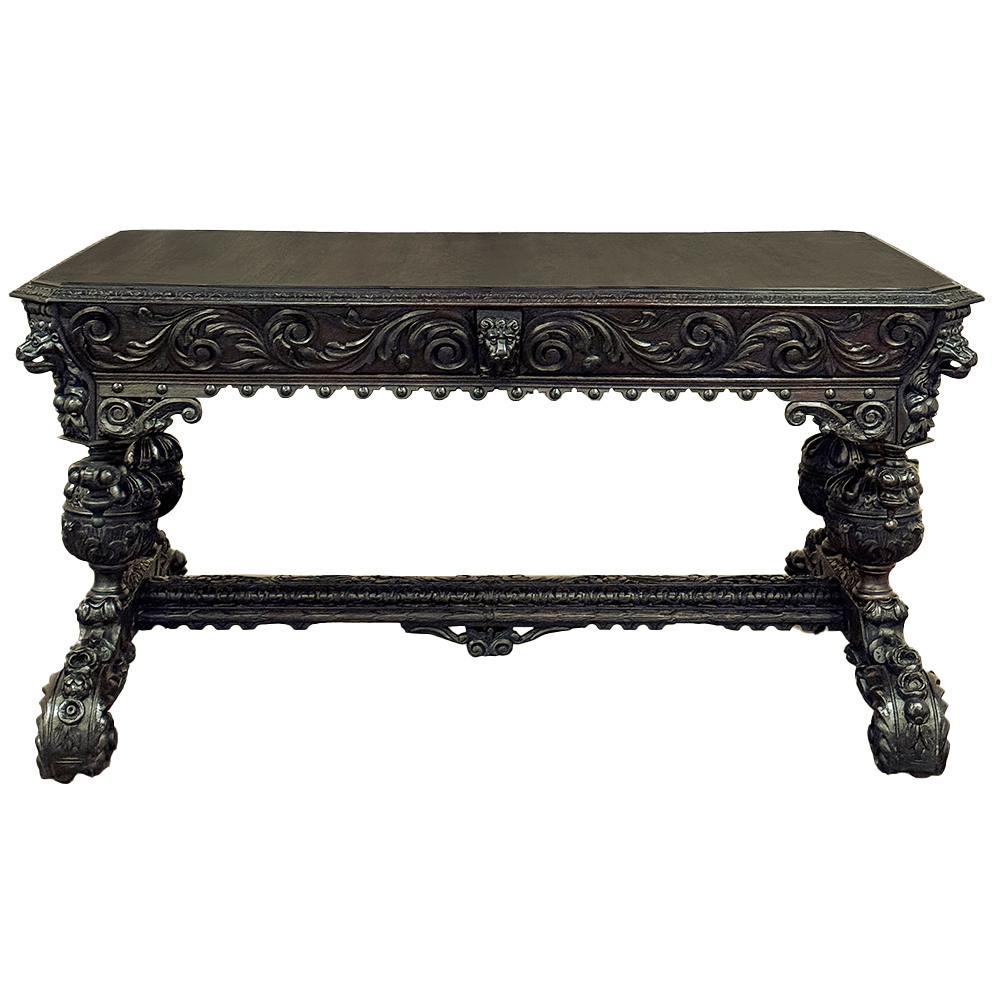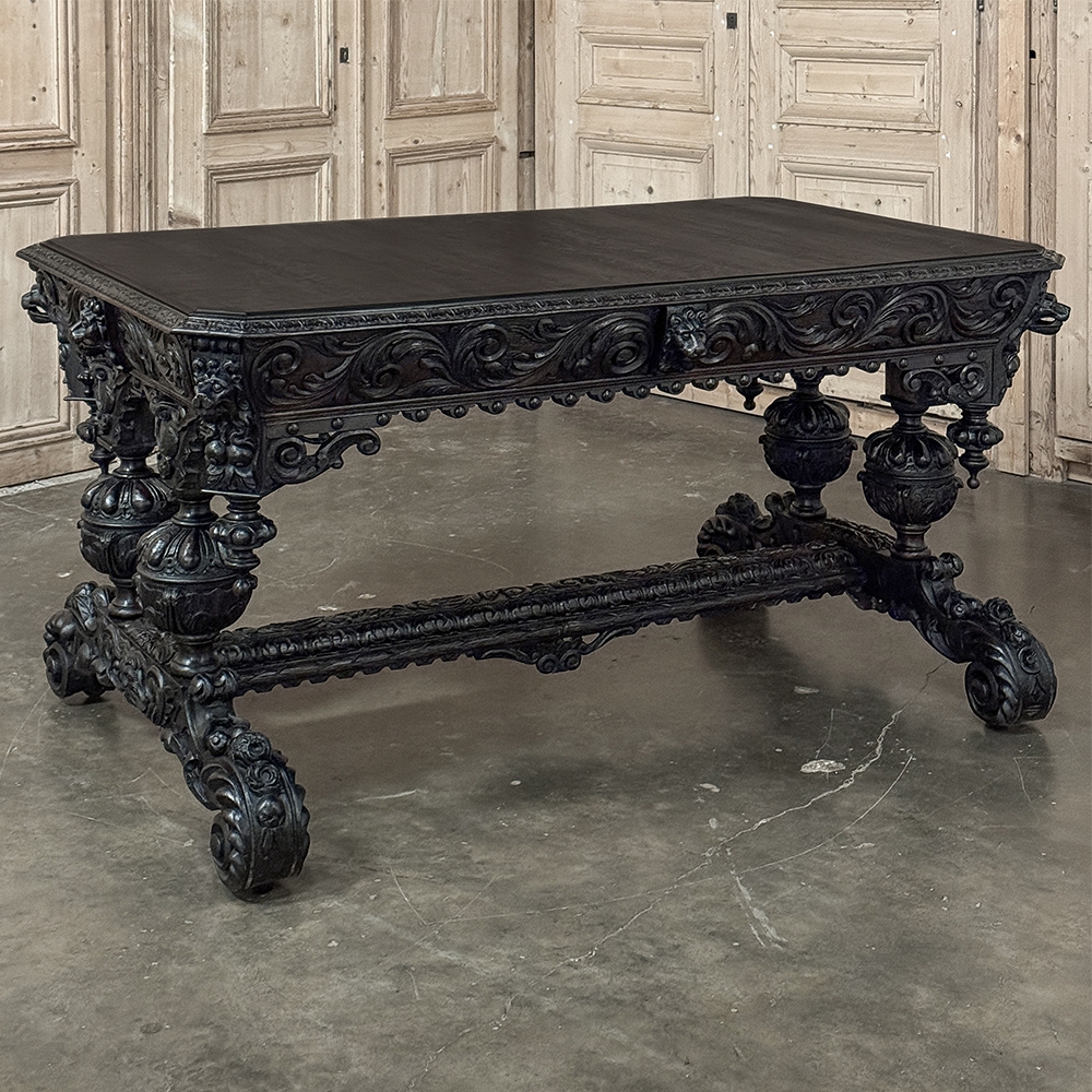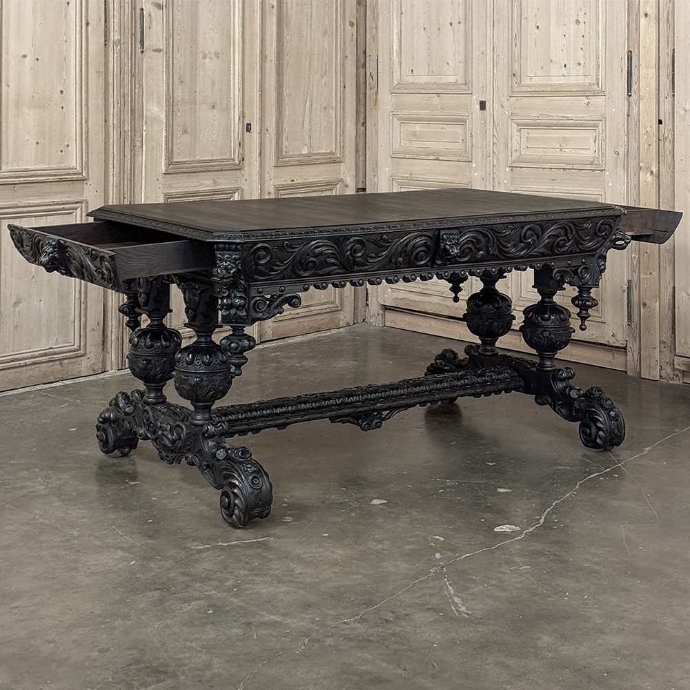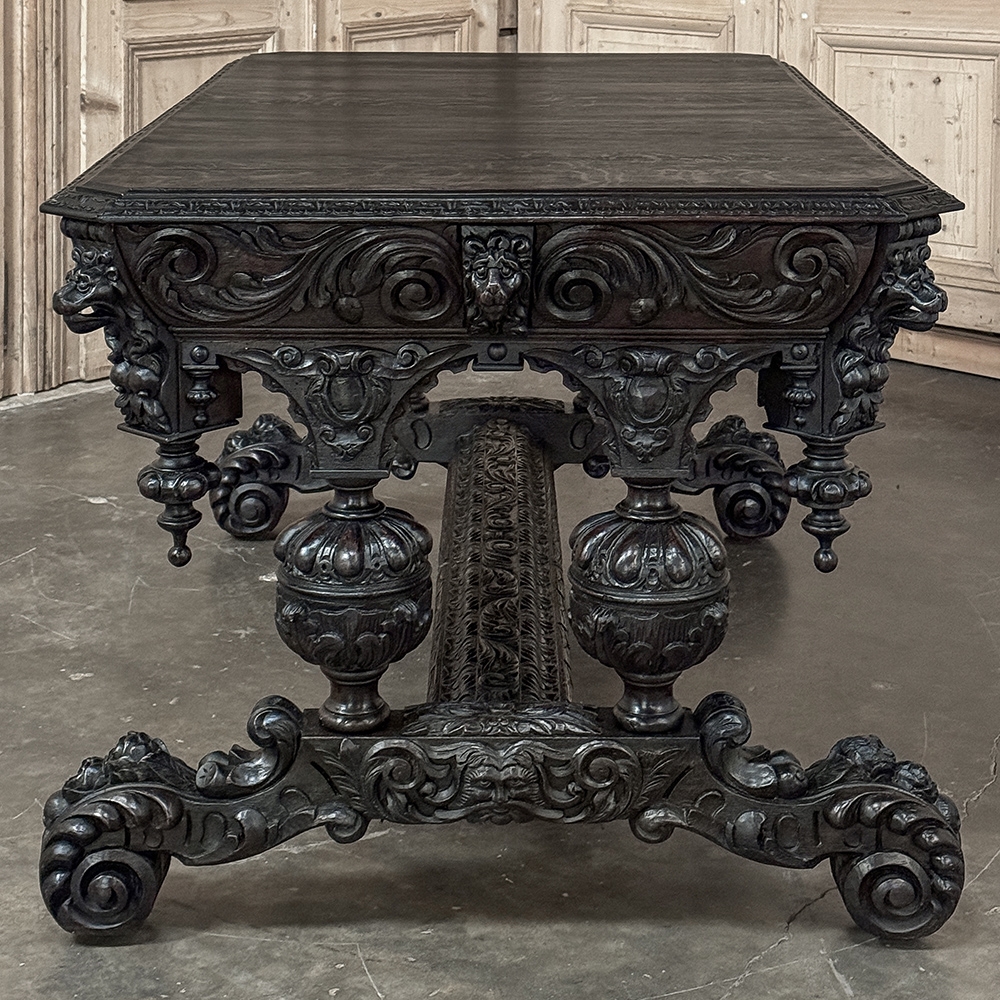 19th Century French Renaissance Revival Desk is a magnificent example of master cabinetmaking by French artisans from the 1850s to the end of the century. Utilizing hand-select old-growth oak, the artisans fashioned a solid plank top with mitered corners, and a double beveled edge all around with cove over acanthus gadrooning. The apron immediately below is carved all around with bold foliate scrolls, interrupted by lions' heads on the corners, and at the centers of each side for a total of eight full relief lions' heads! Underneath the corners are carvings with acanthus corbels and finely carved pendant finials. Two drawers are cleverly concealed on the sides, accessible by pulling on the lions' heads. A drapery trim style border finishes the bottom of the apron on the long sides, while on the short sides, the apron becomes arched colonnades carved with heraldic crests transitioning to the four massive urn pedestal style legs, each carved all around with fanciful relief. The pedestals are mounted upon an elaborately styled but classic "H" structure, consisting of boldly scrolled legs festooned with acanthus plumes and floral sprays, centered with a Norseman's face. Behind the Norsemen is a boldly carved trestle centered on the design providing elegant stability with a flourish! Because it's completely finished all around it can be placed anywhere in the room, where it can immediately be impressing your guests and family, as well as providing a source of pride that only a masterwork like this can accomplish!