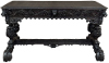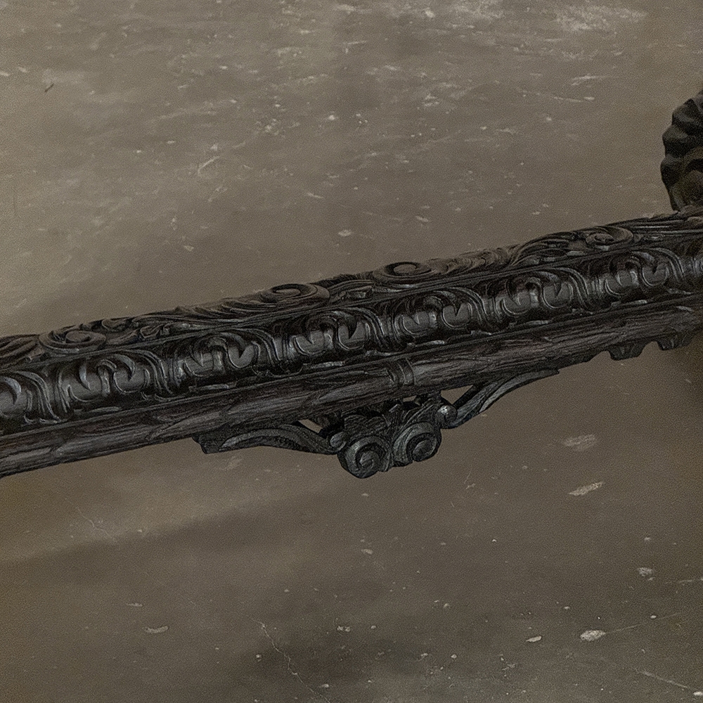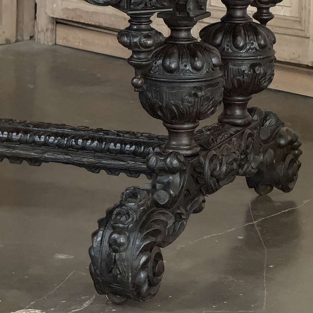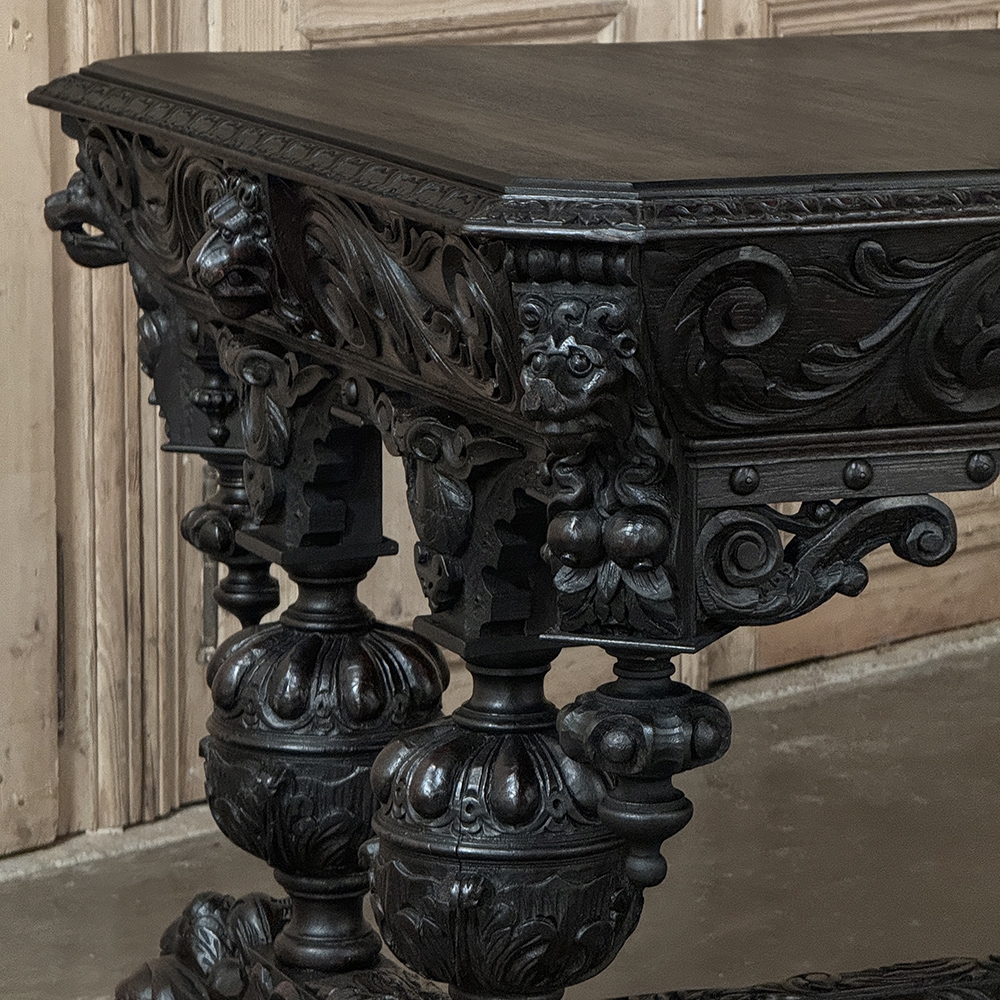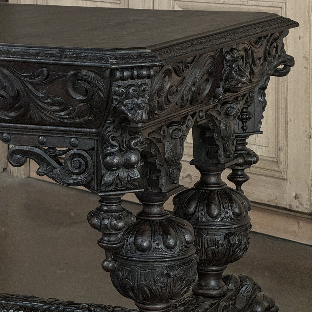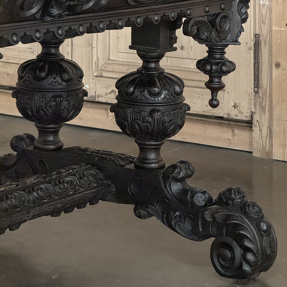 19th Century French Renaissance Revival Desk is a magnificent example of master cabinetmaking by French artisans from the 1850s to the end of the century. Utilizing hand-select old-growth oak, the artisans fashioned a solid plank top with mitered corners, and a double beveled edge all around with cove over acanthus gadrooning. The apron immediately below is carved all around with bold foliate scrolls, interrupted by lions' heads on the corners, and at the centers of each side for a total of eight full relief lions' heads! Underneath the corners are carvings with acanthus corbels and finely carved pendant finials. Two drawers are cleverly concealed on the sides, accessible by pulling on the lions' heads. A drapery trim style border finishes the bottom of the apron on the long sides, while on the short sides, the apron becomes arched colonnades carved with heraldic crests transitioning to the four massive urn pedestal style legs, each carved all around with fanciful relief. The pedestals are mounted upon an elaborately styled but classic "H" structure, consisting of boldly scrolled legs festooned with acanthus plumes and floral sprays, centered with a Norseman's face. Behind the Norsemen is a boldly carved trestle centered on the design providing elegant stability with a flourish! Because it's completely finished all around it can be placed anywhere in the room, where it can immediately be impressing your guests and family, as well as providing a source of pride that only a masterwork like this can accomplish!