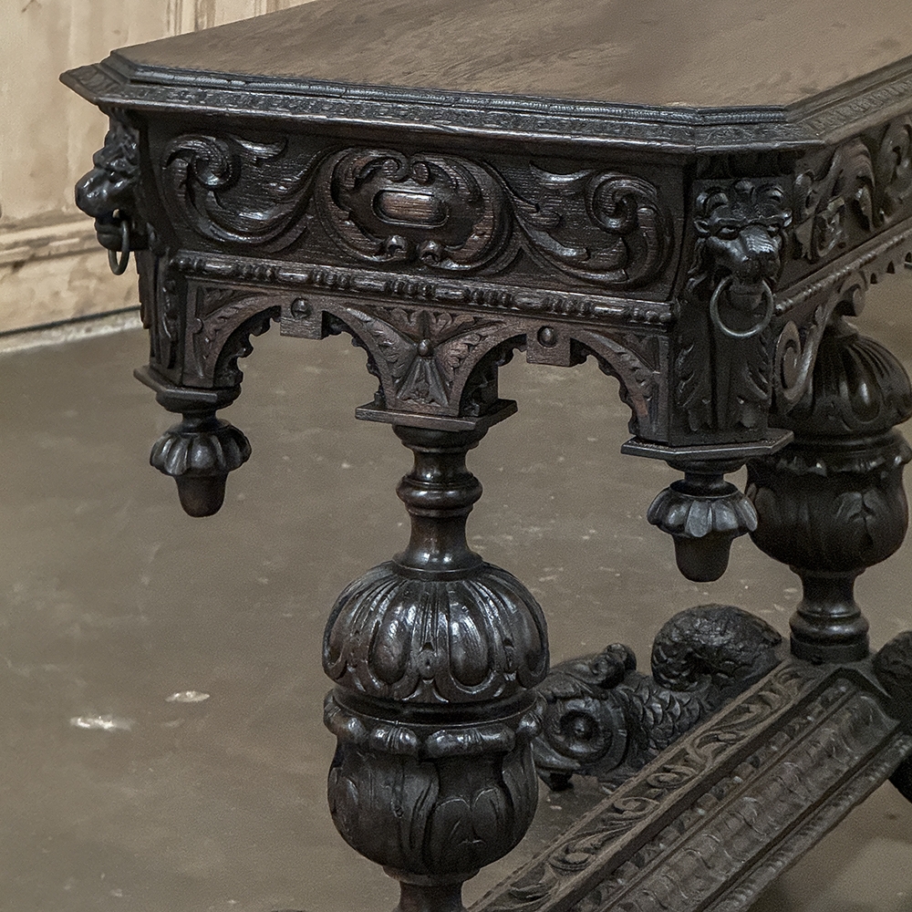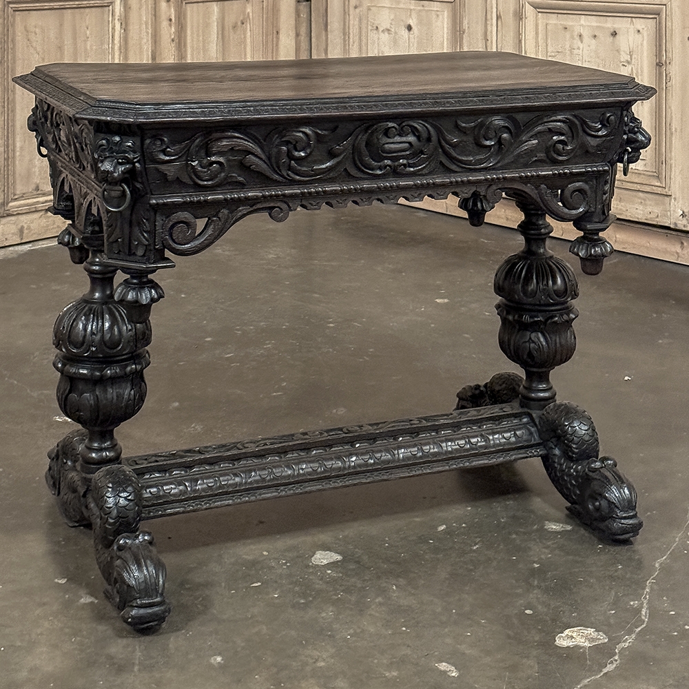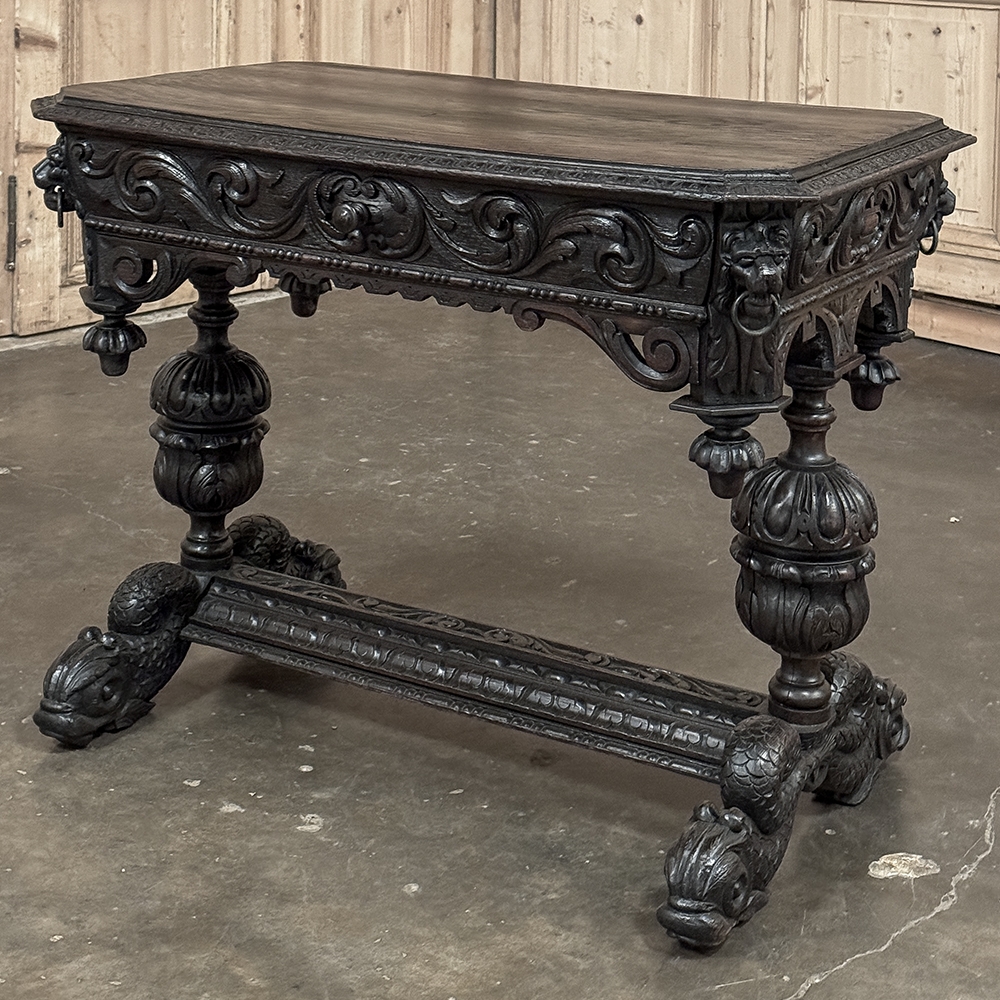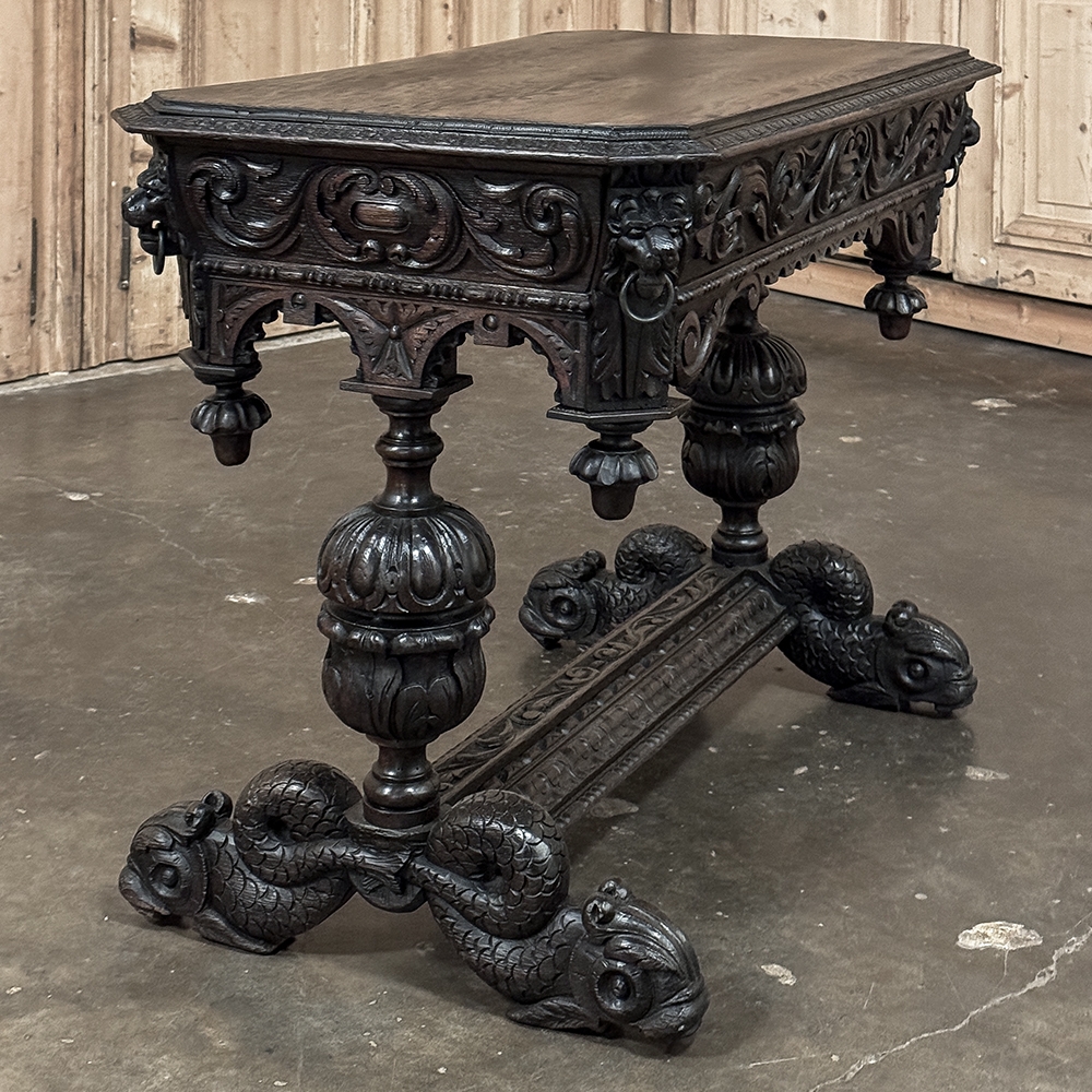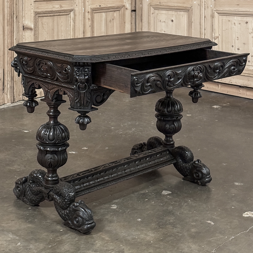 19th Century French Renaissance Writing Desk ~ End Table is a work of the sculptor's art, that also serves as a convenient student desk, writing table or library table. Hand-carved from solid oak, it features a plank top with elaborately carved edge treatment, mitered on the corners to soften the effect on the room's traffic patterns. The apron below is carved on all four sides with amazing foliate scrolls in bold relief, with a full width drawer on one side that is revealed only by the turned wooden knob. On the aforementioned mitered corners we see lions' heads in full relief mounted on corbel structures with carved pendant finials. Arch and scrollwork form the apron, and the entire casework is supported by a brace of boldly carved urn pedestals. The pedestals in turn are mounted to a classic "H" frame structure below, but with amazing foliate carvings across the trestle, and four dolphins fancifully carved to serve as the feet. Carved all around so it can even serve in the middle of a room!