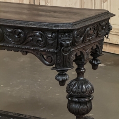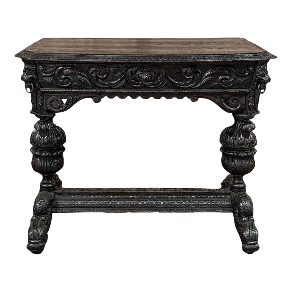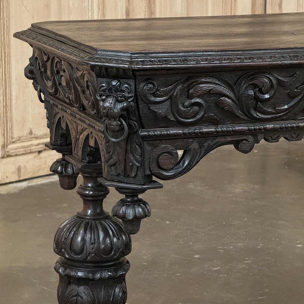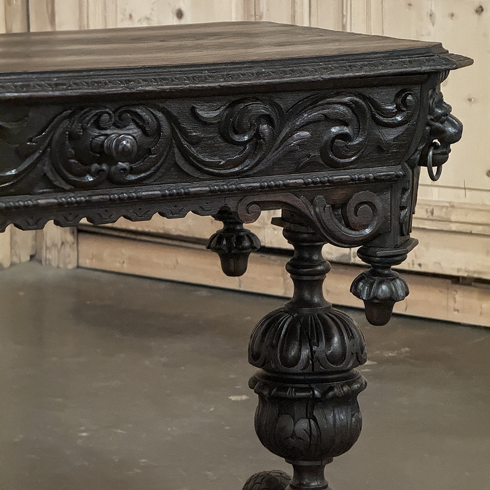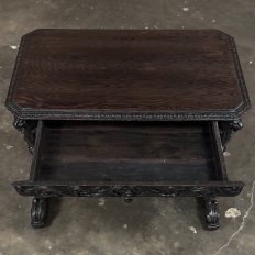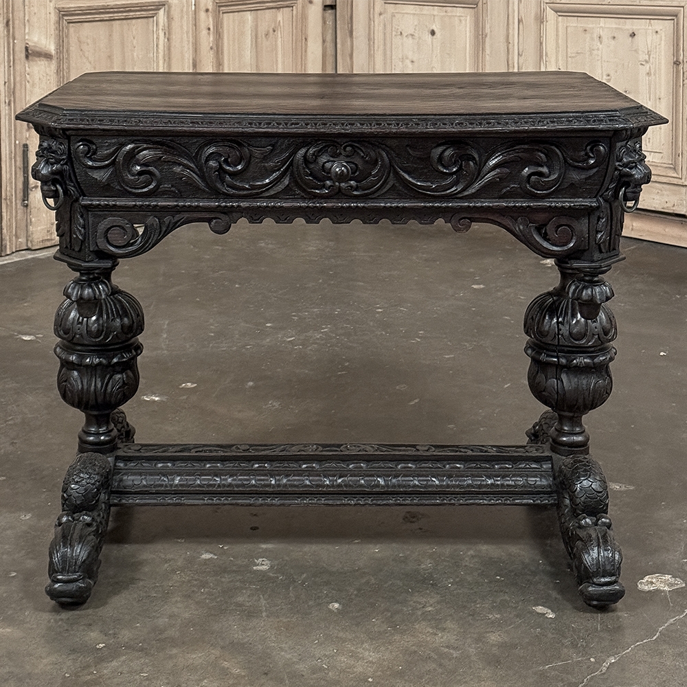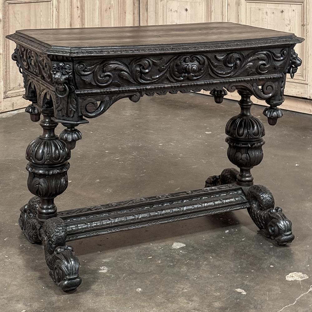 19th Century French Renaissance Writing Desk ~ End Table is a work of the sculptor's art, that also serves as a convenient student desk, writing table or library table. Hand-carved from solid oak, it features a plank top with elaborately carved edge treatment, mitered on the corners to soften the effect on the room's traffic patterns. The apron below is carved on all four sides with amazing foliate scrolls in bold relief, with a full width drawer on one side that is revealed only by the turned wooden knob. On the aforementioned mitered corners we see lions' heads in full relief mounted on corbel structures with carved pendant finials. Arch and scrollwork form the apron, and the entire casework is supported by a brace of boldly carved urn pedestals. The pedestals in turn are mounted to a classic "H" frame structure below, but with amazing foliate carvings across the trestle, and four dolphins fancifully carved to serve as the feet. Carved all around so it can even serve in the middle of a room!