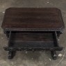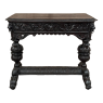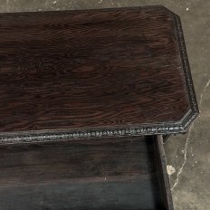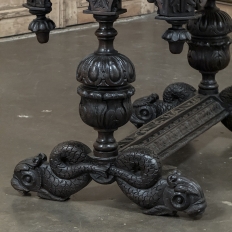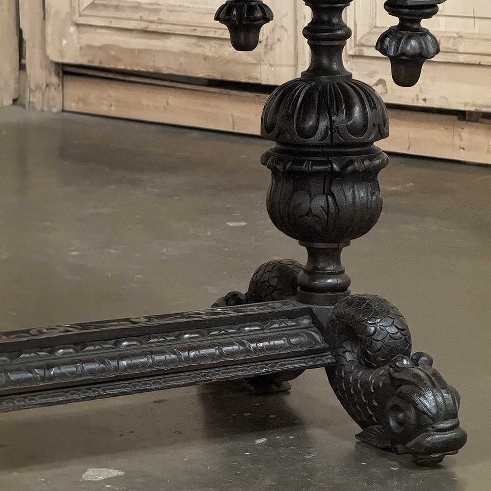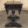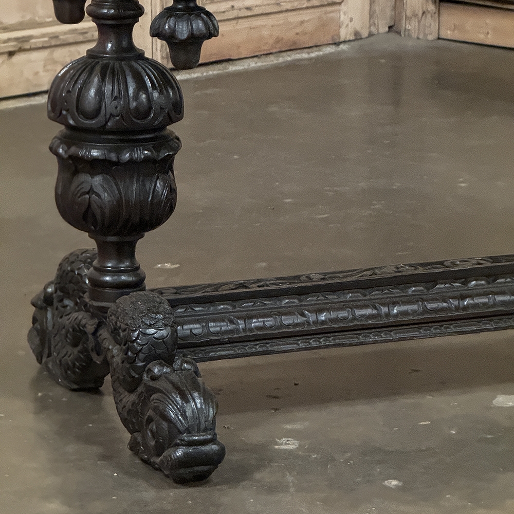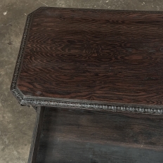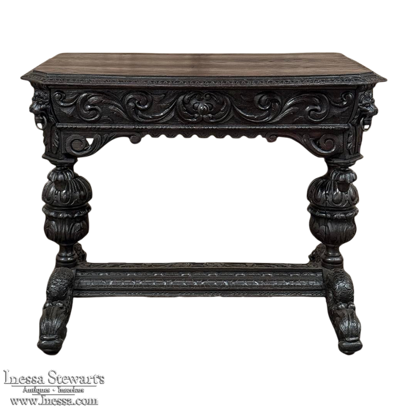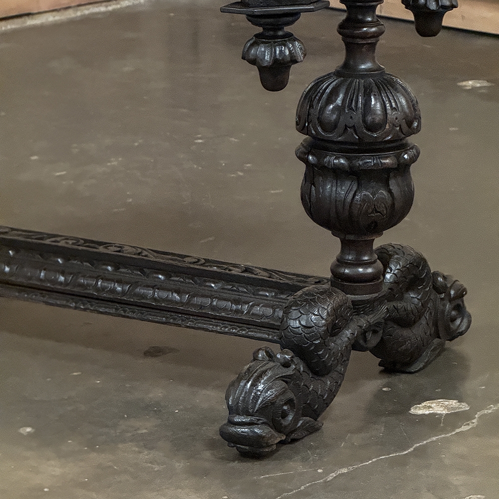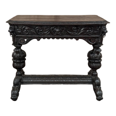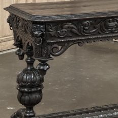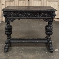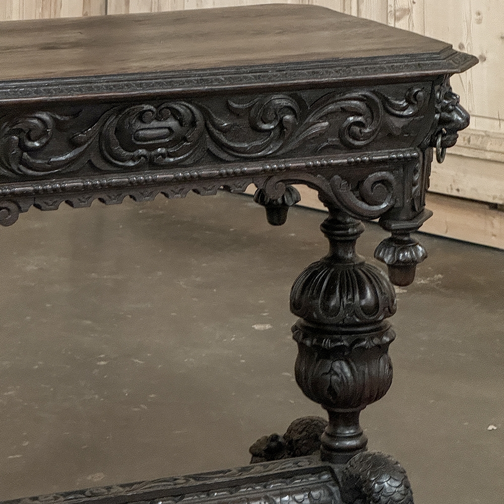 19th Century French Renaissance Writing Desk ~ End Table is a work of the sculptor's art, that also serves as a convenient student desk, writing table or library table. Hand-carved from solid oak, it features a plank top with elaborately carved edge treatment, mitered on the corners to soften the effect on the room's traffic patterns. The apron below is carved on all four sides with amazing foliate scrolls in bold relief, with a full width drawer on one side that is revealed only by the turned wooden knob. On the aforementioned mitered corners we see lions' heads in full relief mounted on corbel structures with carved pendant finials. Arch and scrollwork form the apron, and the entire casework is supported by a brace of boldly carved urn pedestals. The pedestals in turn are mounted to a classic "H" frame structure below, but with amazing foliate carvings across the trestle, and four dolphins fancifully carved to serve as the feet. Carved all around so it can even serve in the middle of a room!