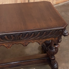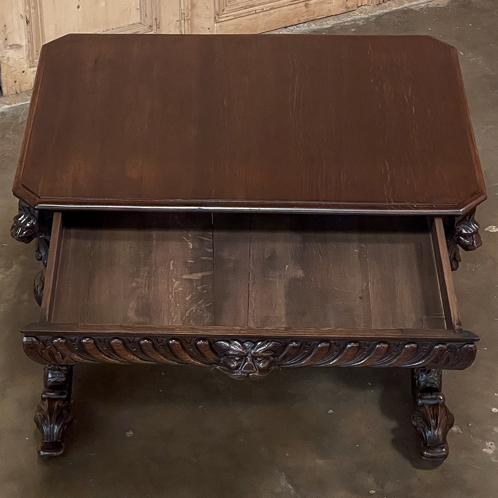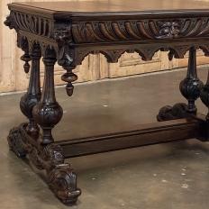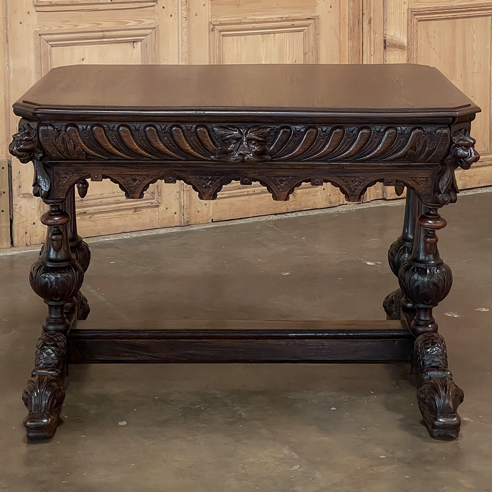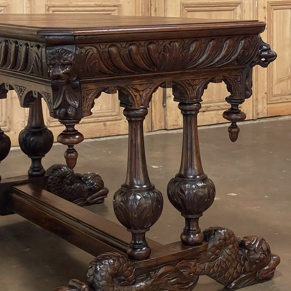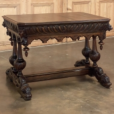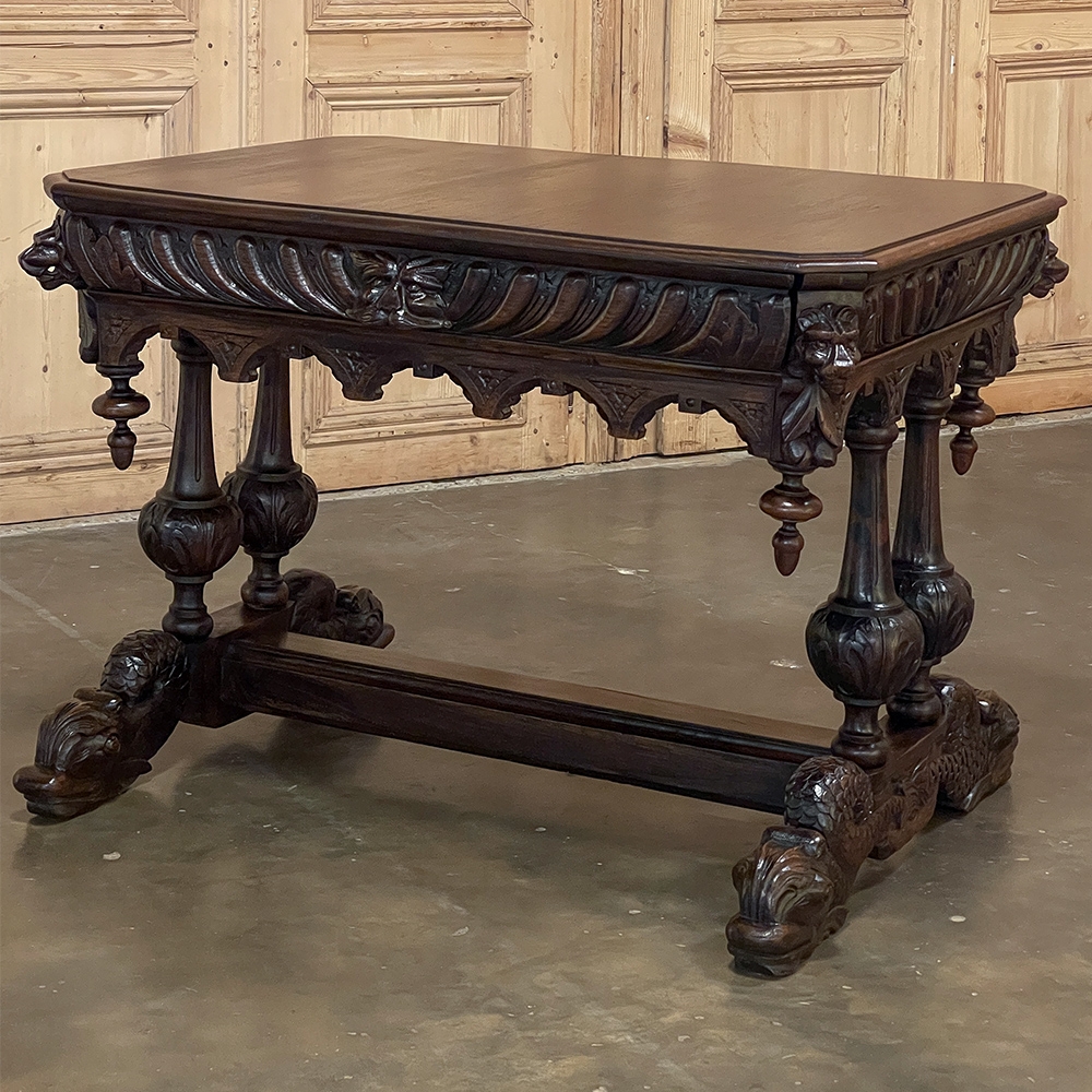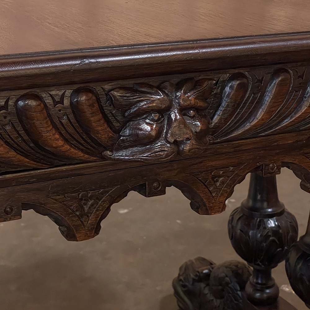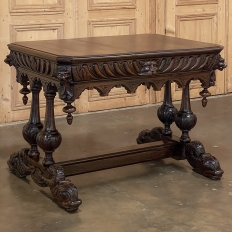 Sale19th Century French Renaissance Writing Table ~ Desk is an ode to a bygone era before the digital age, yet can serve as a splendid end table, library table or laptop desk with aplomb! Hand-crafted from solid oak, it features mitered corners which present no sharp edges, and is finished all around for placement anywhere one desires. Elongated repeating egg design covers the apron, interrupted by lion's heads on the mitered corners and at the center of the full-width drawer facade. Accolade forms with triangular rosettes adorn the bottom of the entire apron, with acorn pendant finials on each corner under the lions' heads. Support is provided by two pair of carved urn pediments, which are mounted upon a Renaissance-inspired "H" structure that consists of a molded trestle that connects outward-facing dolphins, sculpted with particular artistry, to form the feet.