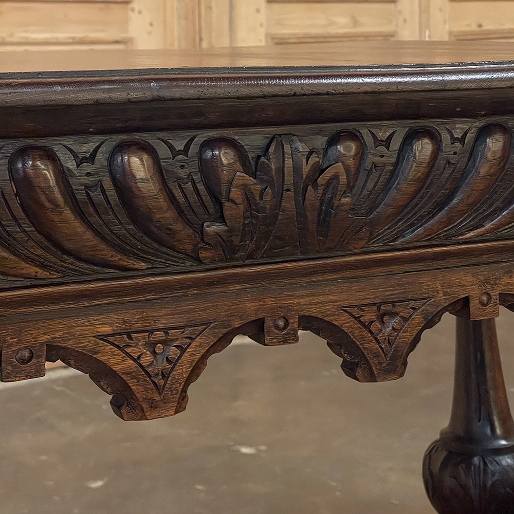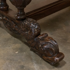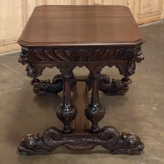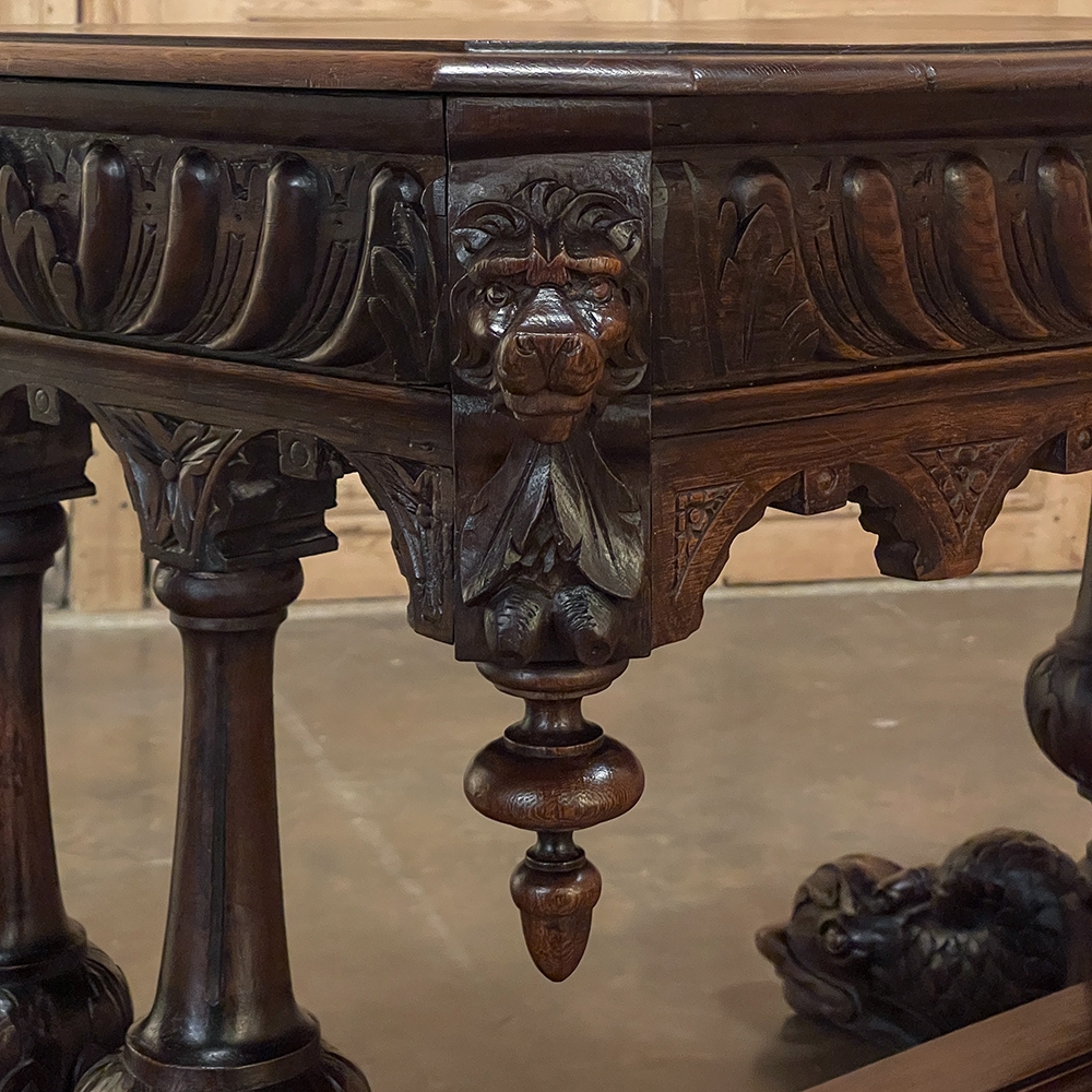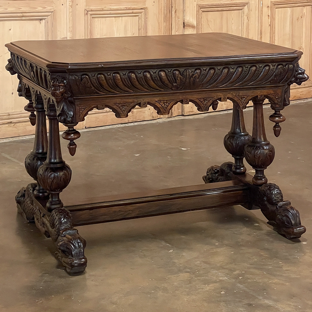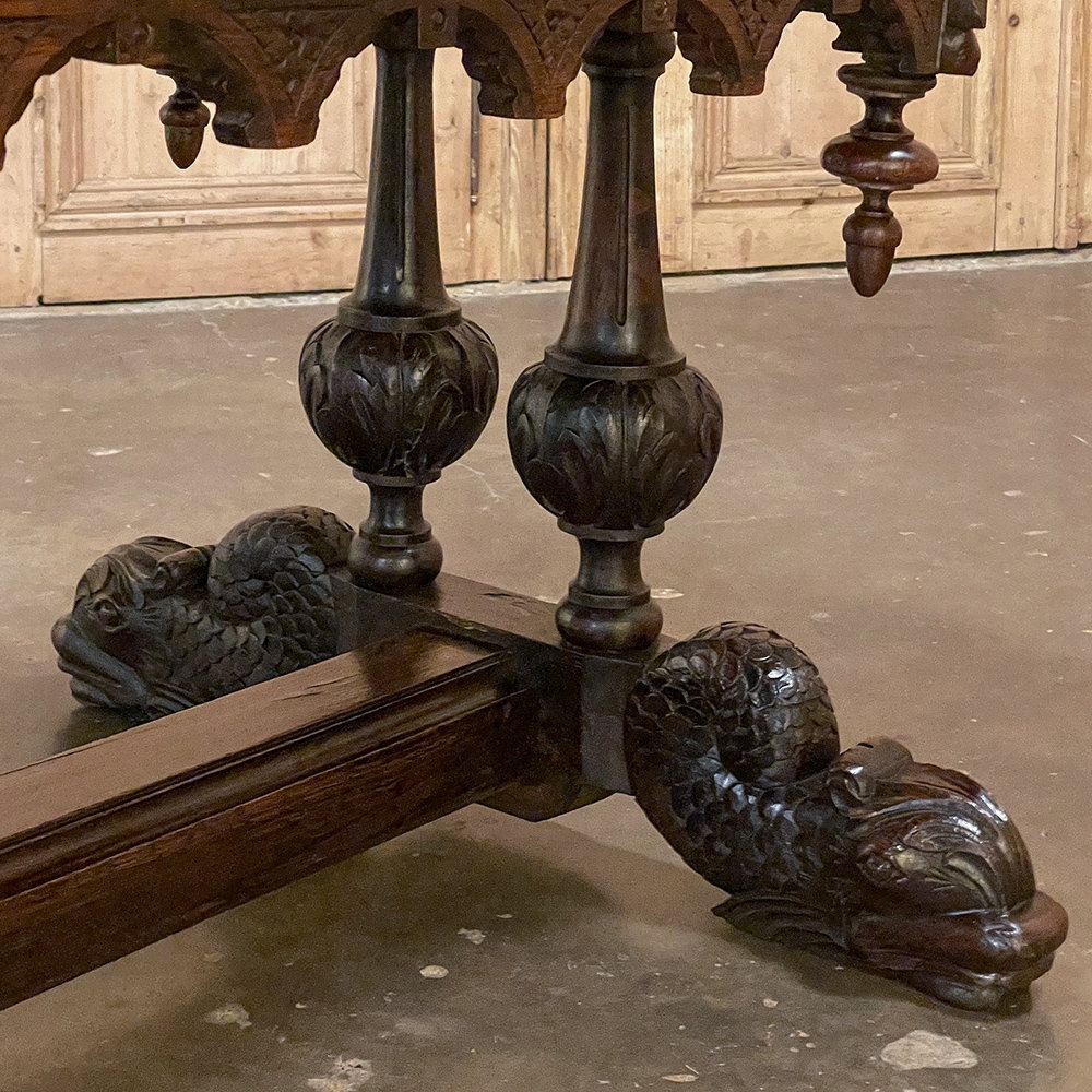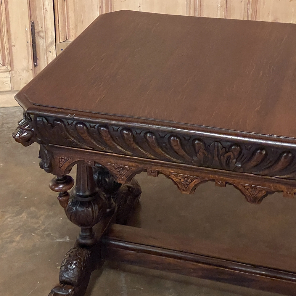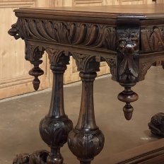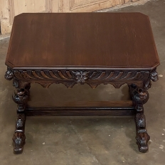 Sale19th Century French Renaissance Writing Table ~ Desk is an ode to a bygone era before the digital age, yet can serve as a splendid end table, library table or laptop desk with aplomb! Hand-crafted from solid oak, it features mitered corners which present no sharp edges, and is finished all around for placement anywhere one desires. Elongated repeating egg design covers the apron, interrupted by lion's heads on the mitered corners and at the center of the full-width drawer facade. Accolade forms with triangular rosettes adorn the bottom of the entire apron, with acorn pendant finials on each corner under the lions' heads. Support is provided by two pair of carved urn pediments, which are mounted upon a Renaissance-inspired "H" structure that consists of a molded trestle that connects outward-facing dolphins, sculpted with particular artistry, to form the feet.
