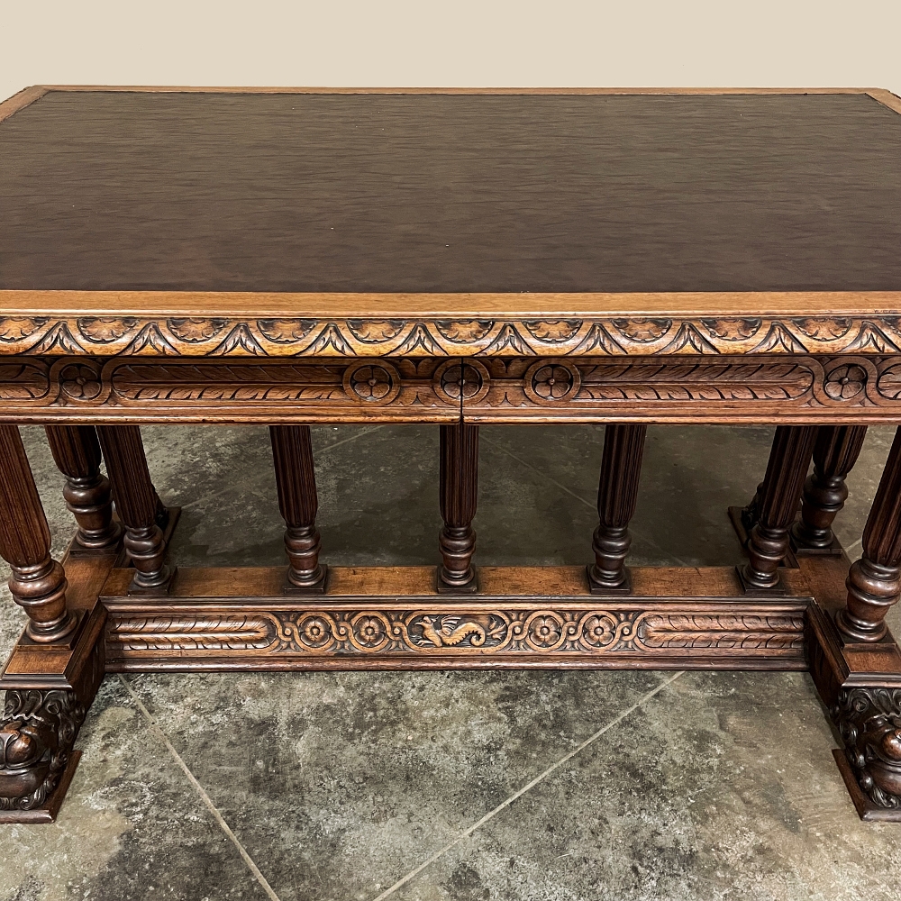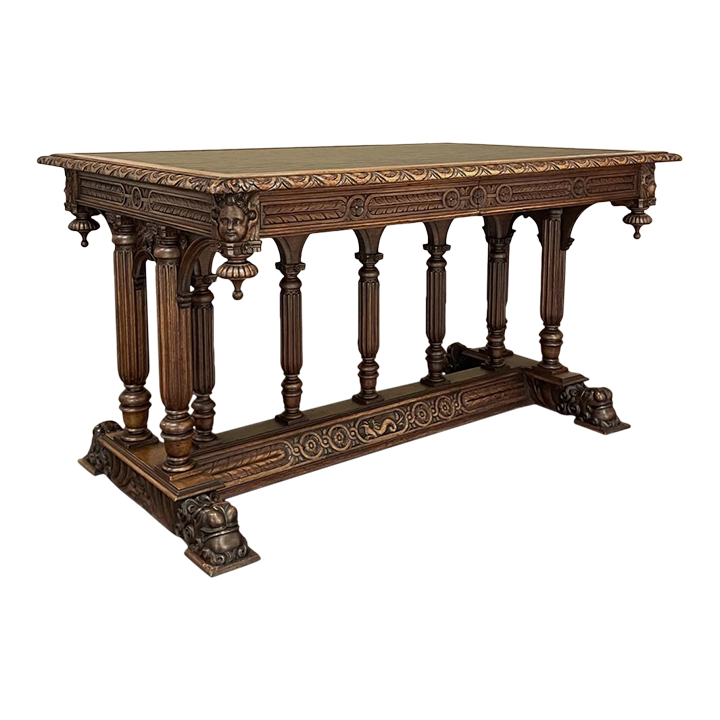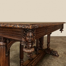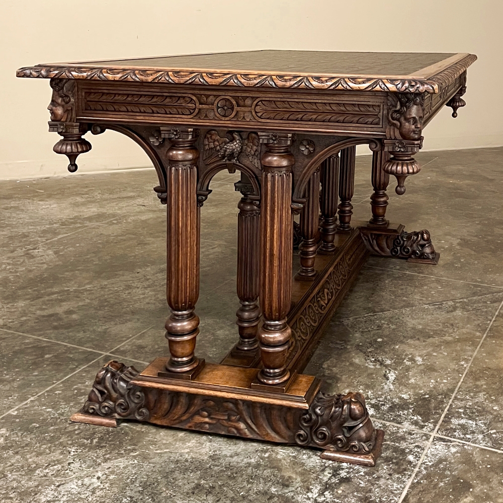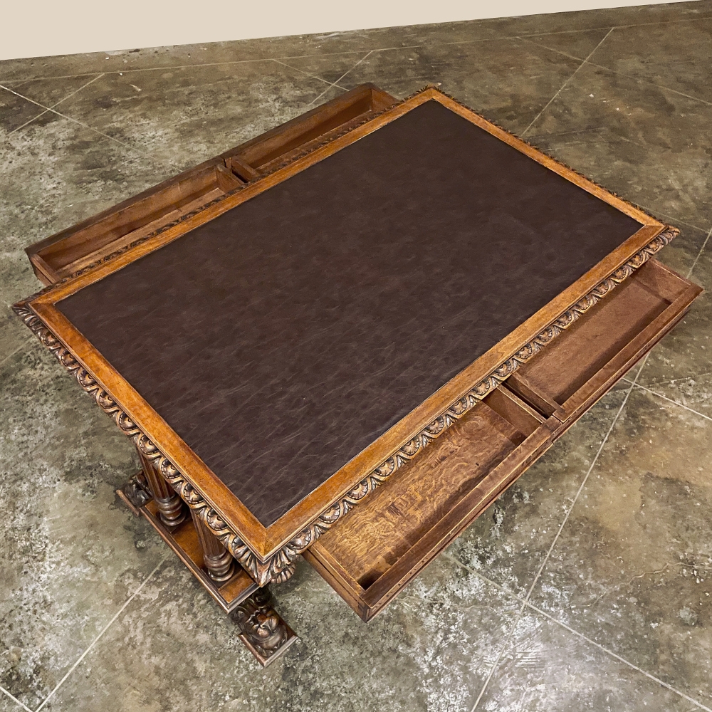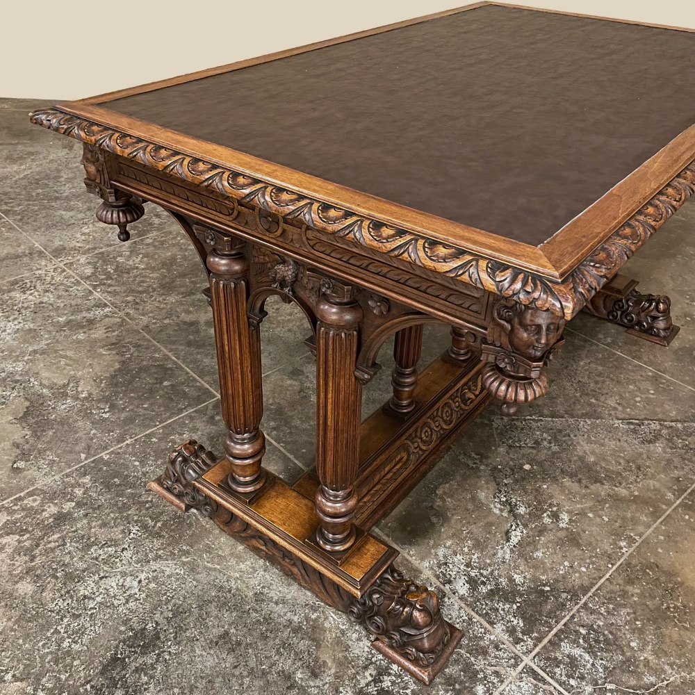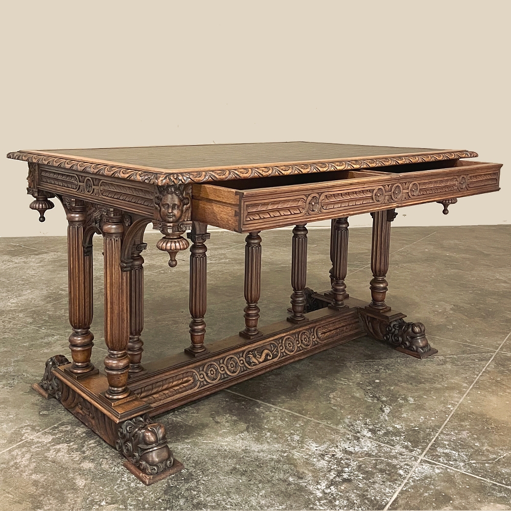 19th Century Napoleon III Walnut Partner's Desk with Faux Leather is a stunning transitional piece that embodies styles influenced by the three greatest eras of human endeavor! The uprights that provide support are all crafted with reeded center sections atop turned urn form pediments, and on the pairs on each end, are connected to the casework with buttresses. The smaller uprights across the centerline atop the "H" stretcher form a colonade in the Gothic tradition. The Renaissance is also represented, with carved angels on each corner, a Phoenix in full relief on each side, and a gryffin on the stretcher flanked by Greek coin which is framed by fletching, as examples of the neoclassical influence. Smiling lions are carved like busts at each foot for a whimsical effect. Above, each carved angel on the corner is finished with a carved pendant finial, and in between on the long sides appear two drawers for a total of four drawers, with the facades carved with fletching and rosettes complementing the "H" stretcher motif below. The top is a luxurious faux leather surrounded by bold demilune edging all around, making this a spectacular example of the furniture crafter's art that can be placed anywhere in any room for maximum effect!