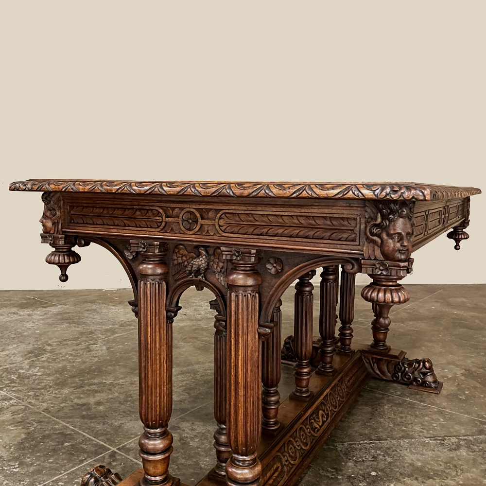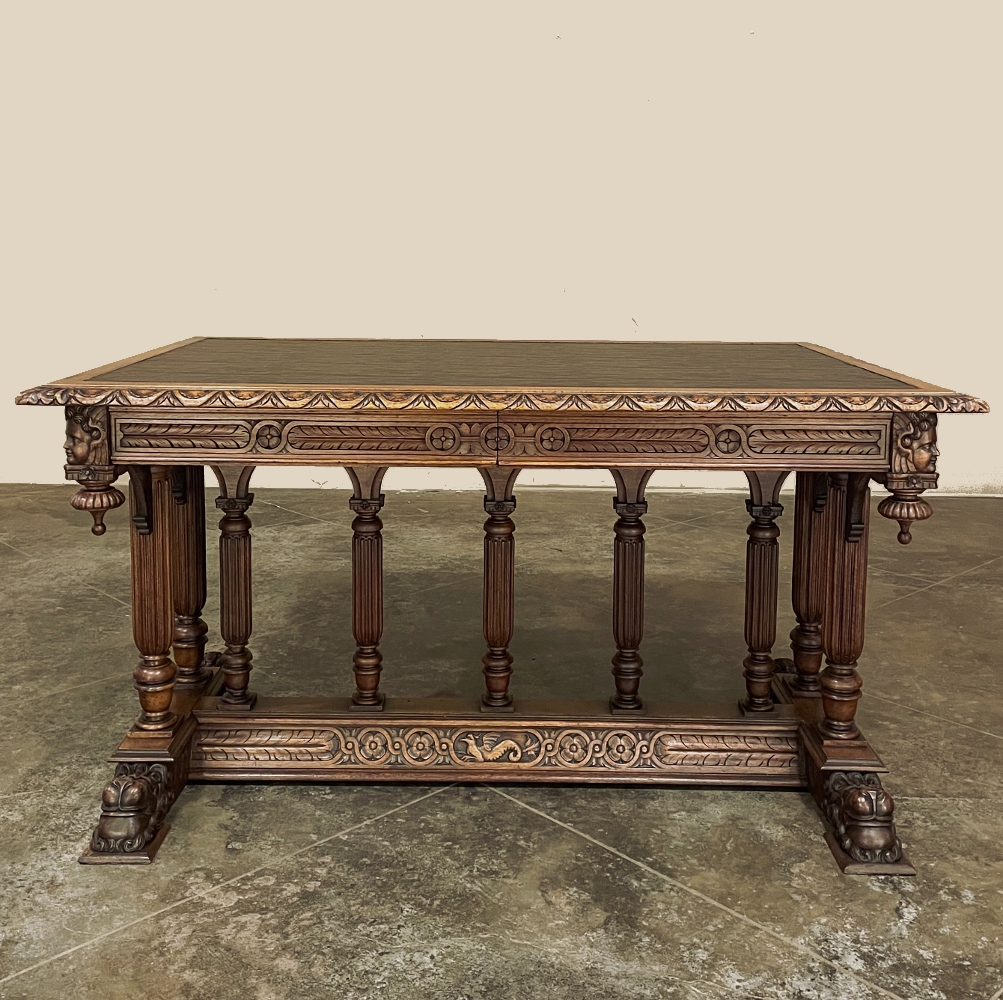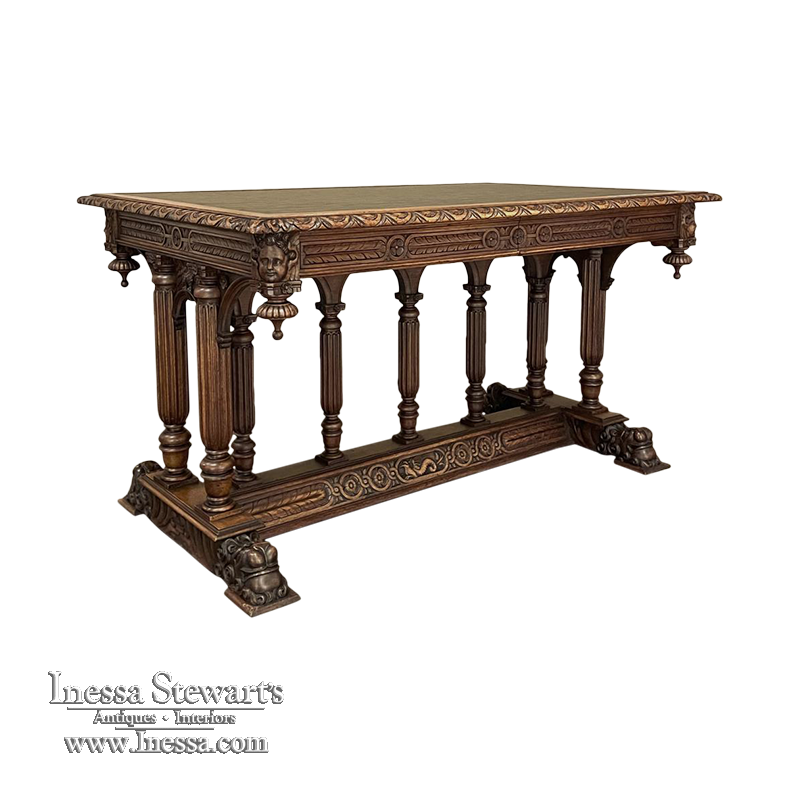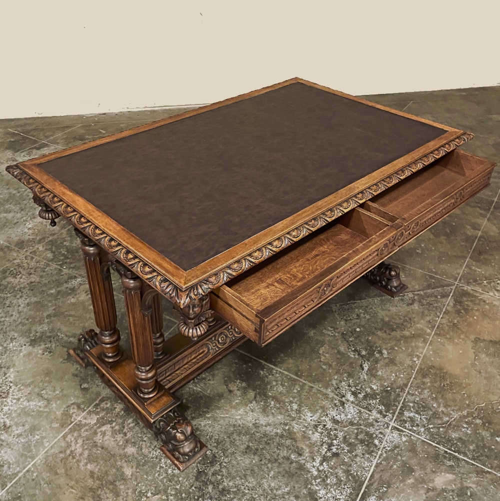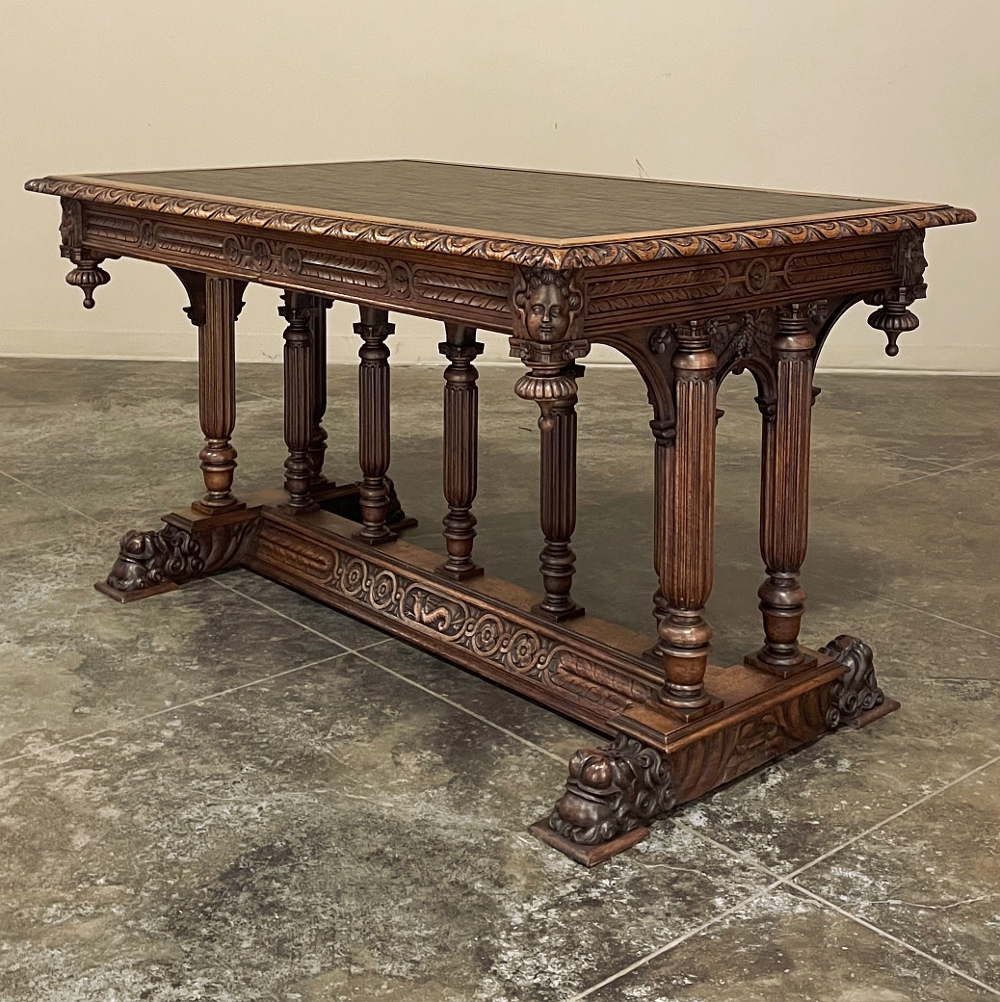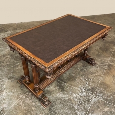 19th Century Napoleon III Walnut Partner's Desk with Faux Leather is a stunning transitional piece that embodies styles influenced by the three greatest eras of human endeavor! The uprights that provide support are all crafted with reeded center sections atop turned urn form pediments, and on the pairs on each end, are connected to the casework with buttresses. The smaller uprights across the centerline atop the "H" stretcher form a colonade in the Gothic tradition. The Renaissance is also represented, with carved angels on each corner, a Phoenix in full relief on each side, and a gryffin on the stretcher flanked by Greek coin which is framed by fletching, as examples of the neoclassical influence. Smiling lions are carved like busts at each foot for a whimsical effect. Above, each carved angel on the corner is finished with a carved pendant finial, and in between on the long sides appear two drawers for a total of four drawers, with the facades carved with fletching and rosettes complementing the "H" stretcher motif below. The top is a luxurious faux leather surrounded by bold demilune edging all around, making this a spectacular example of the furniture crafter's art that can be placed anywhere in any room for maximum effect!