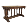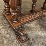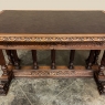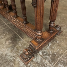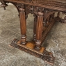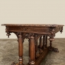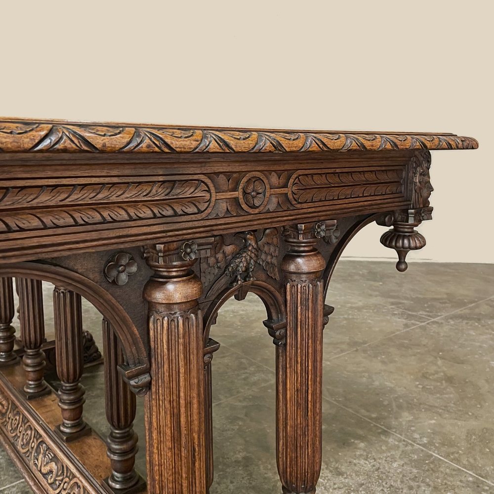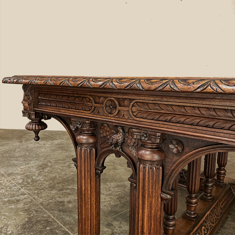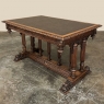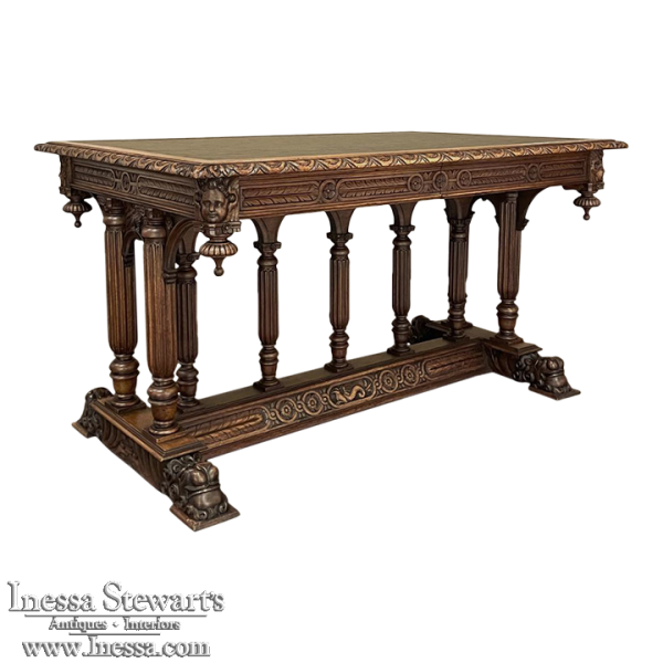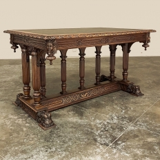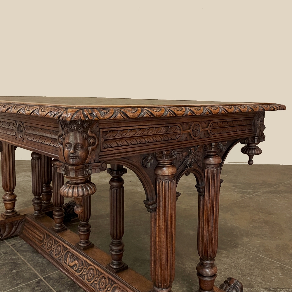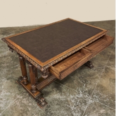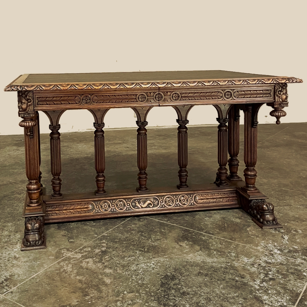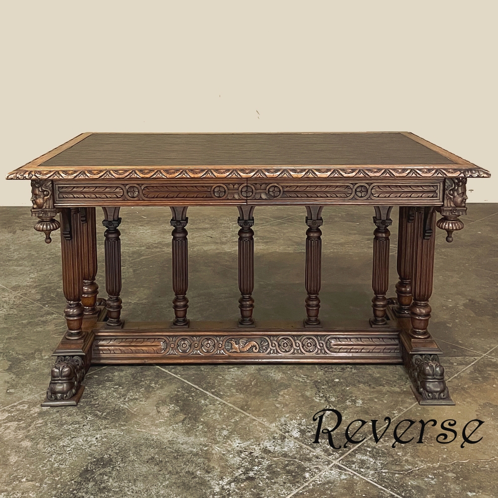 19th Century Napoleon III Walnut Partner's Desk with Faux Leather is a stunning transitional piece that embodies styles influenced by the three greatest eras of human endeavor! The uprights that provide support are all crafted with reeded center sections atop turned urn form pediments, and on the pairs on each end, are connected to the casework with buttresses. The smaller uprights across the centerline atop the "H" stretcher form a colonade in the Gothic tradition. The Renaissance is also represented, with carved angels on each corner, a Phoenix in full relief on each side, and a gryffin on the stretcher flanked by Greek coin which is framed by fletching, as examples of the neoclassical influence. Smiling lions are carved like busts at each foot for a whimsical effect. Above, each carved angel on the corner is finished with a carved pendant finial, and in between on the long sides appear two drawers for a total of four drawers, with the facades carved with fletching and rosettes complementing the "H" stretcher motif below. The top is a luxurious faux leather surrounded by bold demilune edging all around, making this a spectacular example of the furniture crafter's art that can be placed anywhere in any room for maximum effect!