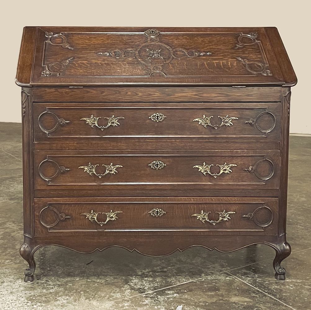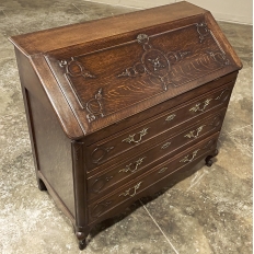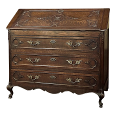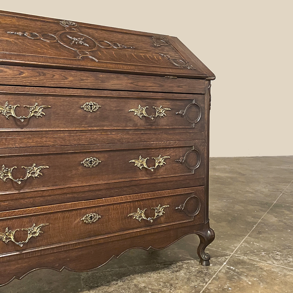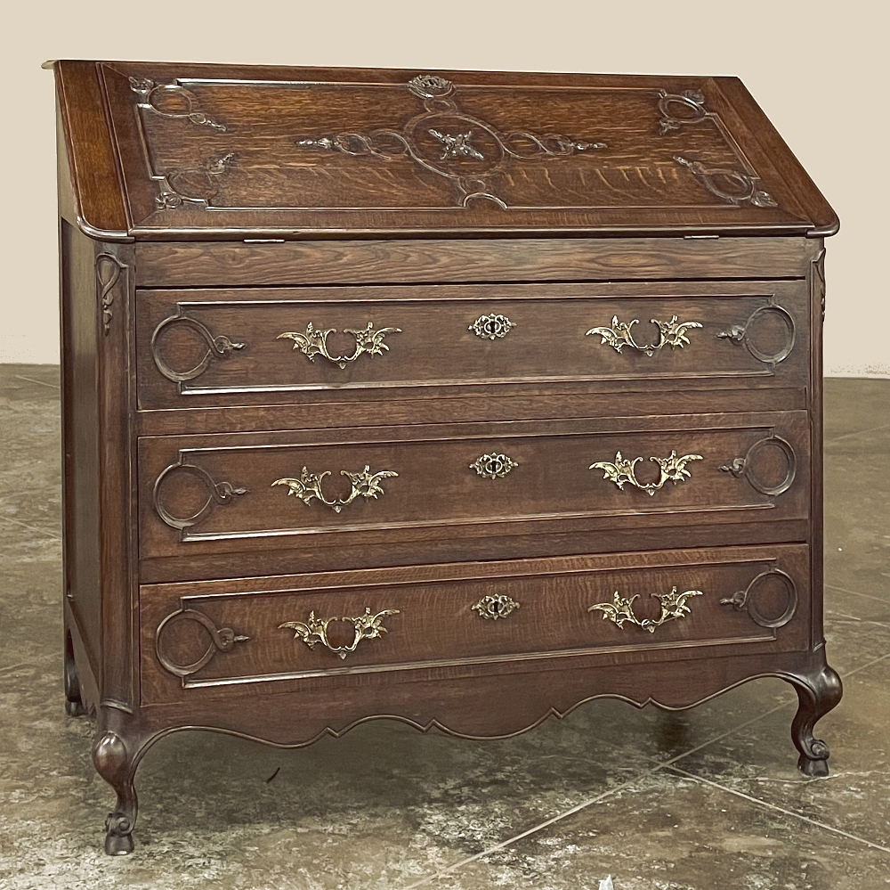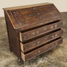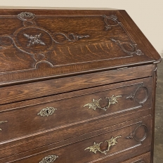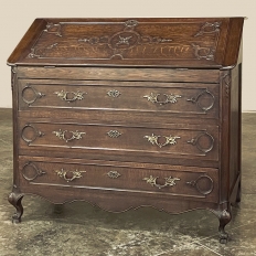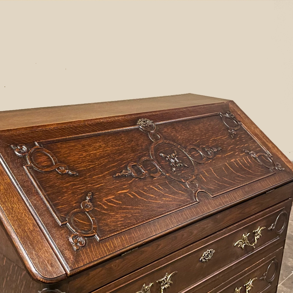 Antique Country French Oak Secretary is a superb example of this most efficient form of cabinetry. Combining a chest of drawers with a desk, it works in any situation where efficiency is paramount. Hand-crafted from solid oak, the slant front with carved bas relief embellishment opens up to be supported by two brass chains, and reveals a sizeable work surface, cubby holes and two drawers with brass knobs. The three full width drawers feature complementary bas relief carvings as well as elaborately cast brass pulls and key guards. A contoured apron and scrolled legs complete the look.