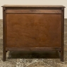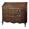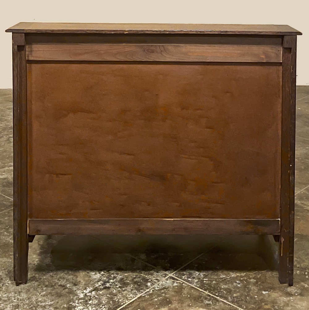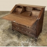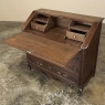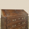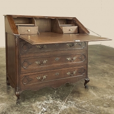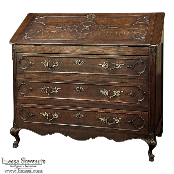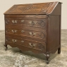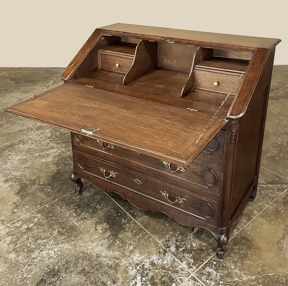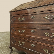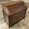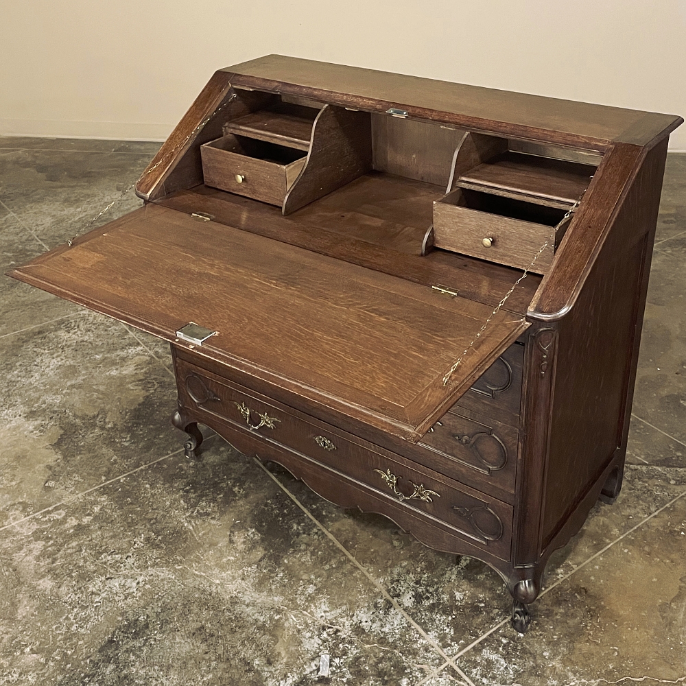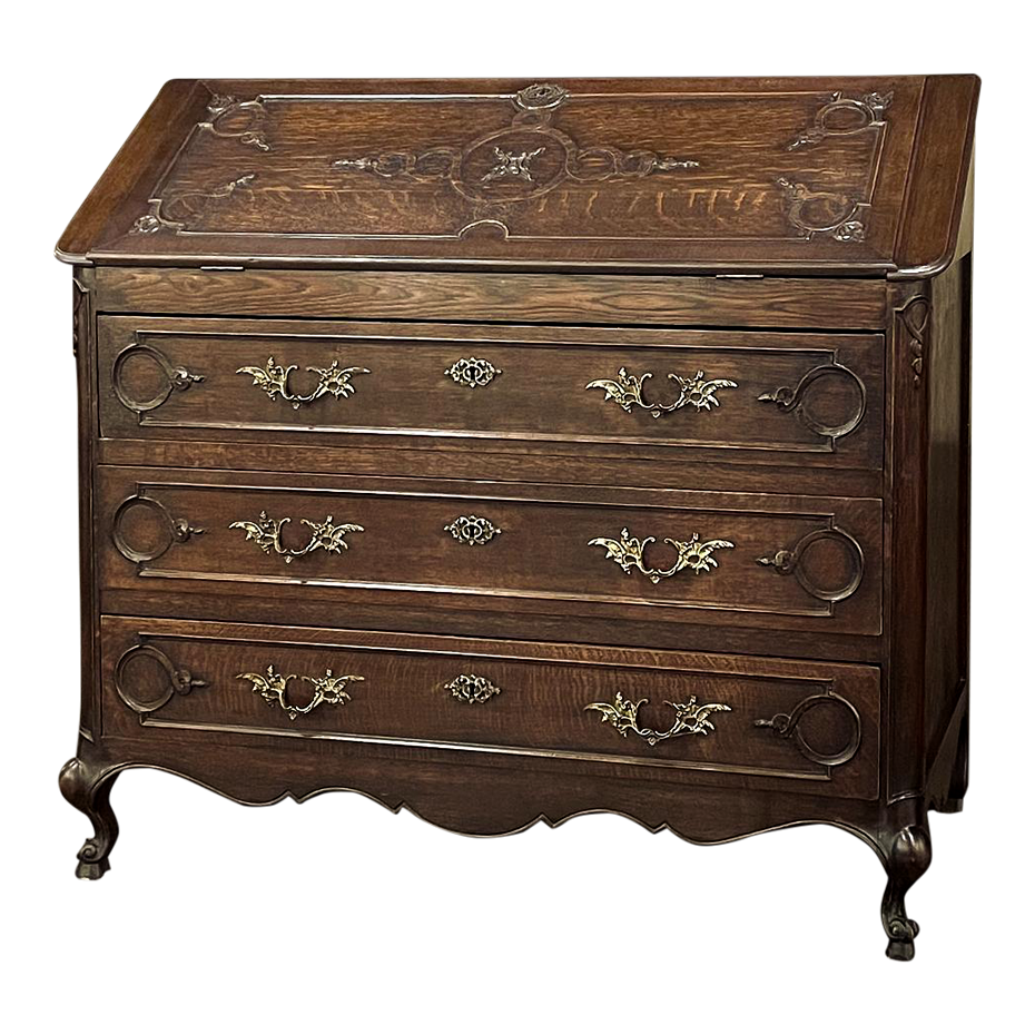 Antique Country French Oak Secretary is a superb example of this most efficient form of cabinetry. Combining a chest of drawers with a desk, it works in any situation where efficiency is paramount. Hand-crafted from solid oak, the slant front with carved bas relief embellishment opens up to be supported by two brass chains, and reveals a sizeable work surface, cubby holes and two drawers with brass knobs. The three full width drawers feature complementary bas relief carvings as well as elaborately cast brass pulls and key guards. A contoured apron and scrolled legs complete the look.