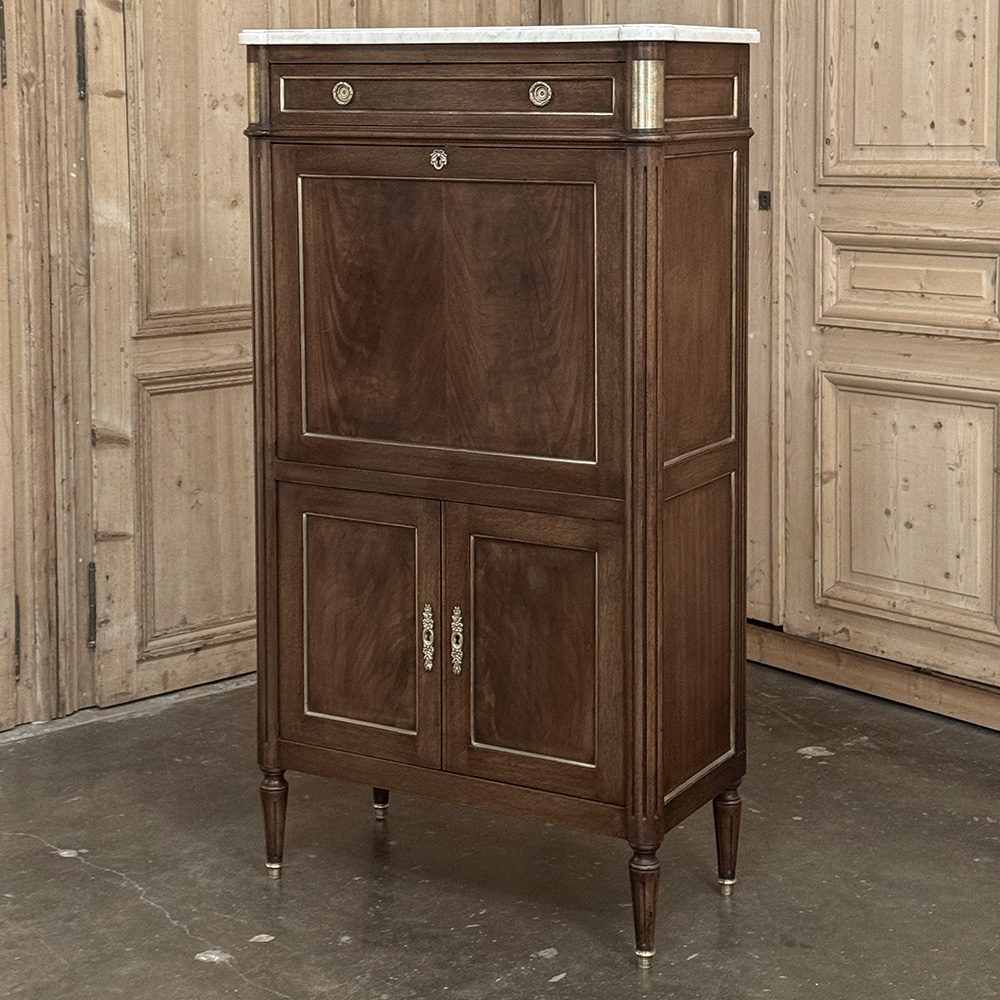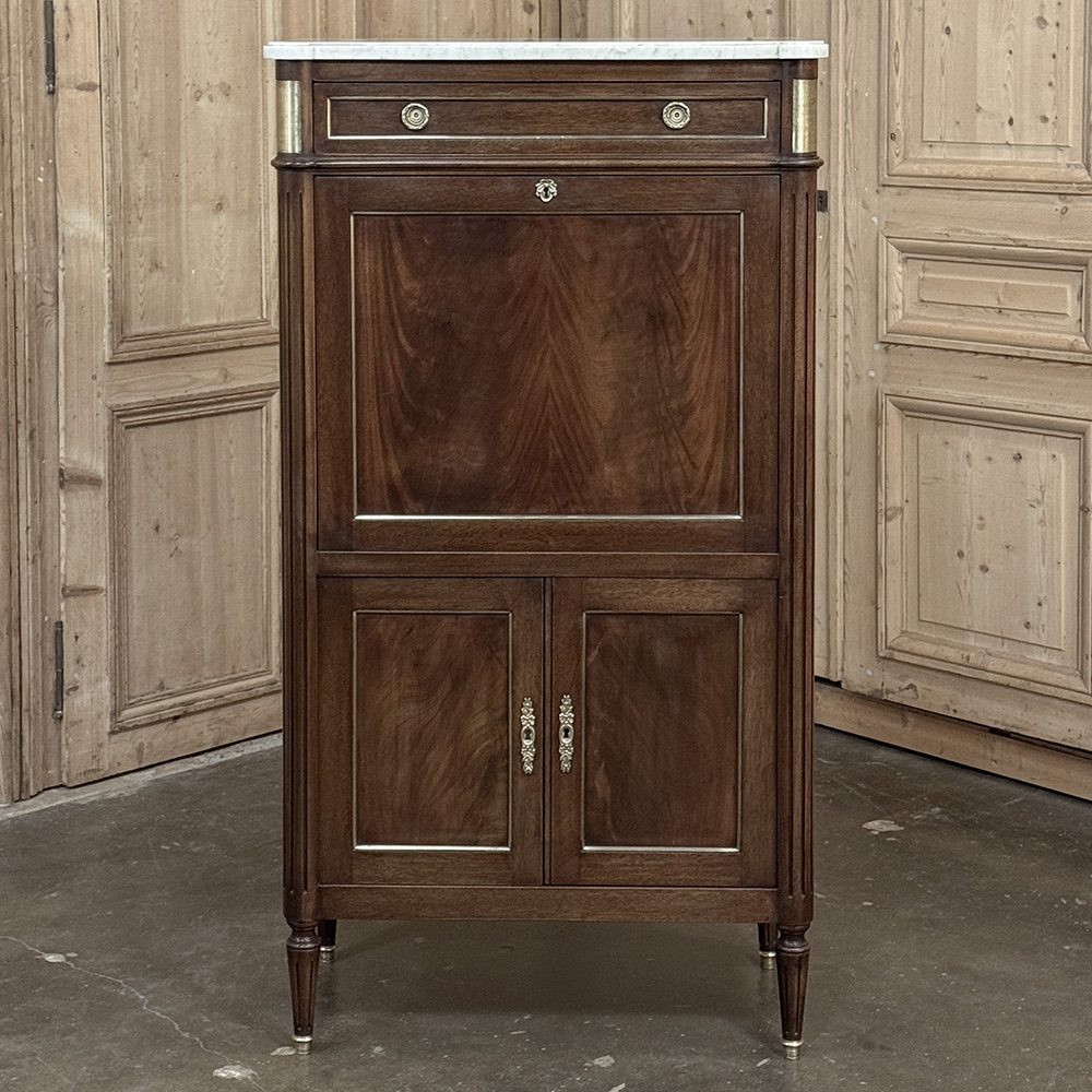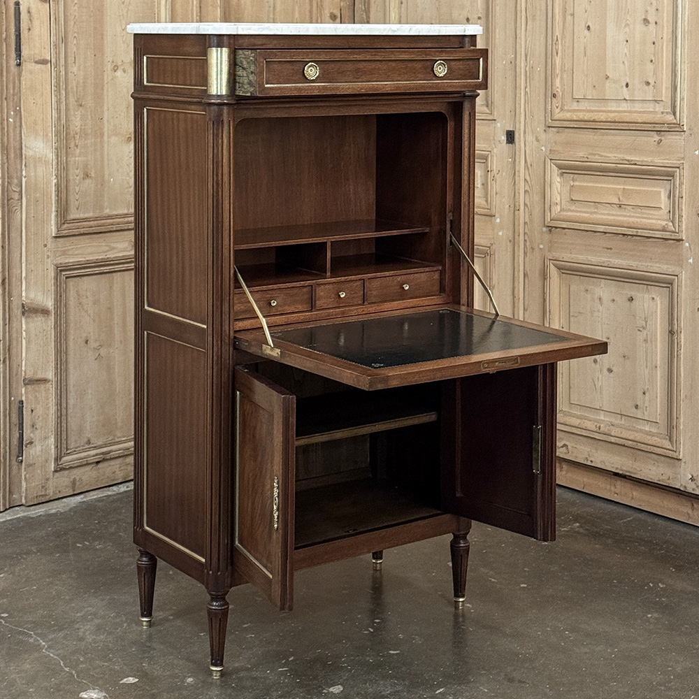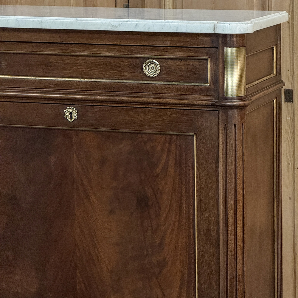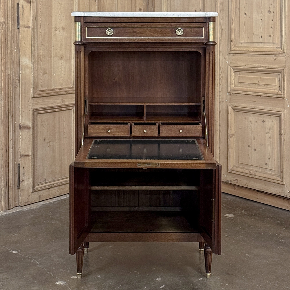 Antique French Louis XVI Mahogany Secretary ~ Cabinet represents a unique variation on a design that serves a variety of functions, all executed in neoclassical style! Crafted from imported mahogany, it features a rectilinear design with panels enhanced by gold quarter round molding on all three sides. The main facade is framed by 3/4 fluted columns for corner posts, the top of which has a jaloused cap and the bottom are legs tipped in brass caps. The lower two doors are fitted with finely detailed cast key guards and open to reveal surprising shelved storage. Just above, the main cabinet door with cast brass key guard drops down with brass supports to reveal an embossed leather writing surface, small drawers fitted with brass knobs, two cubby holes and a compartment. Above is a full width drawer fitted with brass ring pulls with guards, and to top it off, beveled Carrara marble contoured to follow the casework lines below. The ideal home office or student's desk!
