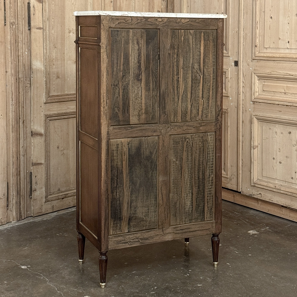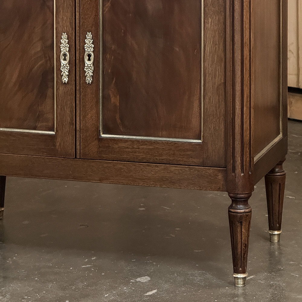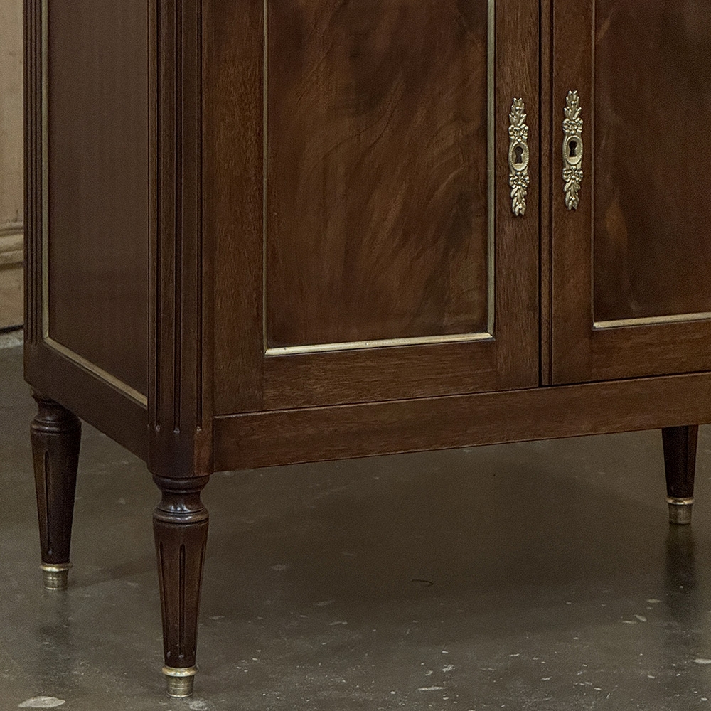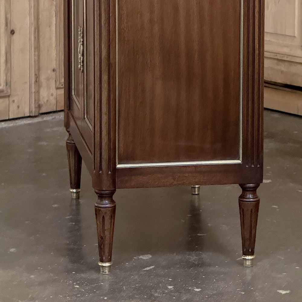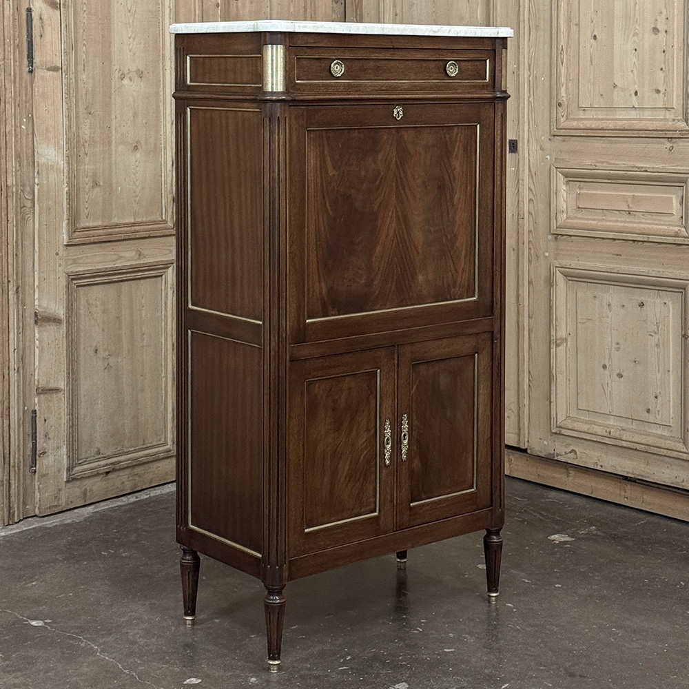 Antique French Louis XVI Mahogany Secretary ~ Cabinet represents a unique variation on a design that serves a variety of functions, all executed in neoclassical style! Crafted from imported mahogany, it features a rectilinear design with panels enhanced by gold quarter round molding on all three sides. The main facade is framed by 3/4 fluted columns for corner posts, the top of which has a jaloused cap and the bottom are legs tipped in brass caps. The lower two doors are fitted with finely detailed cast key guards and open to reveal surprising shelved storage. Just above, the main cabinet door with cast brass key guard drops down with brass supports to reveal an embossed leather writing surface, small drawers fitted with brass knobs, two cubby holes and a compartment. Above is a full width drawer fitted with brass ring pulls with guards, and to top it off, beveled Carrara marble contoured to follow the casework lines below. The ideal home office or student's desk!