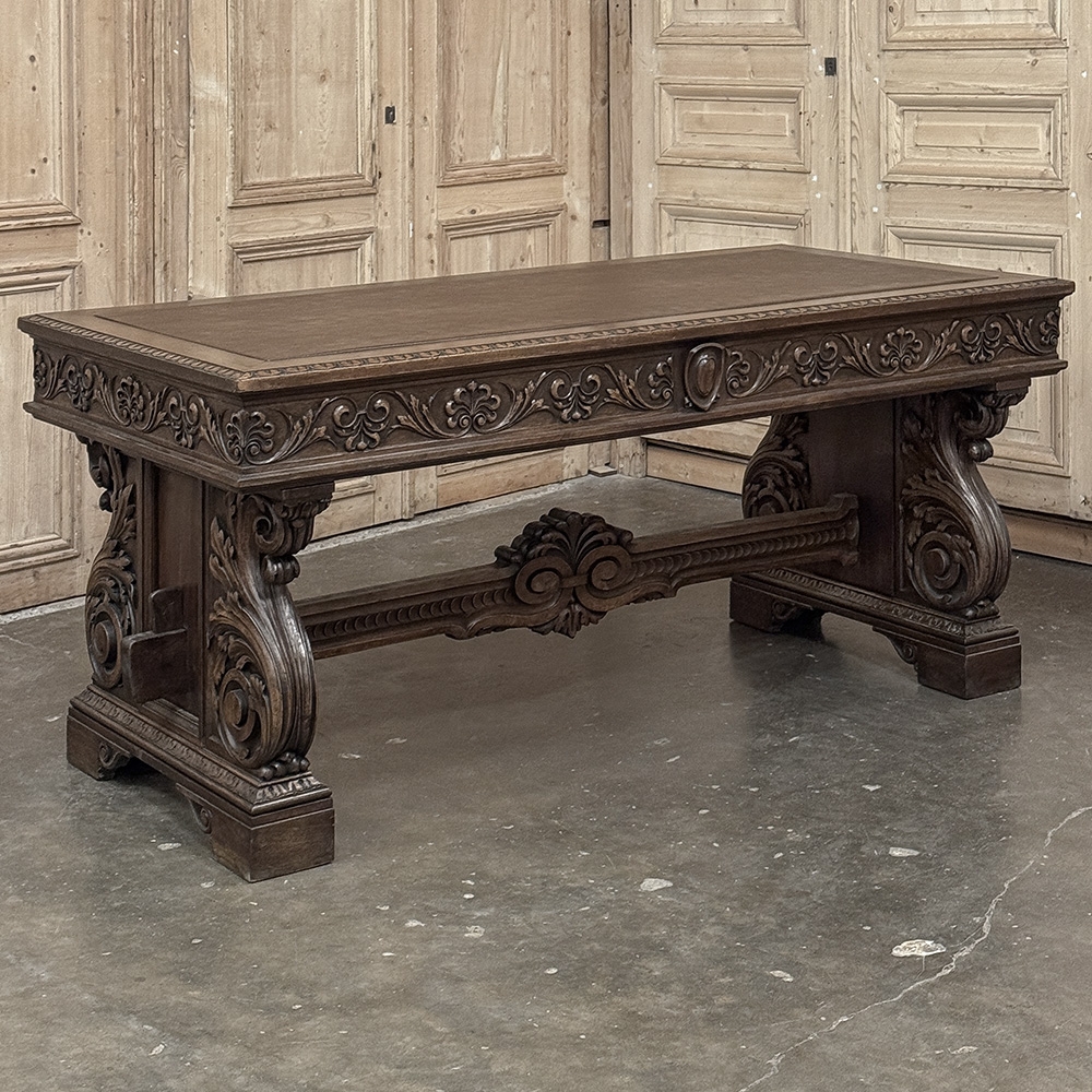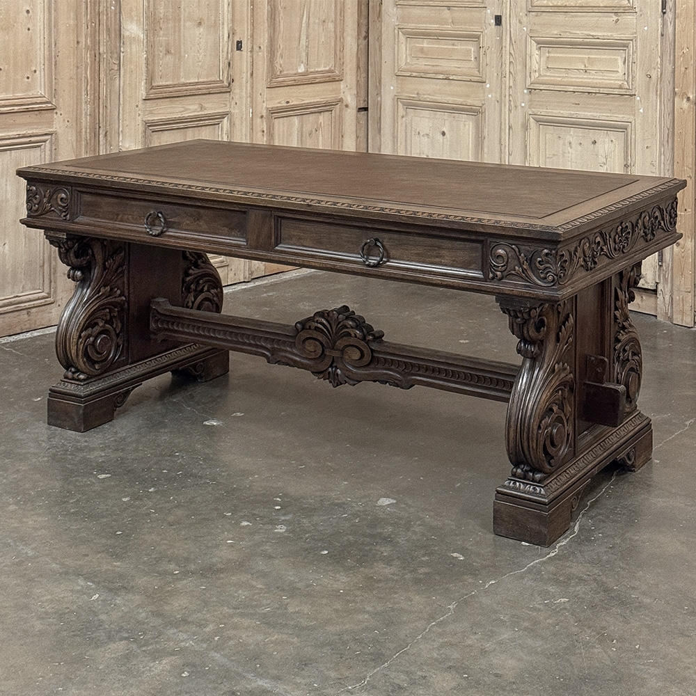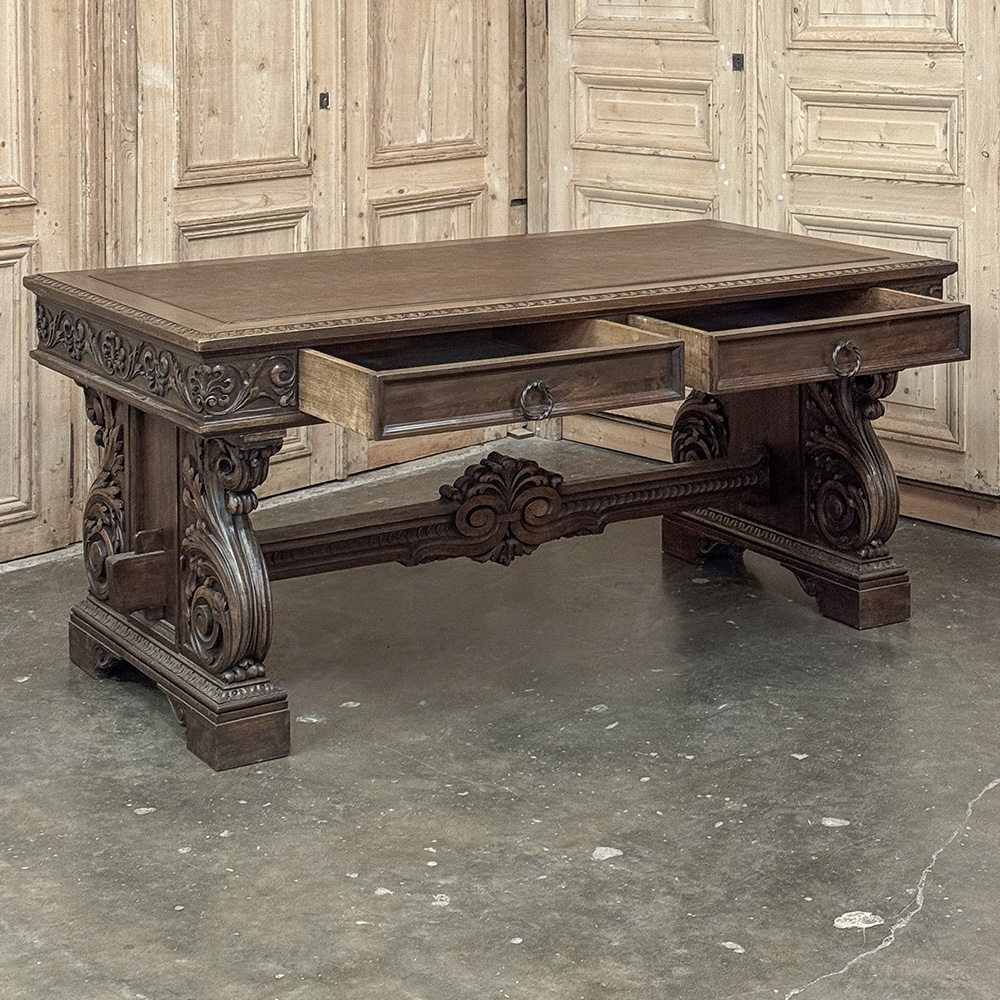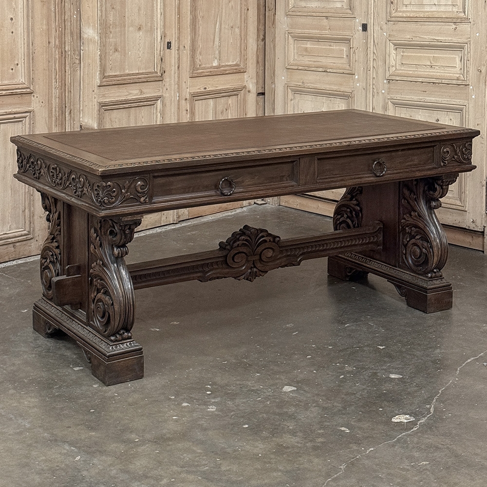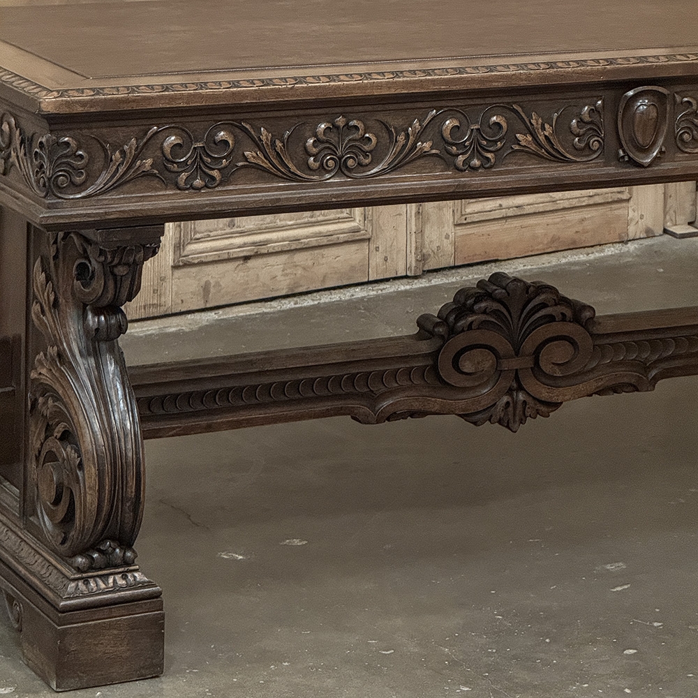 Antique Italian Renaissance Executive Desk with Faux Leather is the perfect choice for a timeless Old World decor. Hand-carved in walnut, it features a beveled edge all around the newly installed faux leather top, with intricate foliate designs on the entire apron all around. This makes the piece a great choice for placement in the center of the room if so desired. Two spacious drawers fitted with steel ring pulls provide plenty of storage. The most eye-catching feature, however, is the pair of supports on each end, elegantly carved and embellished by a true master wood sculptor, with acanthus leaf forms dominating the design. The supports are connected with a carved trestle that is actually mortised and shimmed in the traditional method dating back centuries. Truly a work designed to make your friends envious!
