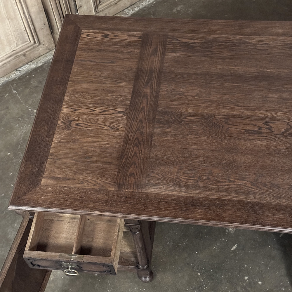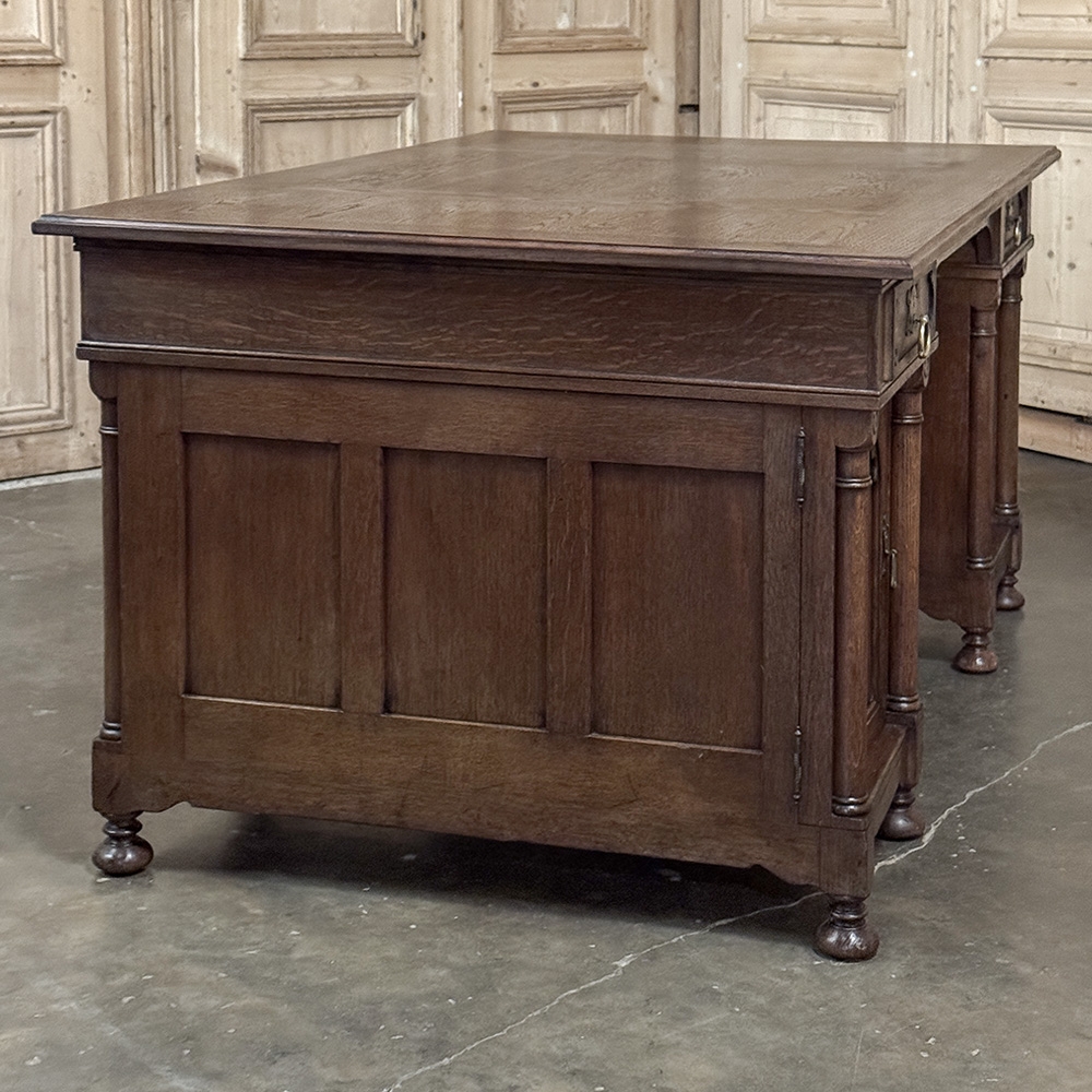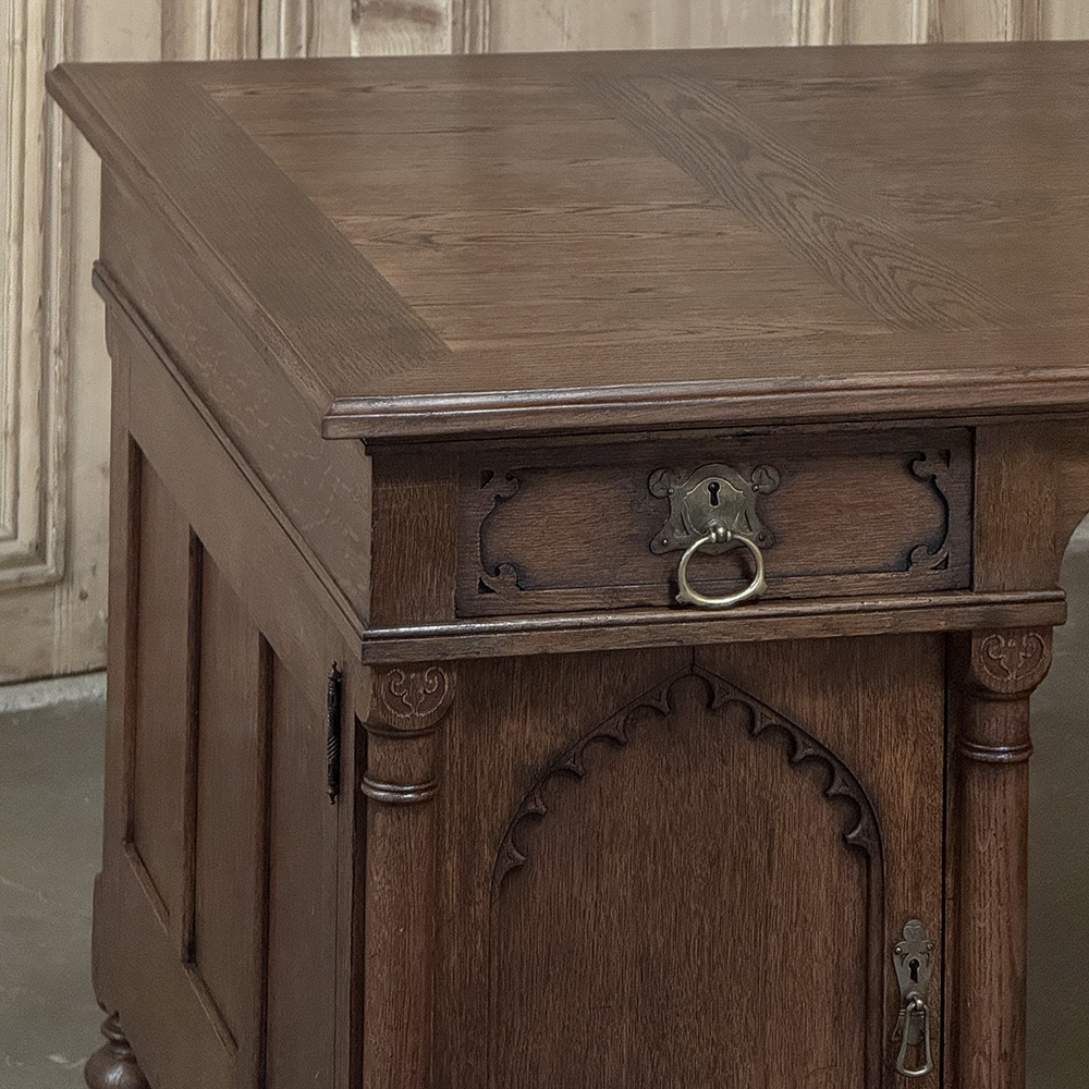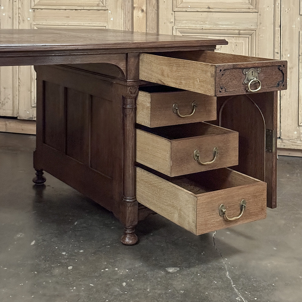 Mid-Century Neogothic Executive Desk by Jansen & Sons of Amsterdam is a splendid result of high-grade materials and expert craftsmanship producing heirloom-quality furnishings that can be enjoyed for generations! The tailored lines of this design show just a hint of the Gothic influence evident in the castellated arches of the doors and front panels, each flanked by a brace of half-columns topped with capitals carved with inverted fleurs de lys. The drawers above the "business" side of the desk continue the subtle design flavor with an elegant molding surrounding the drawer face which is centered with a highly stylized key guard with ring pull. Triple recessed panels appear on the outside and inside of the casework, with hinges mounted outboard so that the doors swing wide for easy access to the cabinet with shelf on the left, and concealed set of three drawers on the right, each fitted with brass bale pulls. A generously sized slightly arched knee hole with 26.5" clearance provides ample room, and the entire affair is mounted atop eight teardrop shaped bun feet.